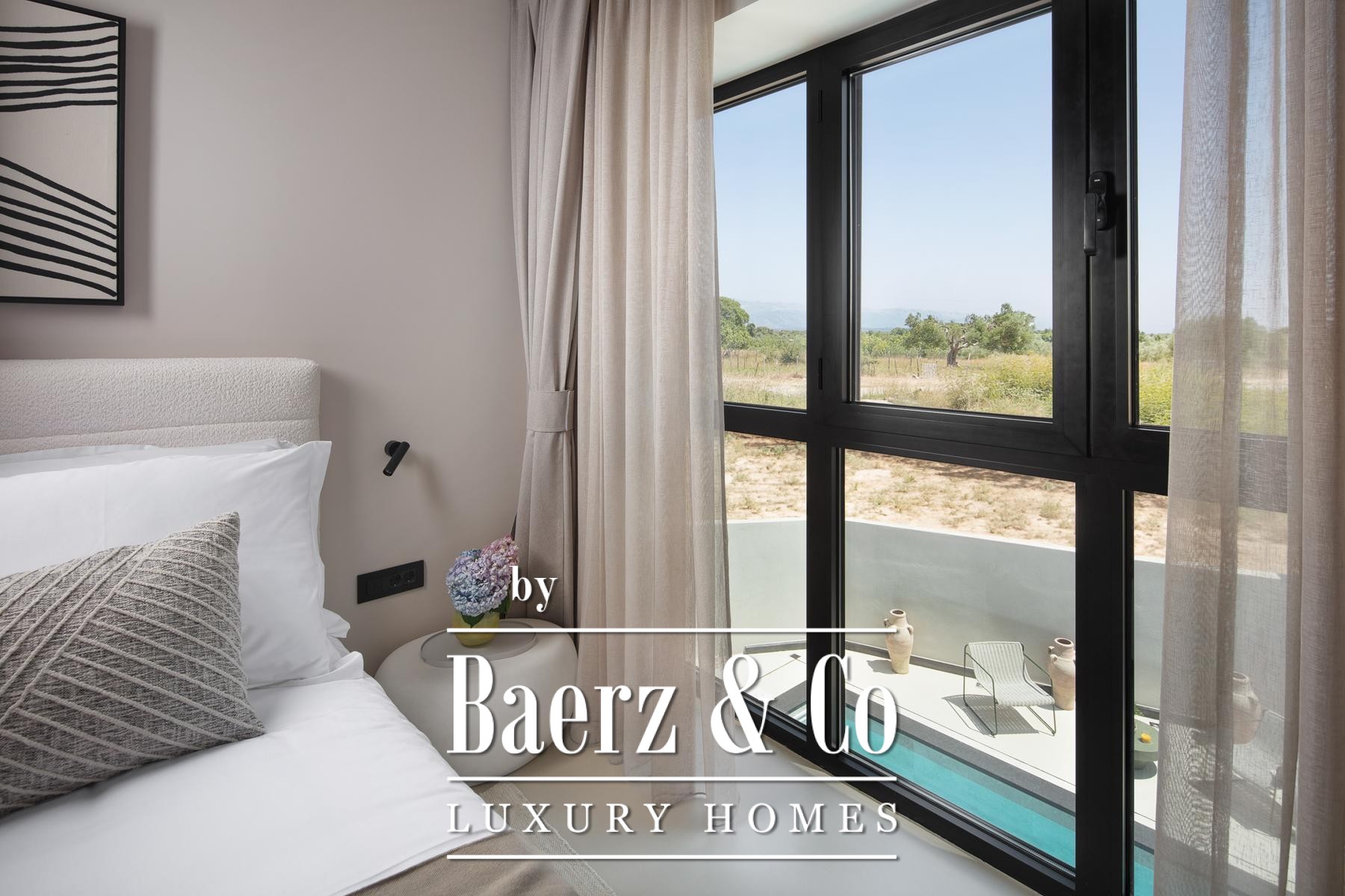 The layout flows across two levels. On the ground floor, an open living and dining area integrates seamlessly with the kitchen, leading to a spacious terrace designed for quiet mornings or lively gatherings. Upstairs, three bedrooms and two bathrooms provide ample retreat, while an additional terrace offers open views across the landscape.