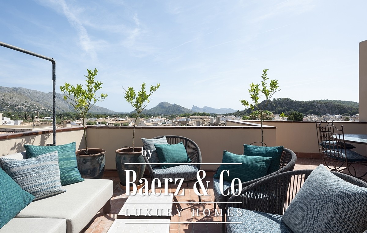 A large rooftop terrace opens to sweeping views across Pollensa’s rooftops to the Tramuntana mountains, ideal for gathering or quiet reflection. Designer furnishings, vintage pieces, and art objects by renowned artists are included, introducing the next owner to a life of subtle distinction. Completing this offering is a rare garage, an invaluable amenity in the old town. For those considering a luxury townhouse for sale in Pollensa Old Town, this property pairs authenticity with flexibility, ready to welcome its next chapter.