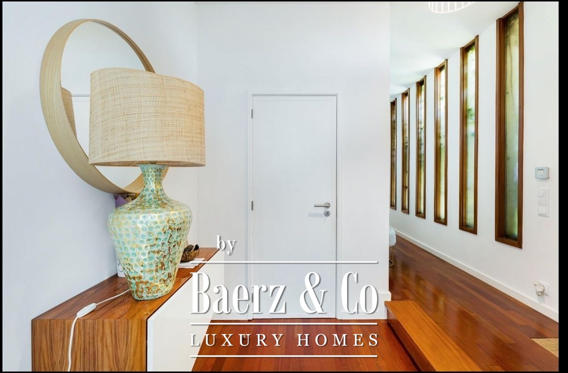 Engineered for comfort and efficiency, the residence incorporates air conditioning, solar panels, electric shutters, suspended sanitary ware, and a heat pump. The open flow extends outdoors, where a 350 m² garden anchors a heated saltwater swimming pool, inviting year-round enjoyment a short walk from the Atlantic.