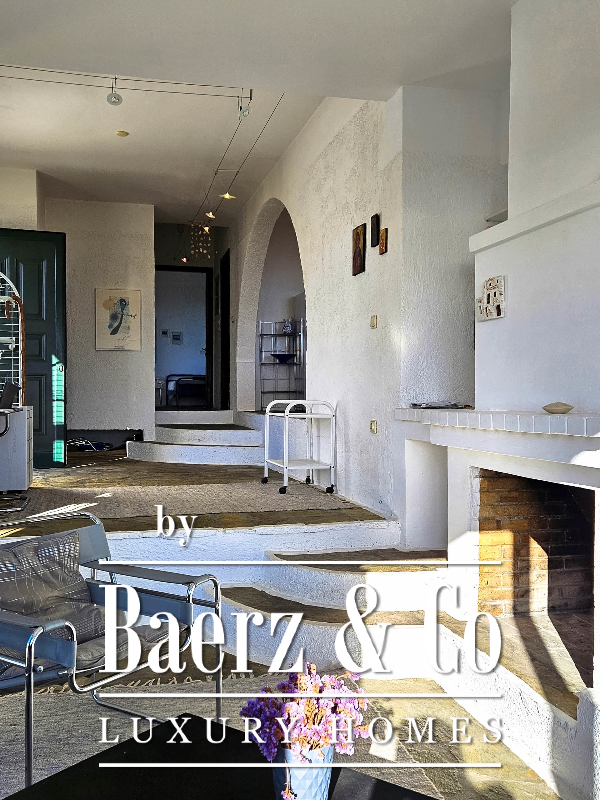 This detached house Portocheli is set within 5,800 m² of landscaped grounds, surrounded by lush greenery just 350 metres from the sea. The property spans 148 m² over two levels, shaped by Cycladic architectural lines, whitewashed walls, and cubic forms. Openings and spacious terraces orient the interiors toward unobstructed sea and panoramic views, bringing in clarity and light.