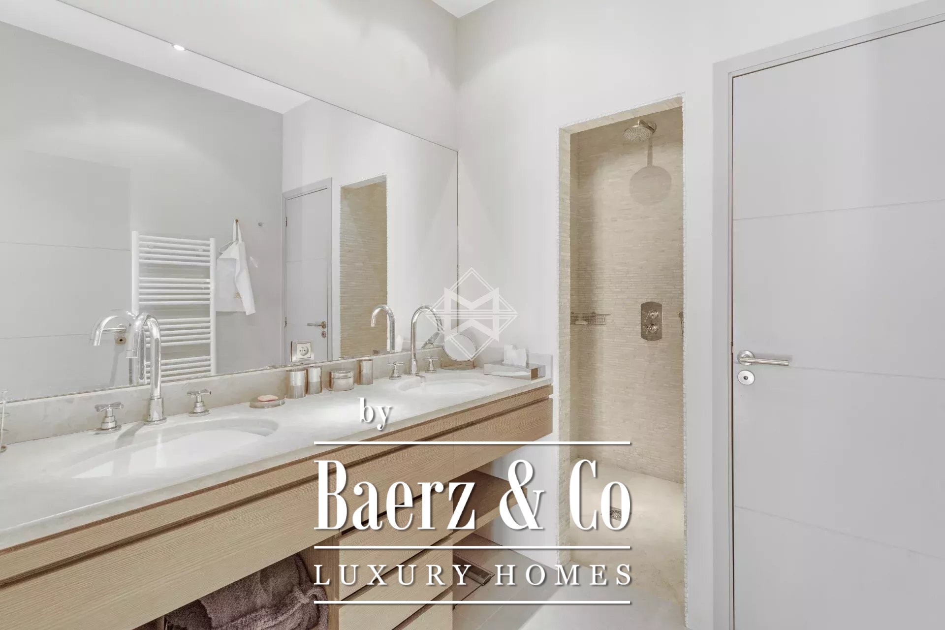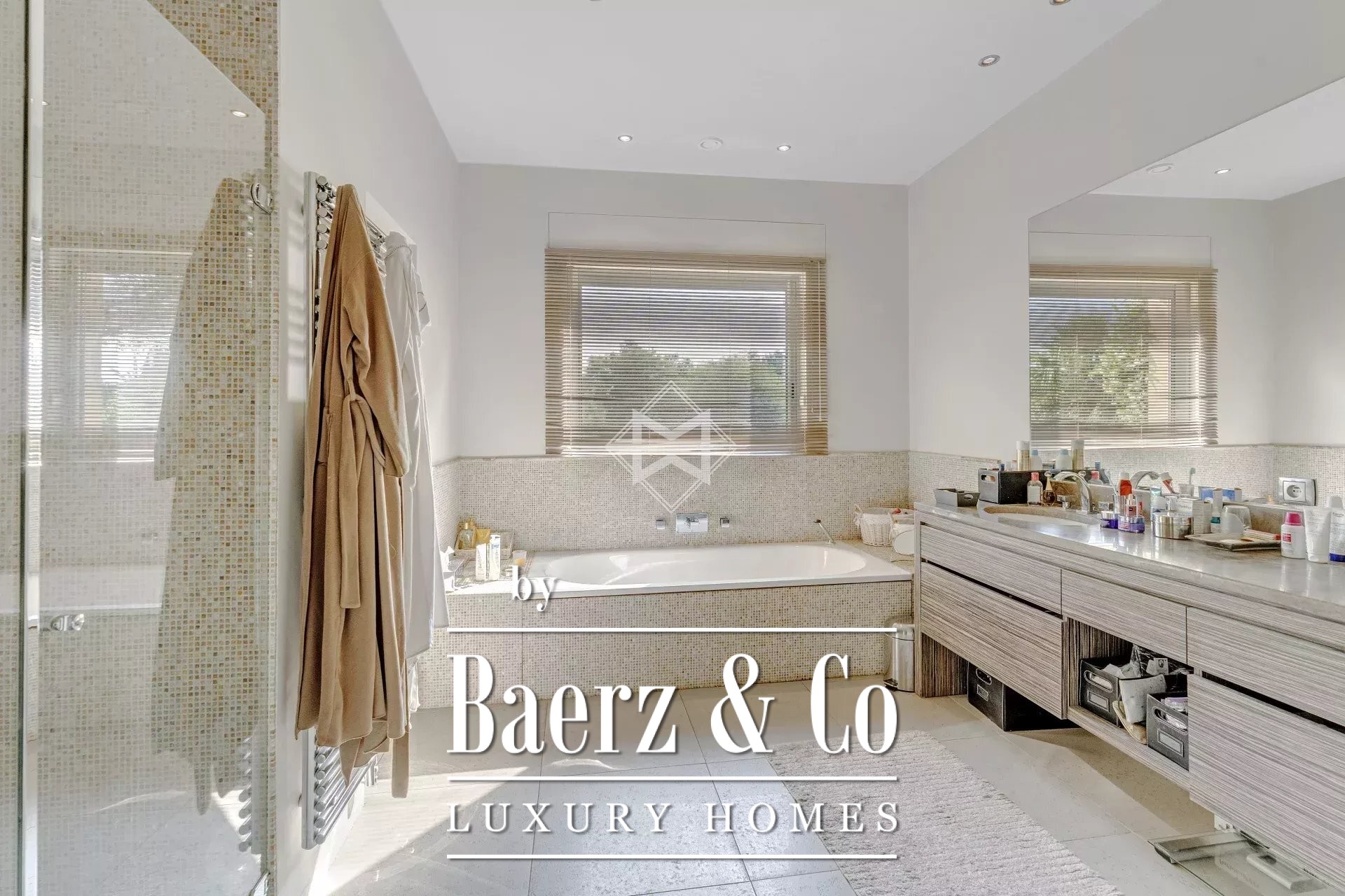 On the garden level, a garage and a laundry room add functional completeness. Garden views provide a continuous presence of nature, filtered through light reflected from the pool. Air-conditioning, a fireplace, double glazing, sliding windows, alarm system, and an electric gate ensure every aspect of convenience and security.