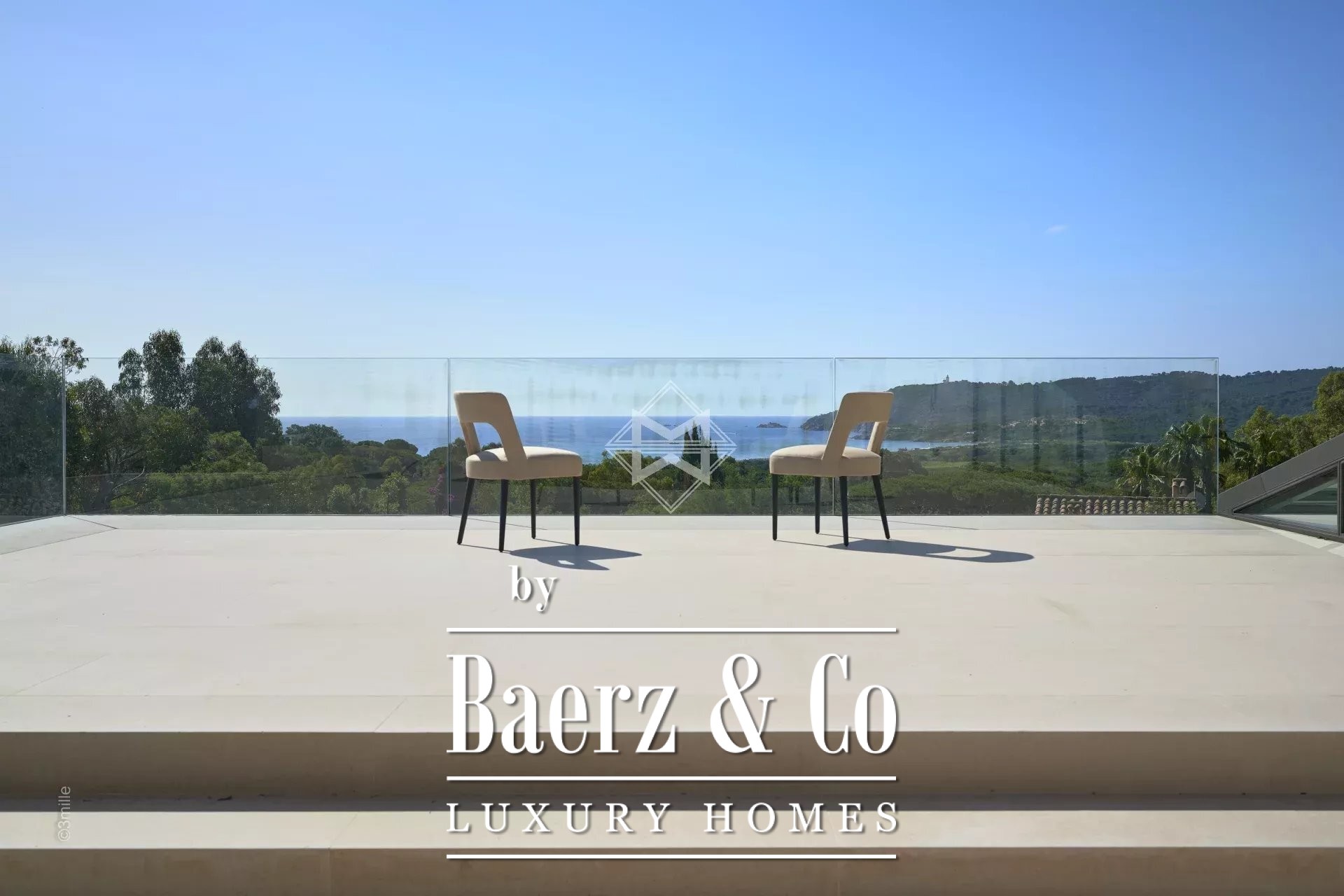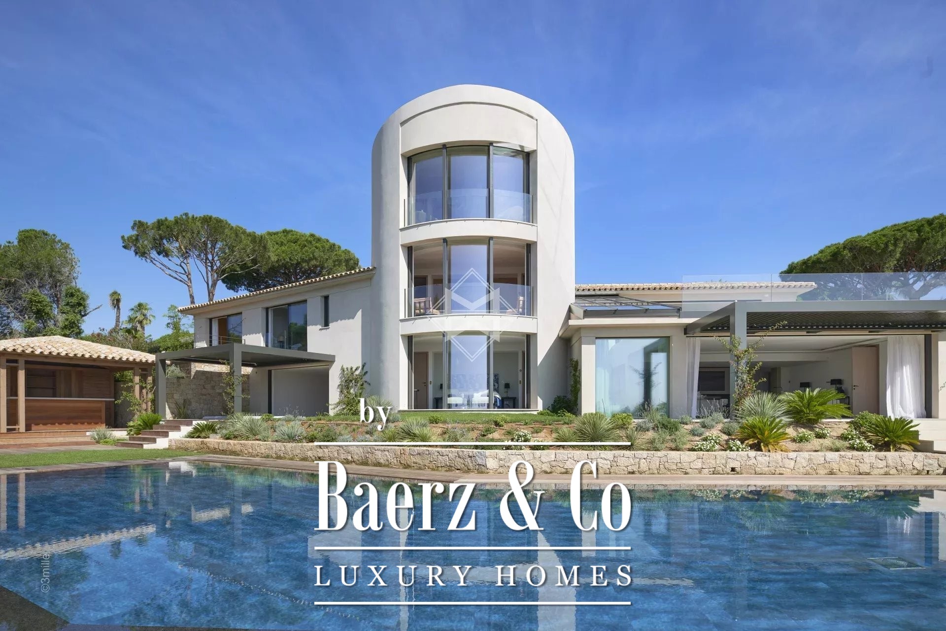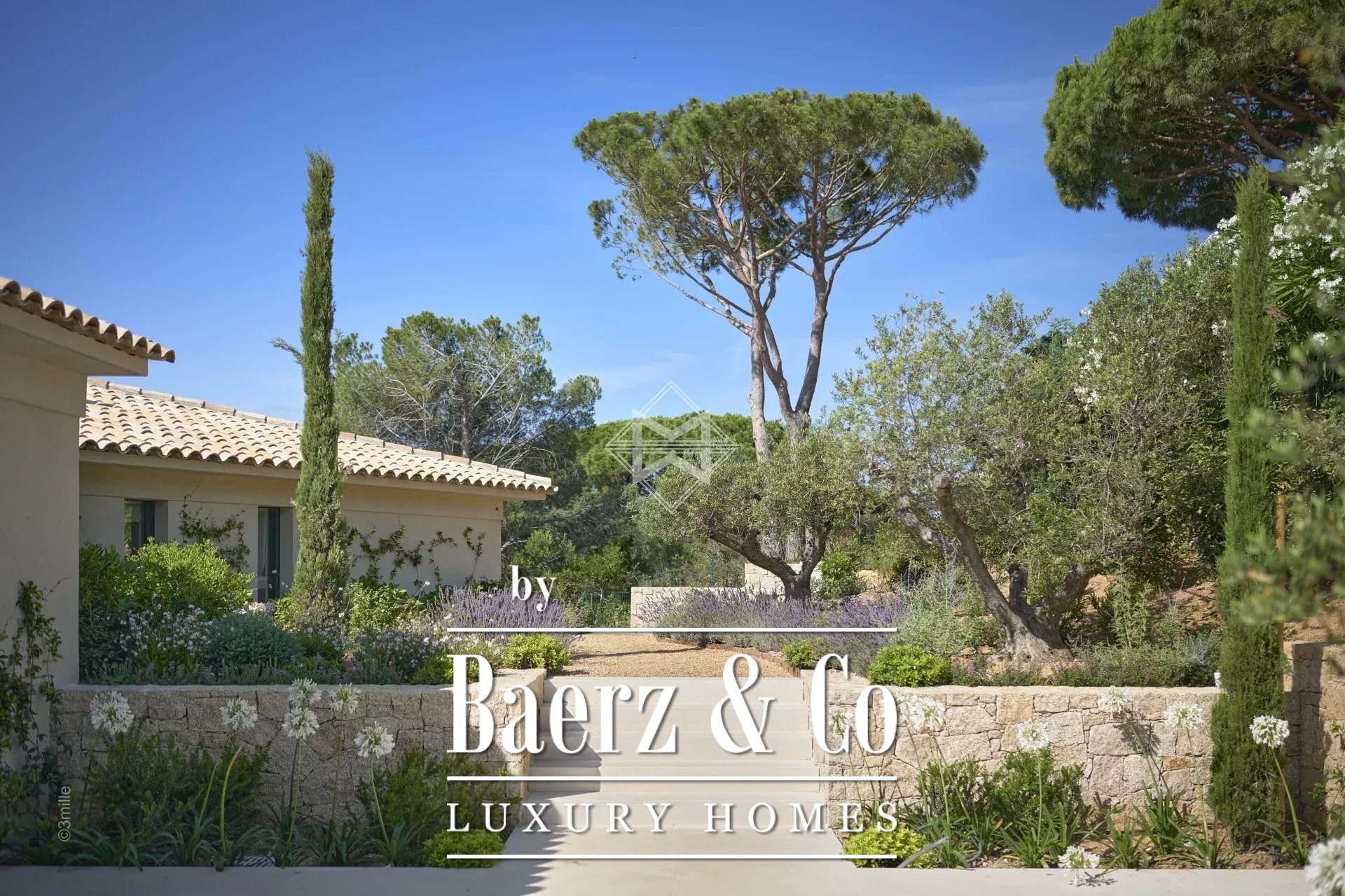 Villa Ramatuelle stands just a short walk from the famed Pampelonne beach, a contemporary residence designed for those who value privacy and architectural distinction. This villa Ramatuelle property extends across 510 m², set within a gated enclave amidst 3465 m² of thoughtfully landscaped grounds, where Mediterranean plants contribute natural texture and calm.
