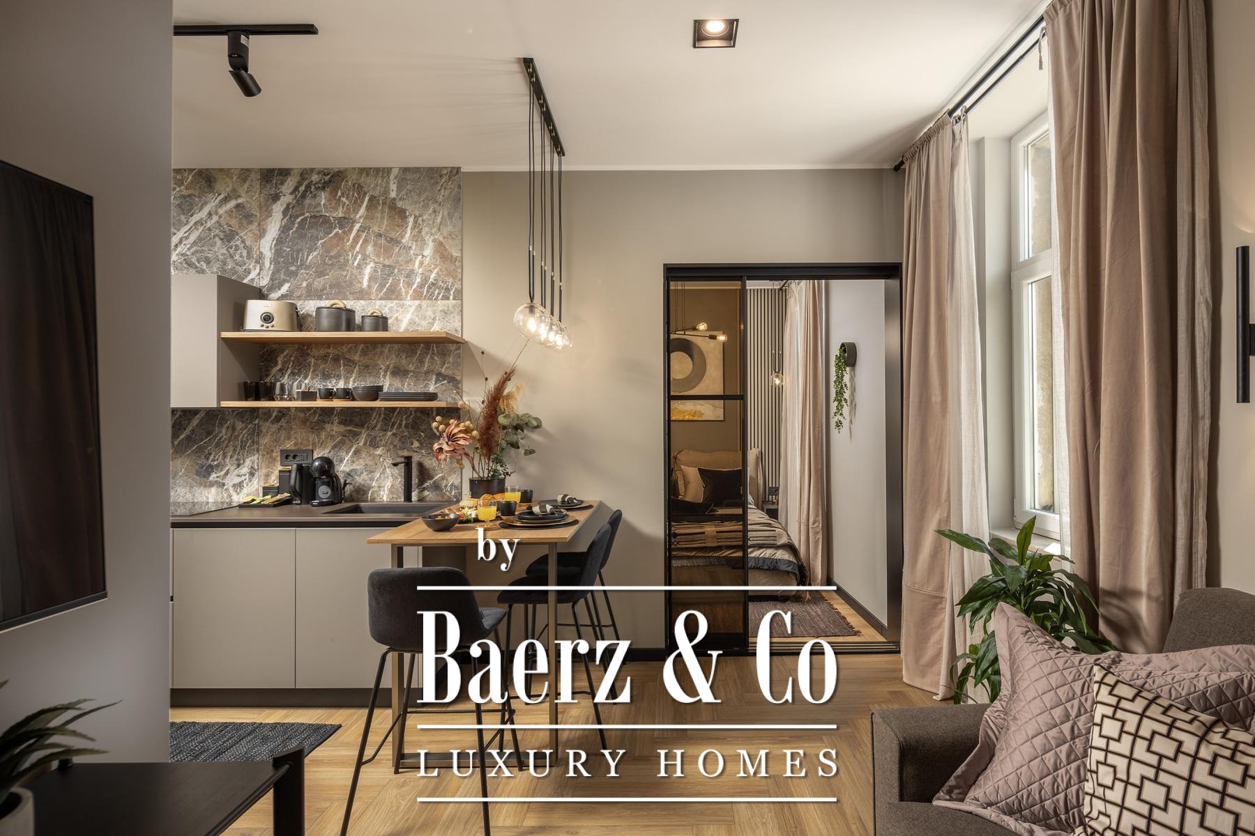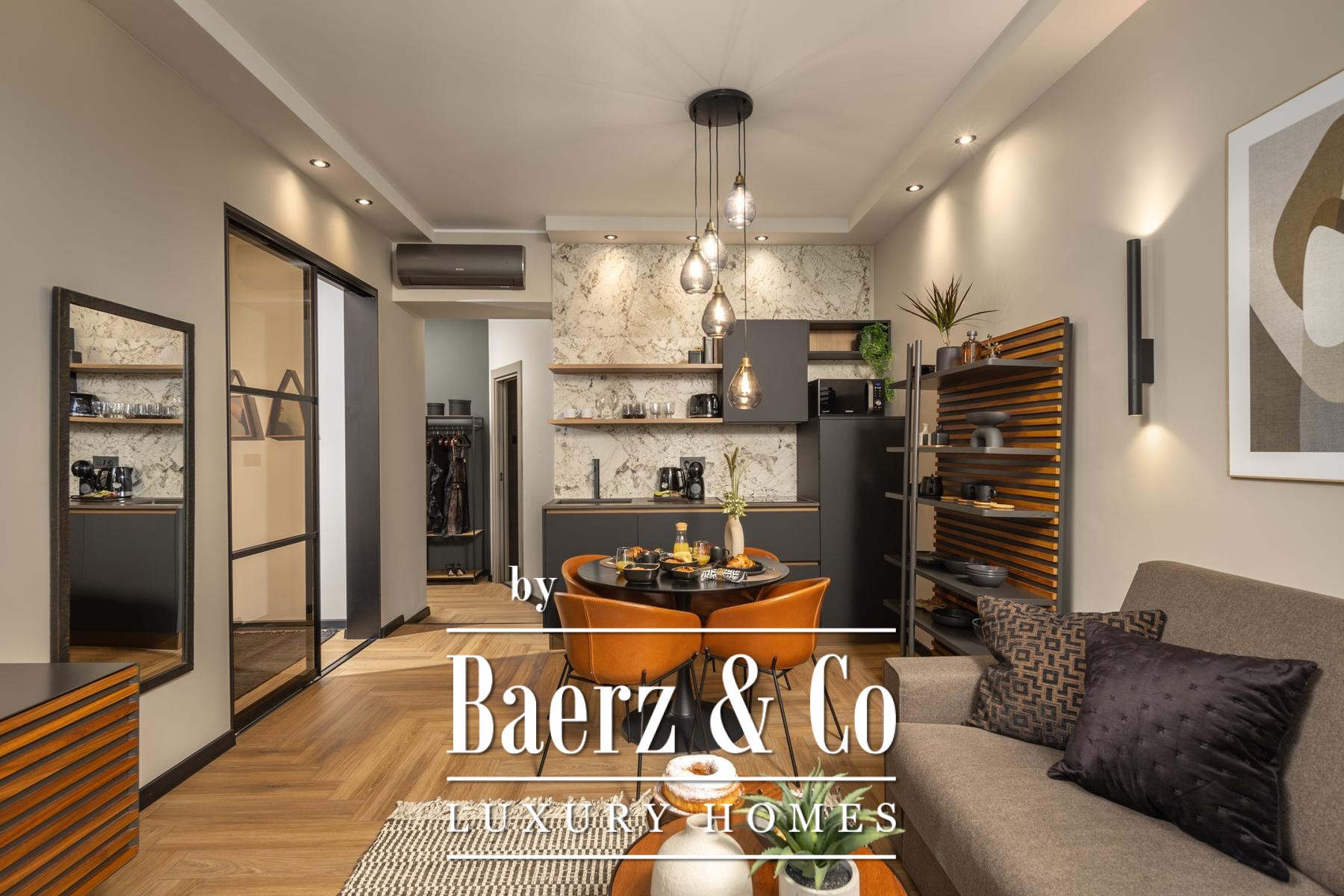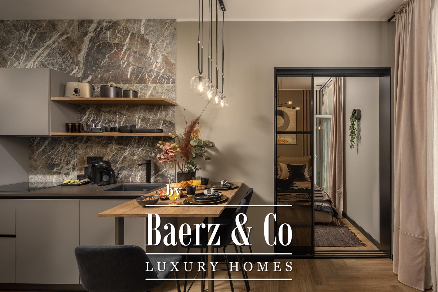 The interiors are shaped by a refined use of warm beige and anthracite, highlighted by gold details and custom lighting. Italian furnishings, large-format porcelain tiles, and matte black Veneta Cucine kitchens with sophisticated stone-marble backsplashes set an elevated tone. Frosted glass partitions, wooden wall slats with LED accents, and designer brass lighting complete the ambience.