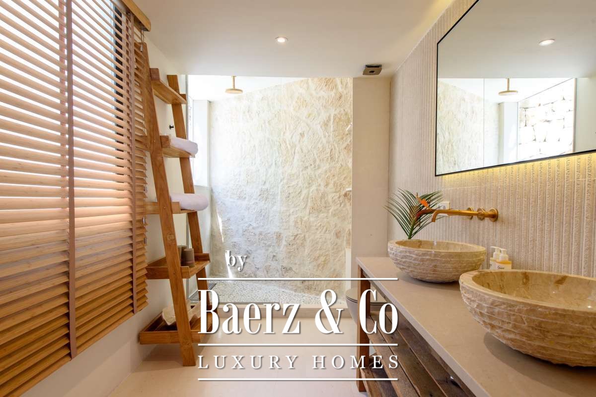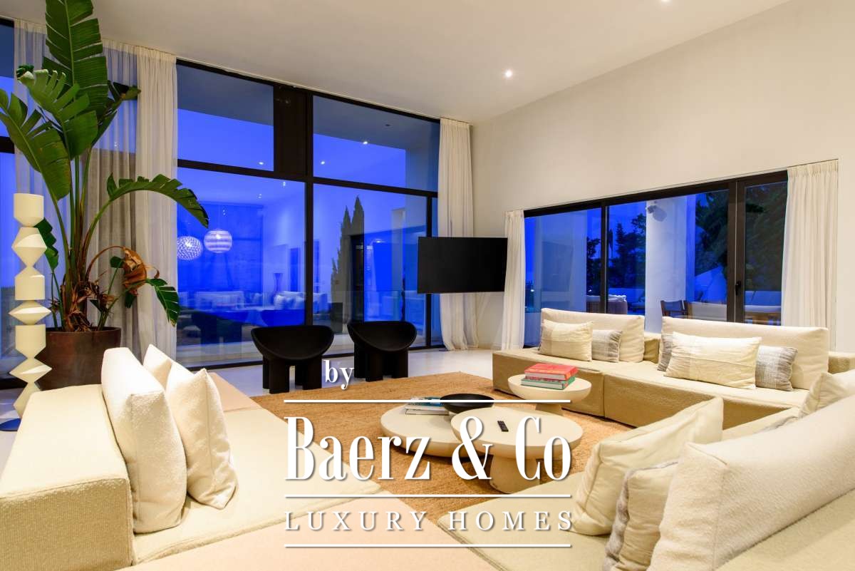 Villa Roca Llisa defines the summit of refined living on Ibiza’s sought-after west coast. This villa Roca Llisa commands panoramic sea views from a privileged position within a gated community, where 24-hour security, illuminated access roads, and seamless proximity to the island’s only golf course set a singular tone. The 492m² residence stands within a 1911m² plot, providing five bedrooms and five bathrooms, and is offered with a coveted tourist license for both private enjoyment and investment appeal.