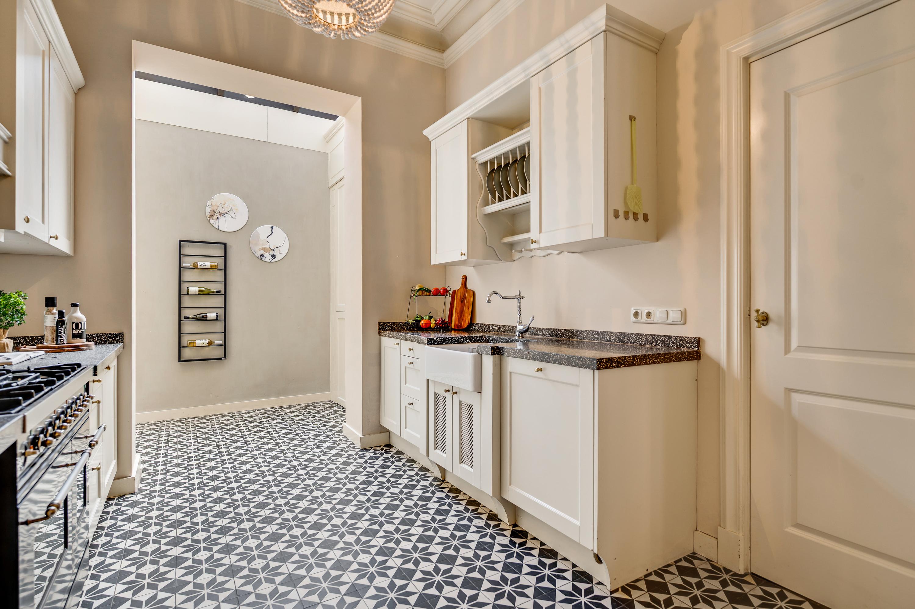 From the stately hall, you enter the impressive kitchen-diner of approximately 25 m². It is equipped with a luxurious kitchen layout that combines classic craftsmanship with modern convenience. The terrazzo countertop, the 6-burner Boretti gas stove with double oven, and the high-quality built-in appliances make this kitchen the beating culinary heart of the home. The classic tiled floor and the high panel doors that separate the kitchen from the dining room emphasize the refined character of the home.