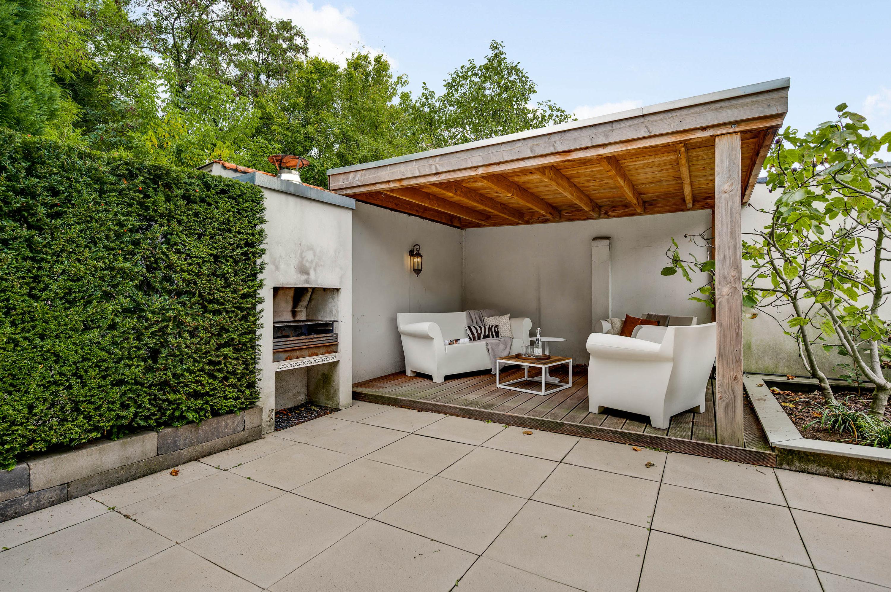 Upon entering, you are immediately embraced by the warm atmosphere and refined finishes. The impressive living room, nearly ten meters long, forms the heart of the home. Here, a beautiful Versailles parquet floor is laid, which, combined with the designer gas fireplace and the tall windows, creates an atmosphere of exclusive tranquility. Through the French doors, the space flows seamlessly into the covered terrace and the stylish city garden – a private oasis in the heart of the city.