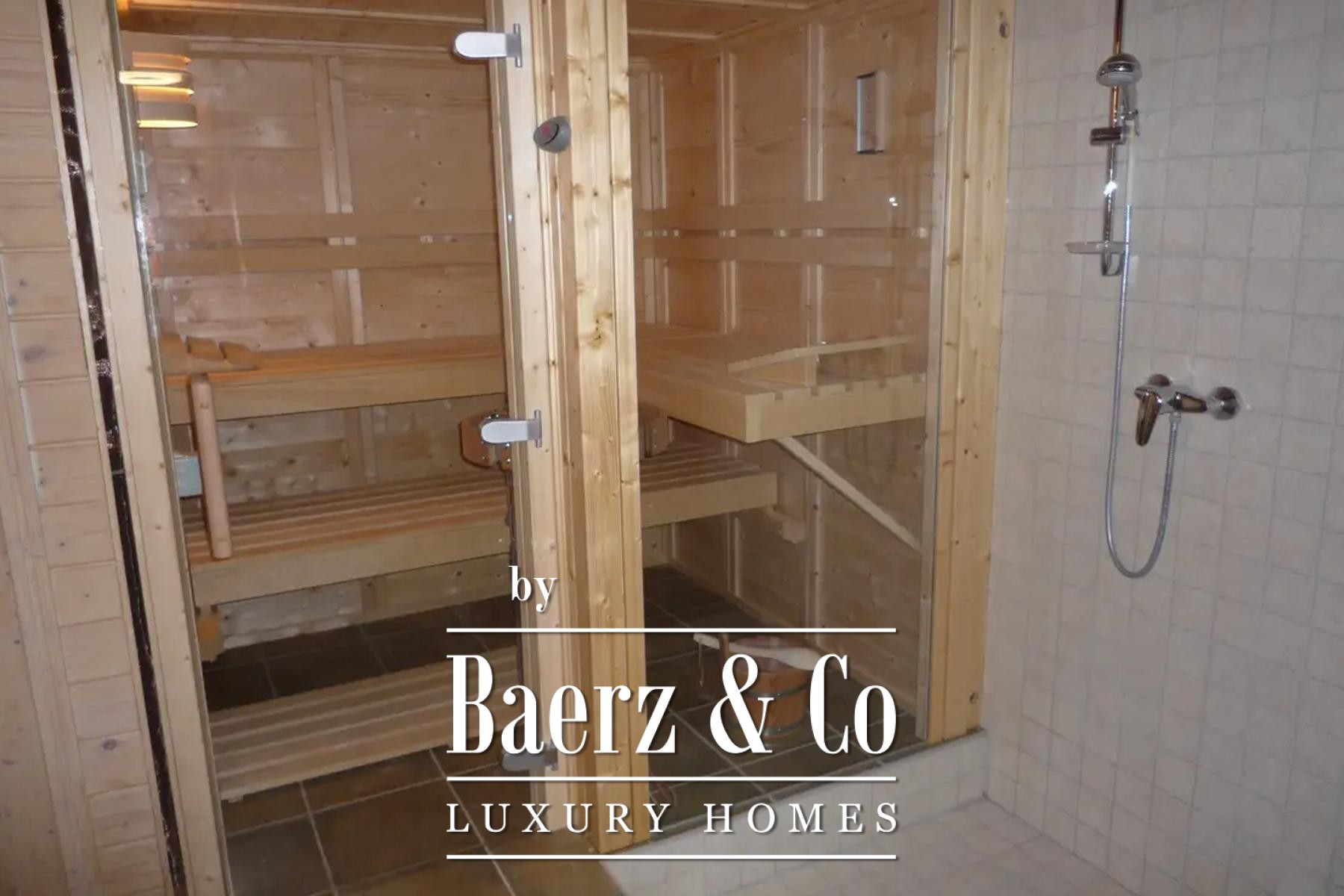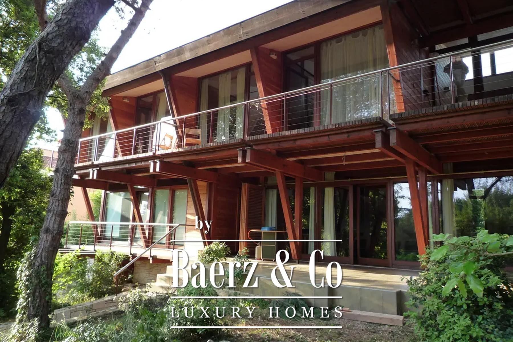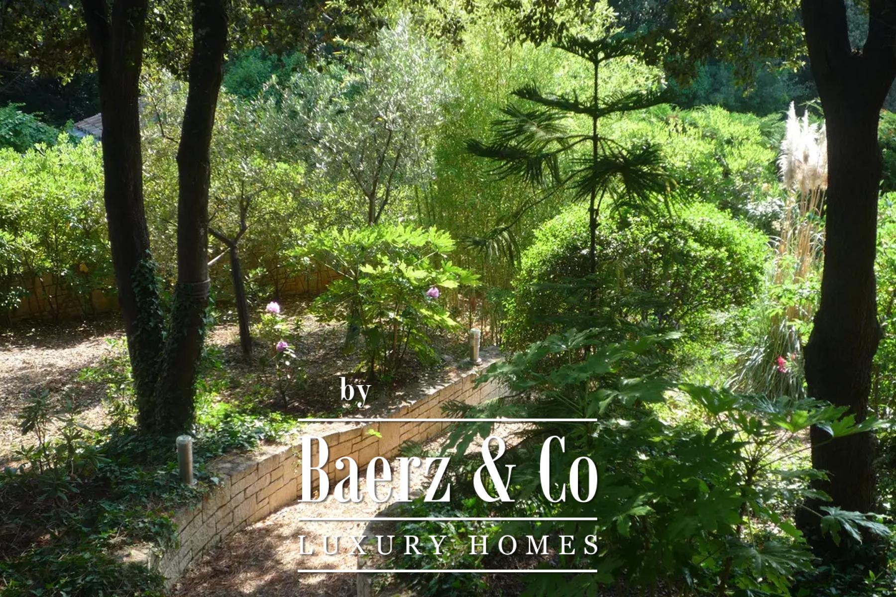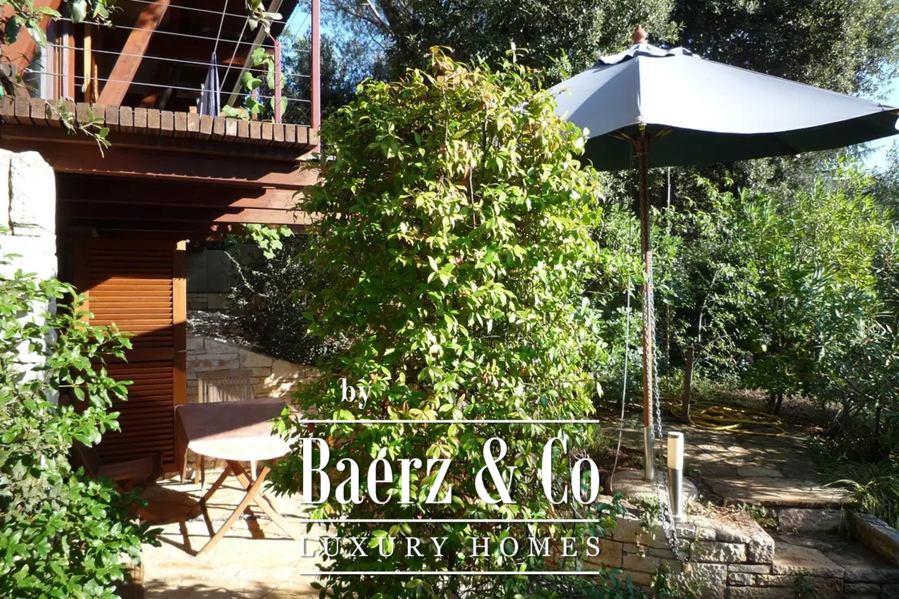 Upstairs, four tranquil bedrooms open onto balconies, with a gallery and shaded terrace connecting to a rooftop enclave for contemplative moments above the garden. The lower level hosts a summer kitchen framed in glass, and a wellness area with sauna, pools, and a landscaped terrace, while a cellar provides storage, central systems, and laundry.