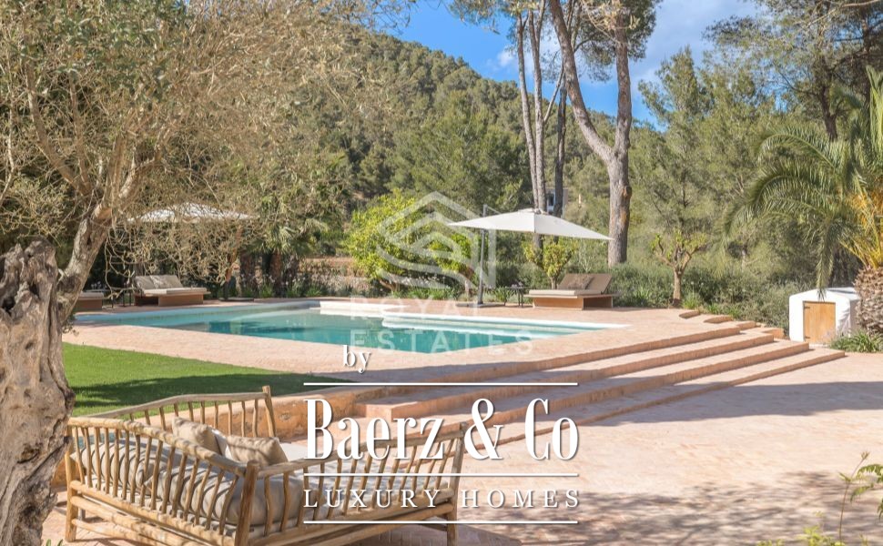The kitchen, open and filled with light, features wooden cabinetry and marble tops, integrating function with a sense of calm. For entertaining, a double-height terrace and outdoor pizza oven encourage gatherings overlooking a manicured lawn and a 10-metre swimming pool. The grounds, spanning 6,000 m², blend seamlessly into the surrounding forest, balancing privacy with open, airy flow. Practicality accompanies beauty—dedicated parking for six cars, high-speed wifi, a Sonos sound system and a private water well. Every element of this villa in Sa Carroca is designed for discreet, restorative island living.
