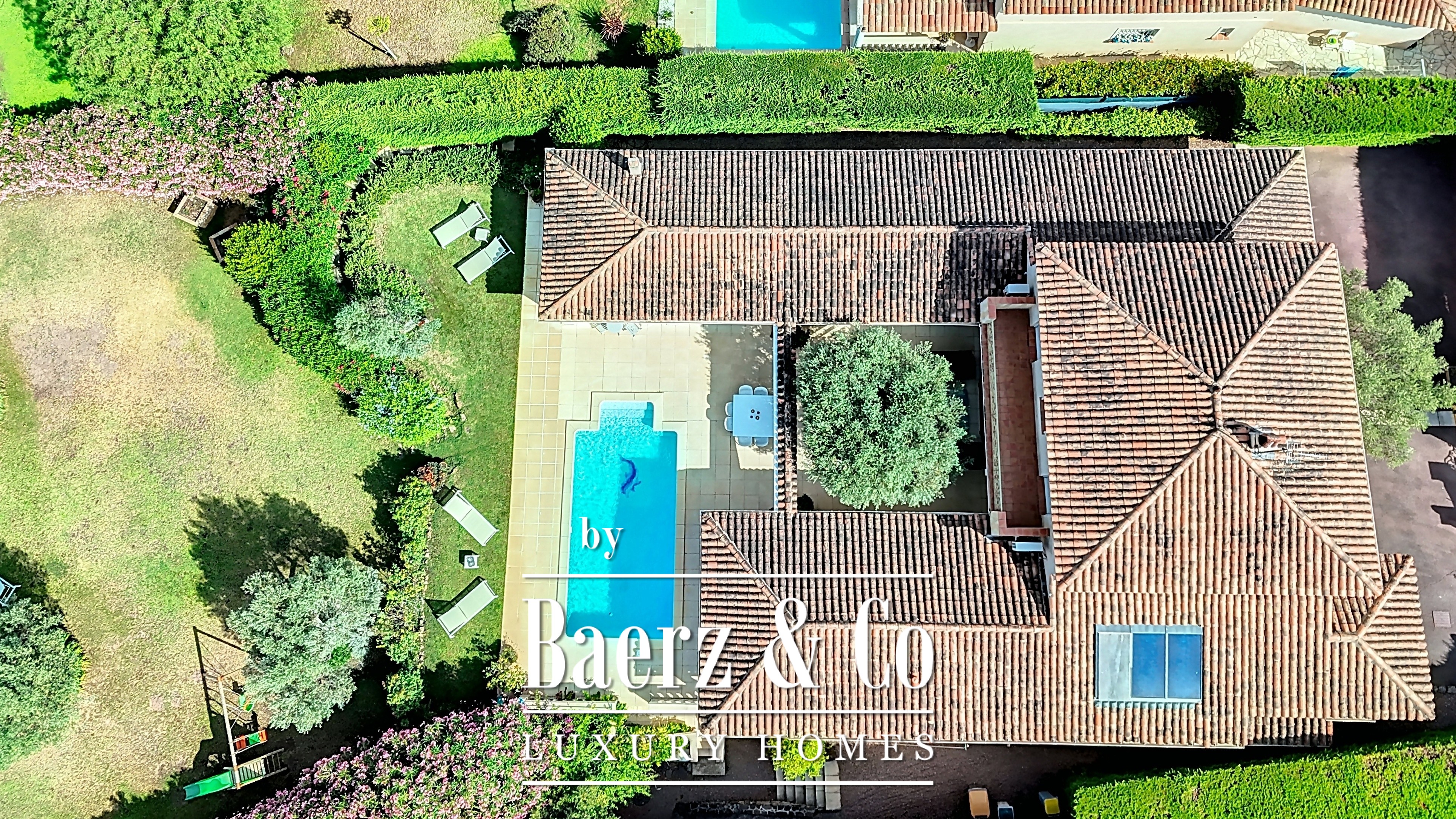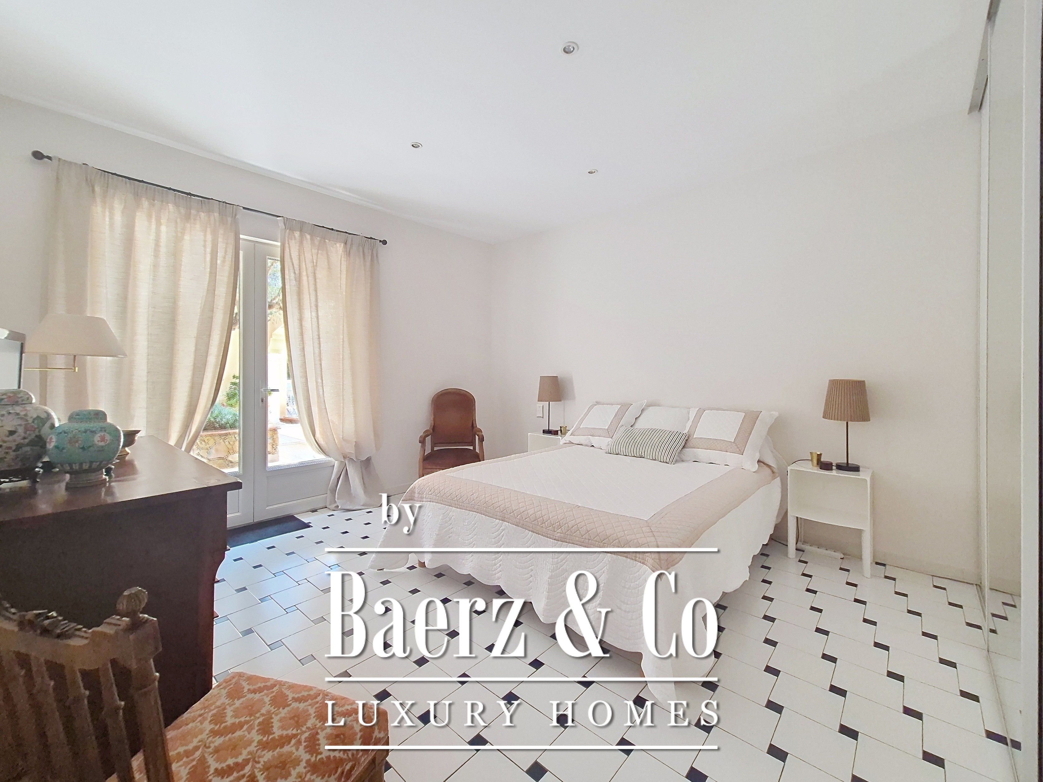 Five bedrooms provide privacy and flexibility, complemented by a distinguished library-office. An expansive living area flows seamlessly to the outdoor terraces, where a heated pool and fruit garden invite a measured pace of life. A pétanque court and direct access to the surrounding pine forest, bordering the Valescure golf course, further anchor the property in its verdant setting.