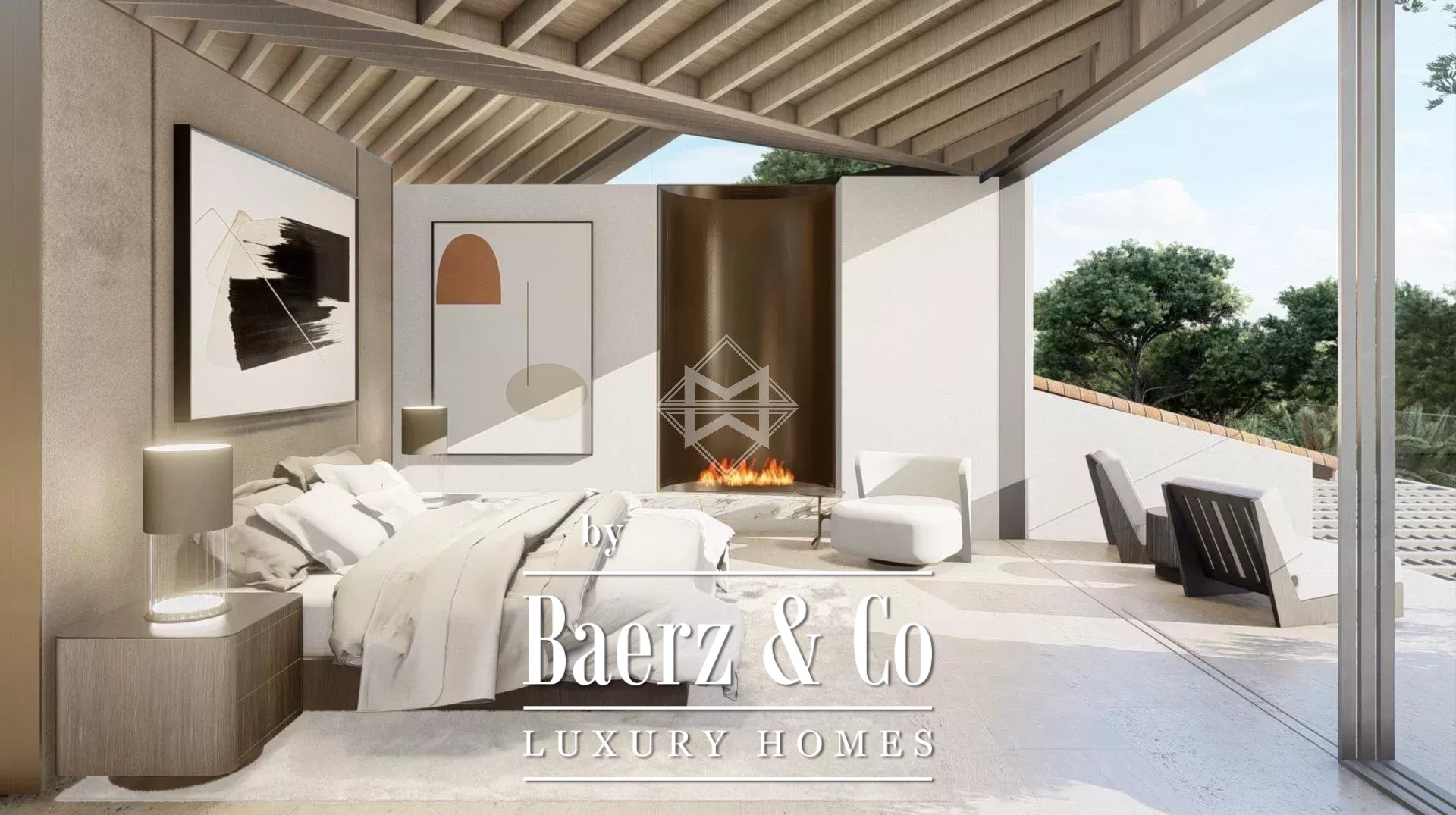 A generous 30 x 5-meter swimming pool anchors the grounds, enhancing the experience of the Mediterranean setting on a 3,670 m² plot. The interior reveals a spacious light-filled living area, a fully equipped open kitchen, and four en-suite bedrooms on the ground level, each with its own private bathroom.