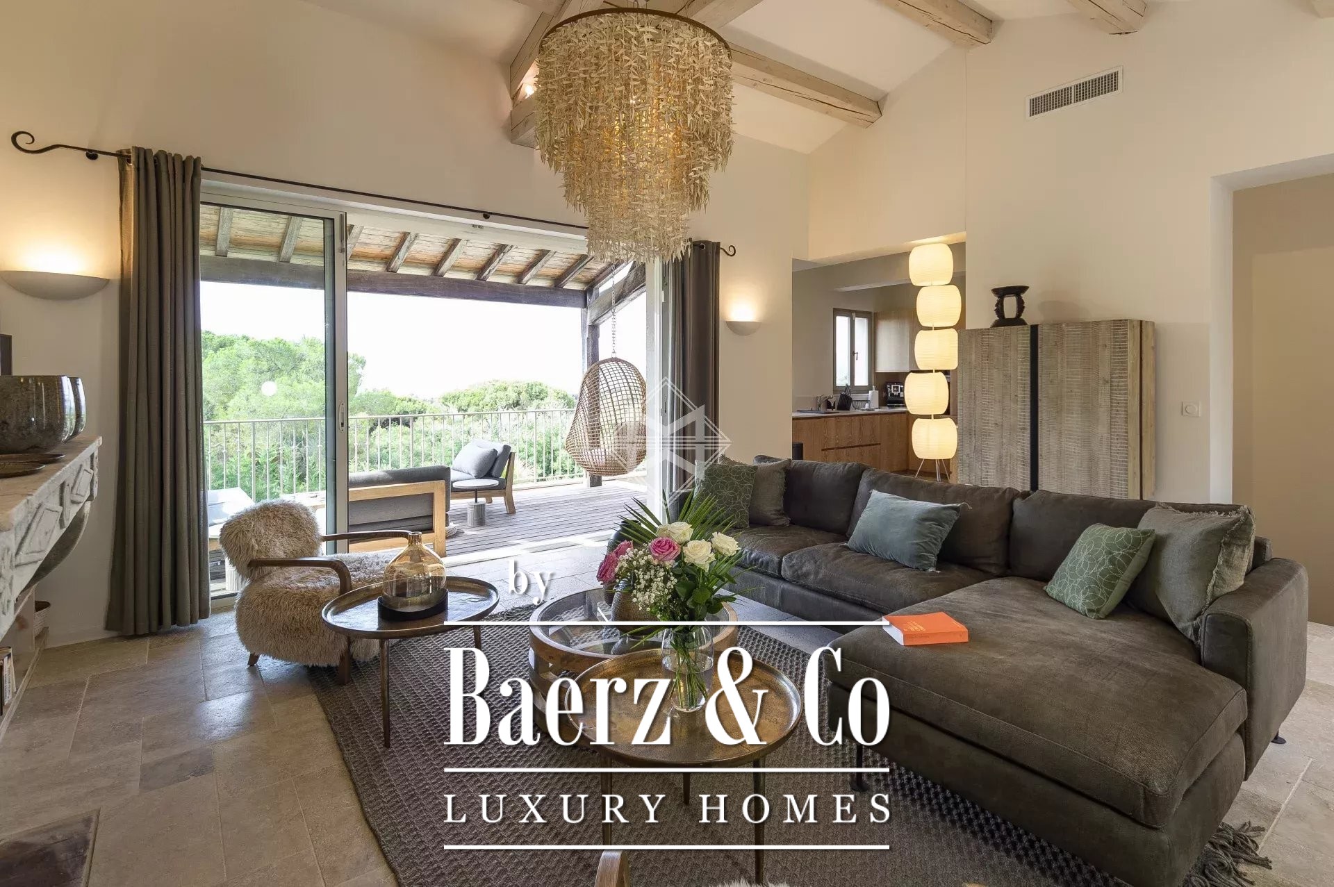 Recently renovated, the villa distributes five bedrooms and three bathrooms across two light-filled levels, welcoming up to ten guests with understated grace. The living room, anchored by a fireplace, opens to sunlit terraces and a loggia dining area. Panoramic 270-degree views sweep across the undulating hills to the historic Château de la Messardière, imbuing each space with a distinct sense of place.