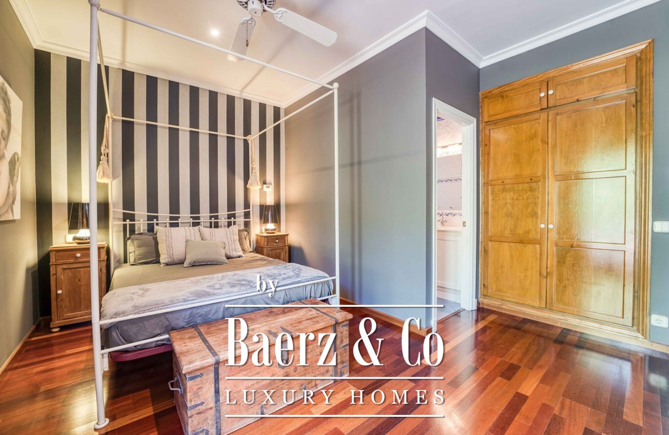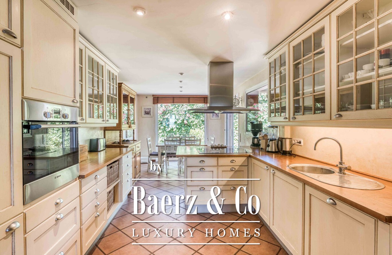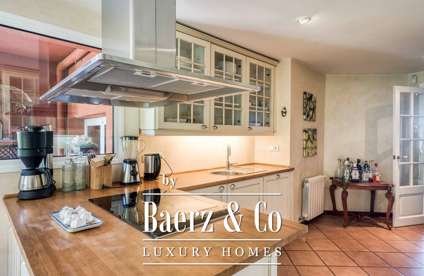 Arranged across two light-filled floors, the villa comprises seven double bedrooms and four full bathrooms, offering ample space for family or guests. The main living area is bright and open, blending smoothly into the terrace and garden. A fully equipped kitchen supports relaxed entertaining while a storage room and garage bring considered functionality. Each room is fitted with heating and air conditioning, ensuring comfort in every season.