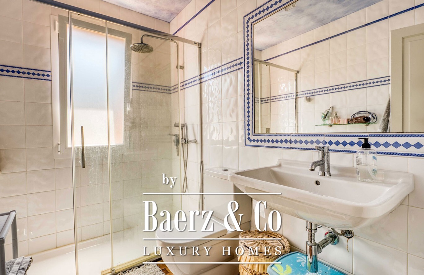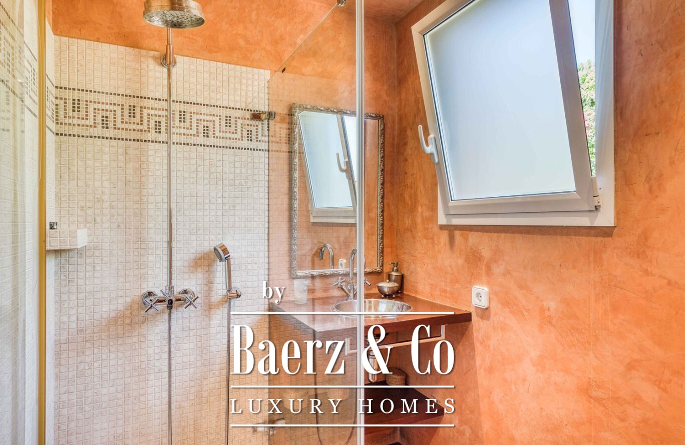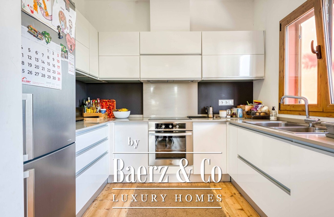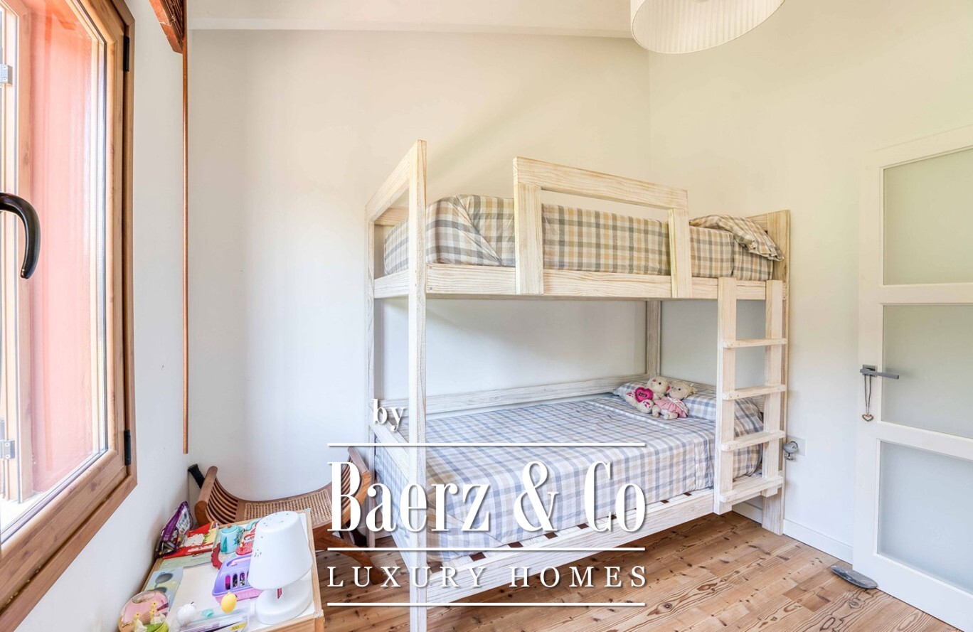 Arranged across two light-filled floors, the villa comprises seven double bedrooms and four full bathrooms, offering ample space for family or guests. The main living area is bright and open, blending smoothly into the terrace and garden. A fully equipped kitchen supports relaxed entertaining while a storage room and garage bring considered functionality. Each room is fitted with heating and air conditioning, ensuring comfort in every season.