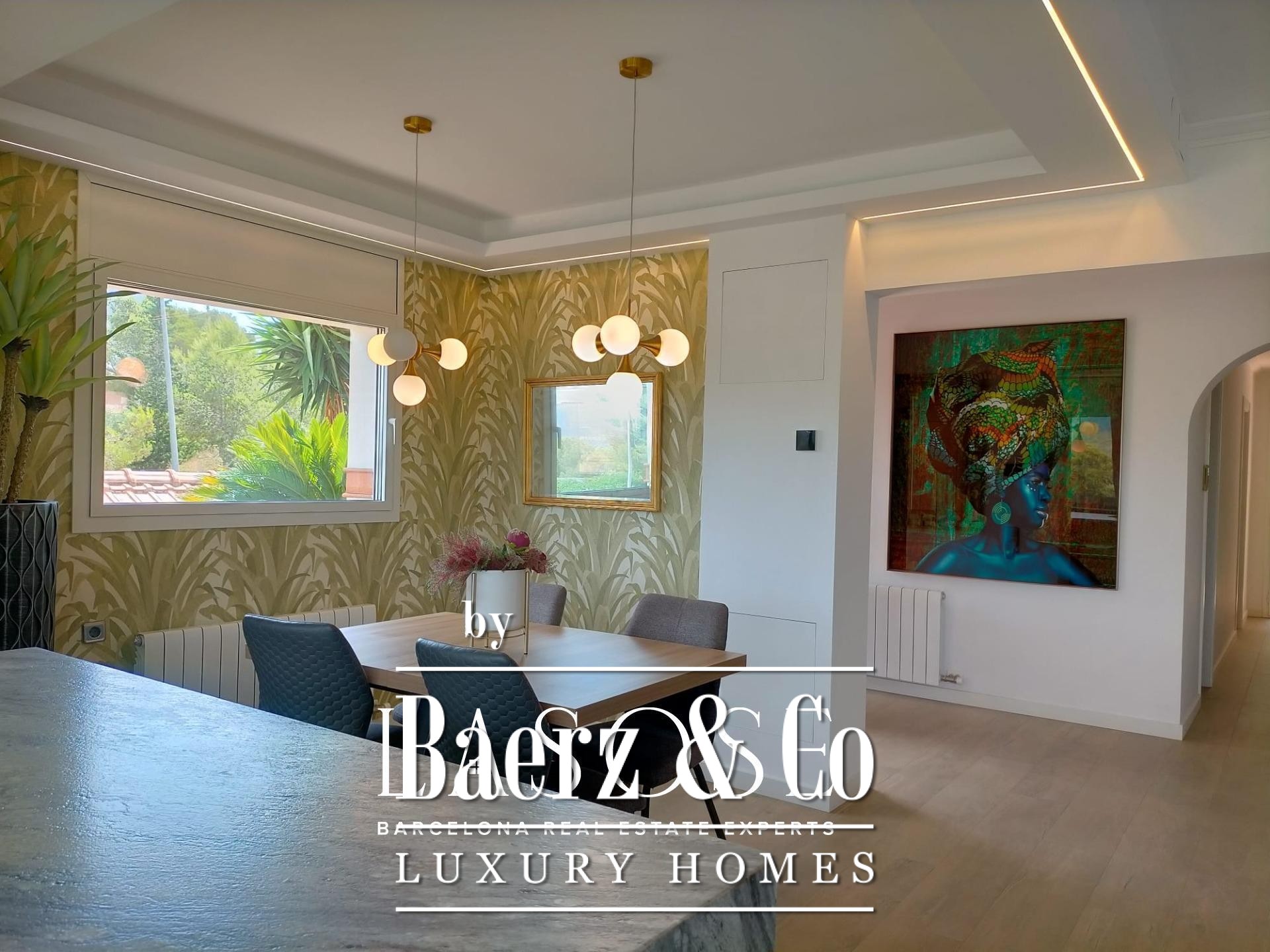 Villa Sant Pere de Ribes is quietly positioned in the esteemed Els Cards residential area, set between Sitges and Sant Pere de Ribes, where privacy and panoramic views define every living moment. This five-bedroom, three-bathroom villa blends traditional Spanish architecture with contemporary refinement. Recently renovated interiors preserve authentic details such as arches and natural textures, while bringing in clean modern lines and warm tones. The open-plan main floor flows across kitchen, dining and living spaces, illuminated by abundant sunlight from windows on two sides. A statement fireplace centers the living area, offering an inviting gathering point year-round.