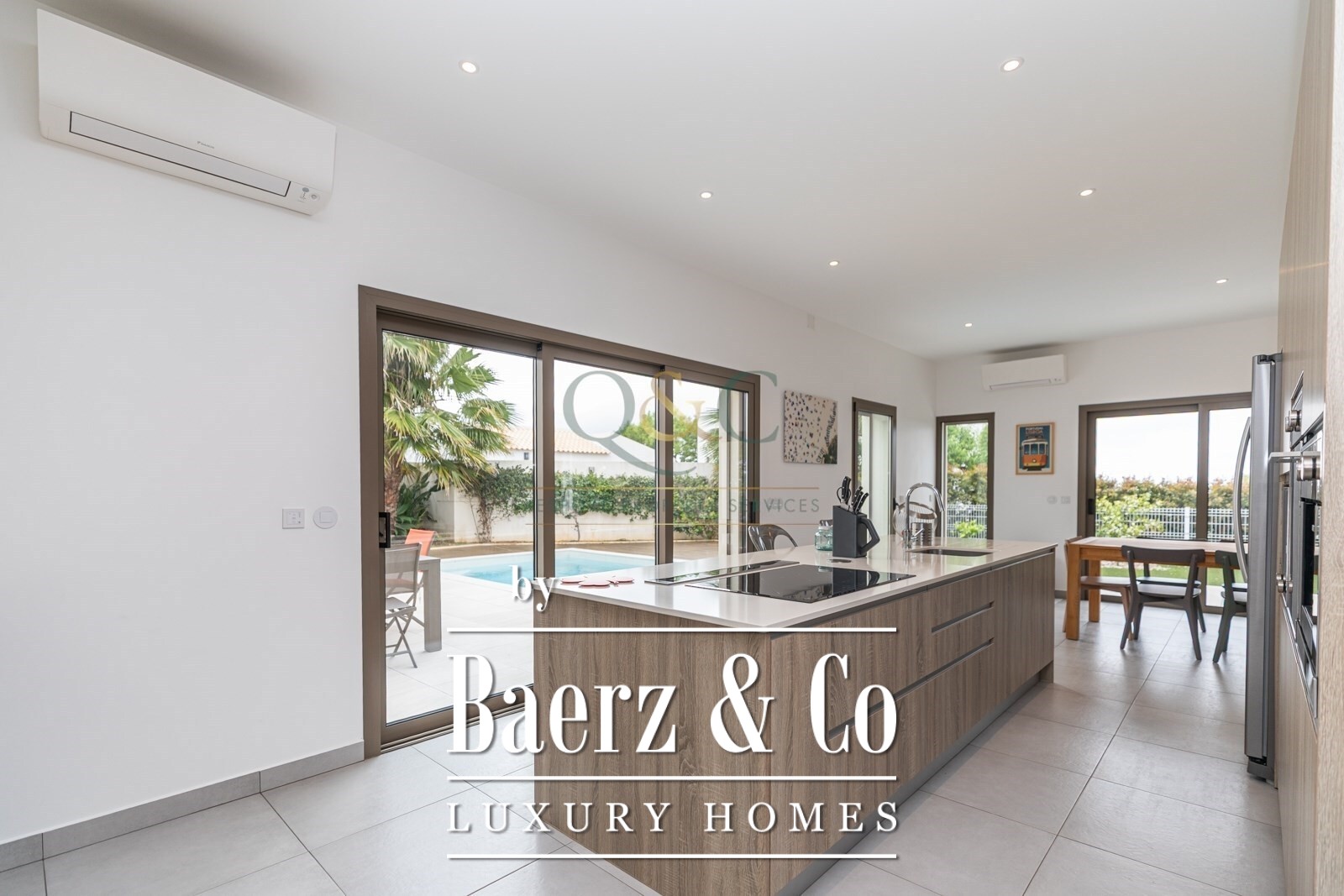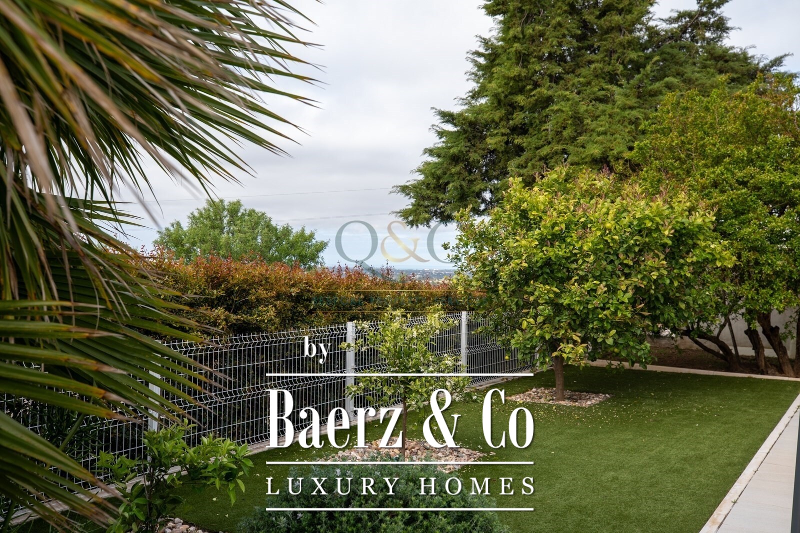 The villa’s pool, equipped for heating, is bordered by a low-maintenance garden with fruit trees. The grounds are fully walled, with electric gates and automatic irrigation. Shaded terraces, synthetic lawn, and seamless access to regional amenities—beaches, golf, shopping, and education—complete the picture of refined Algarve life.