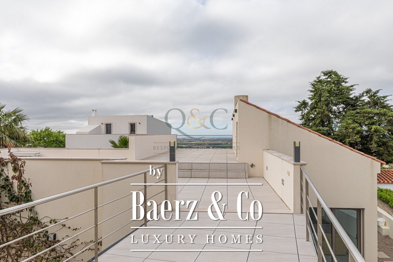 A metal bridge links to the second house, unveiling three en-suite bedrooms, two with private terraces facing the sea and countryside. The ground floor includes an additional living room, laundry, ample storage, and internal garage access. Throughout, double glazing, electric shutters, and climate control maintain privacy and comfort, while solar panels and a raised foundation assure thoughtful sustainability.