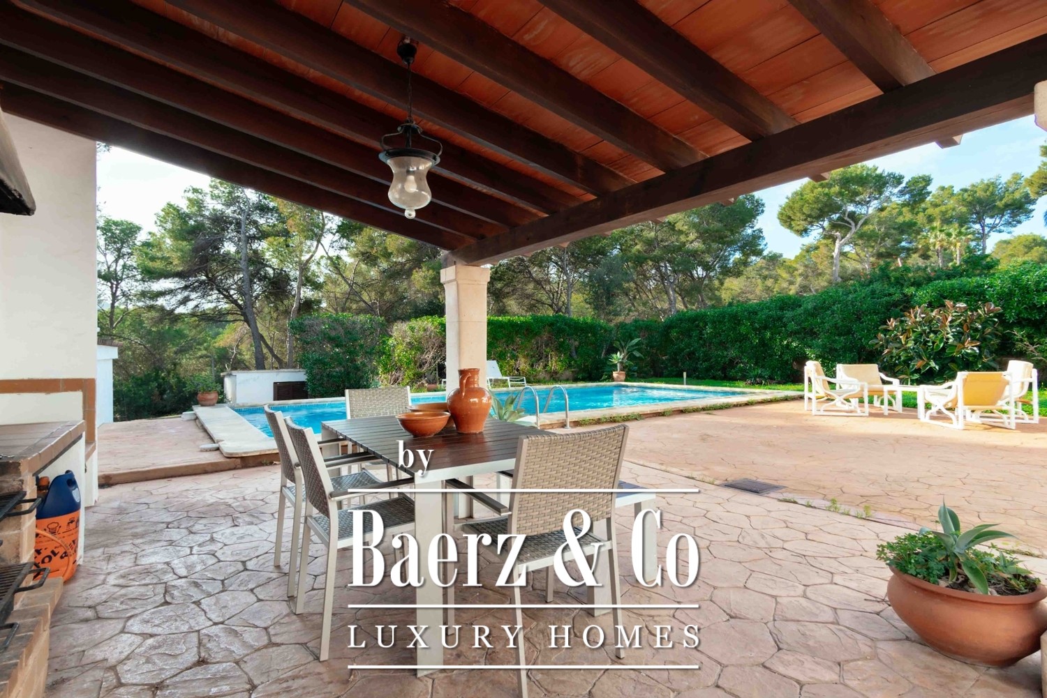 Quality materials—parquet floors, air conditioning, gas central heating—create a quietly refined atmosphere. Outside, a large freshwater pool, summer kitchen with barbecue, and thoughtfully tended gardens set the stage for relaxed Mediterranean living. The villa includes a garage and terraces, all within Santa Ponça, a coastal enclave offering a refined promenade, reliable infrastructure, and swift access to Palma in twenty minutes and the airport in thirty. This property articulates location and potential in one of Mallorca’s most desirable addresses.