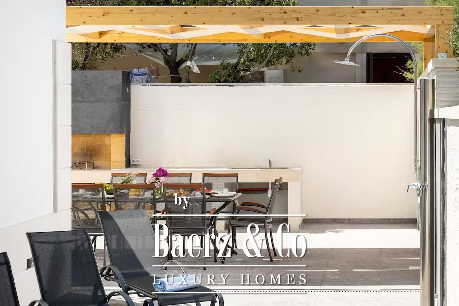 The ground floor centres on a contemporary living area, integrating kitchen, dining and lounge spaces, complemented by a single bedroom and guest toilet. Above, four en suite bedrooms each open onto private terraces that capture tranquil sea views, offering space for retreat or quiet contemplation. The basement features a garage for one car, a social room, spa room with bathroom and a dedicated machine room, ensuring both comfort and practicality.