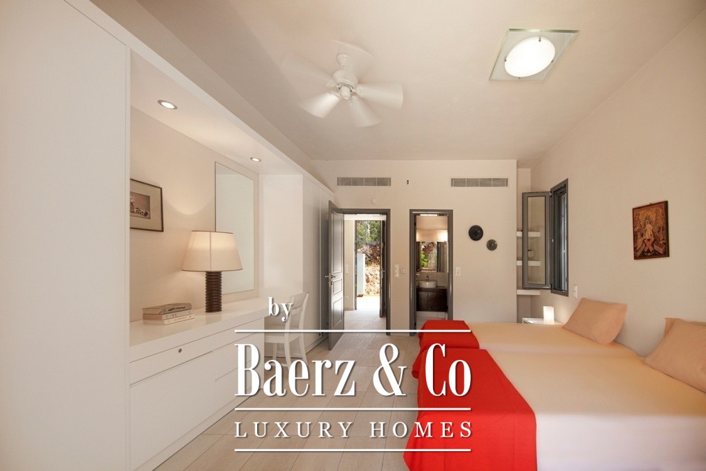 Villa Soligeia with sea views is positioned just 50 meters from the gentle coastline, offering a rare sense of privacy within the gulf of Amoni. Completed in 2006, this four-level villa rests on a 1,059 m² plot, its architecture thoughtfully adapted to the natural slope. Each of the 300 m² is dedicated to clarity of space and quiet certainty of design.