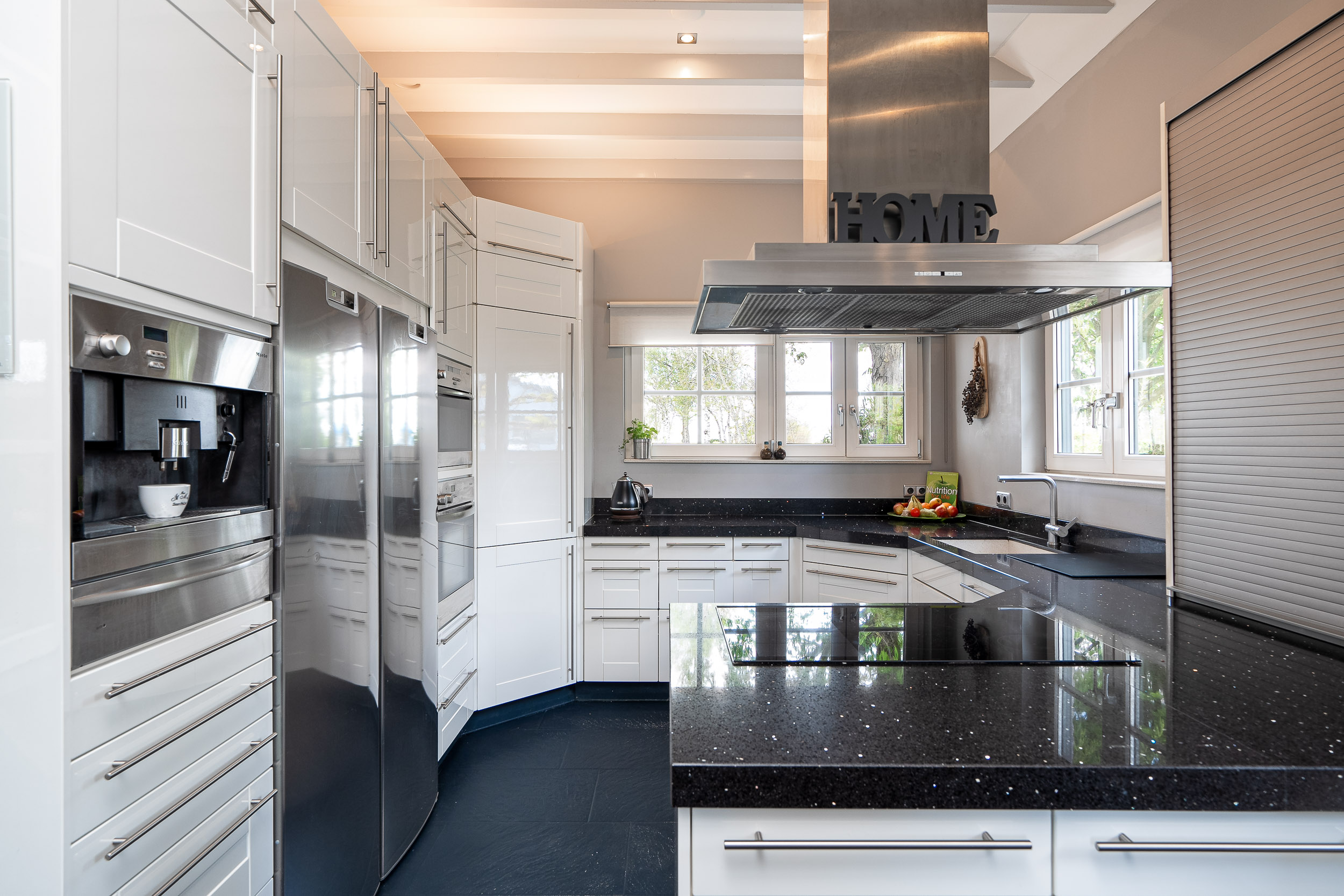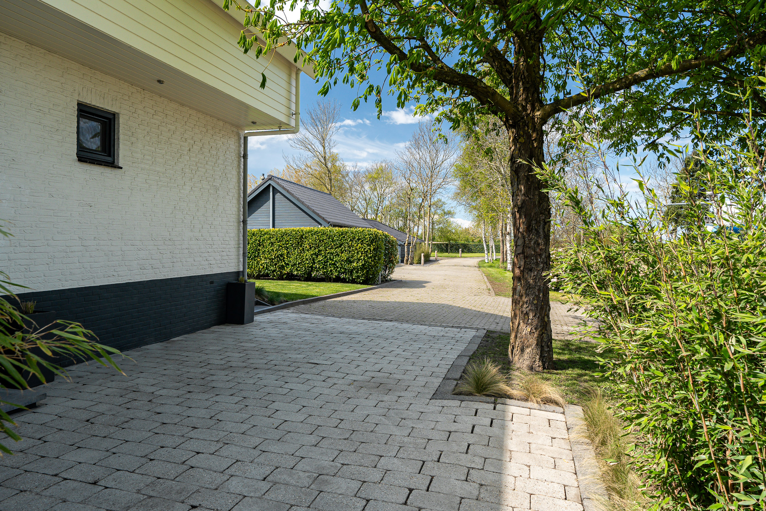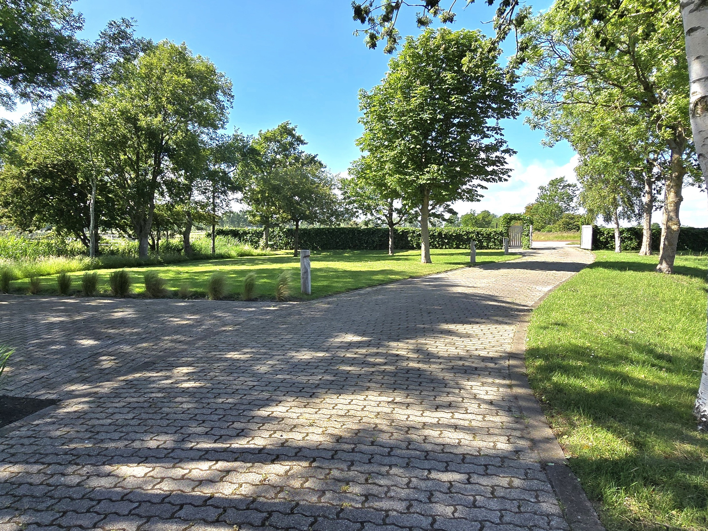 The architecturally designed garden, maintained by a robotic lawn mower, is easy to care for and features various fruit trees, hedges, and reed-lined waterways. The stylishly paved driveway and entrance gate mark the transition to the lush green surroundings.