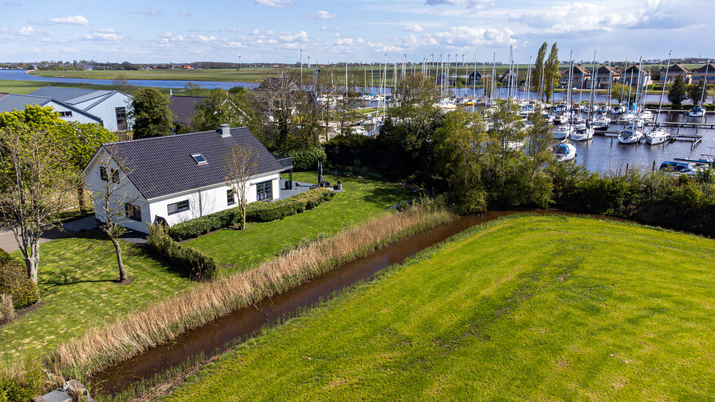 In a prime location near the IJsselmeer, adjacent to a marina with direct access to all waterways in Friesland, this villa was completely renovated in 2004 and is situated on a spacious, fenced plot with full privacy and stunning Frisian panoramas. The tranquility, greenery, water, ever-changing skies, and sense of freedom are the defining features of this home. This well-insulated villa of 245m² is designed for lifelong living, featuring a spacious living area, four bedrooms, two bathrooms, a luxurious kitchen with utility room, and a beautiful veranda with scenic views. The double garage with an upper floor offers an abundance of space and possibilities. The fully insulated home office, studio, or guesthouse with breathtaking views of nature serves as a true source of inspiration. The architecturally designed garden, maintained with a robotic lawn mower, is easy to care for and playfully arranged with various fruit trees, hedges, and reed-lined waterways. The stylishly paved driveway and entrance gate highlight the transition to the lush green garden that remains vibrant year-round.