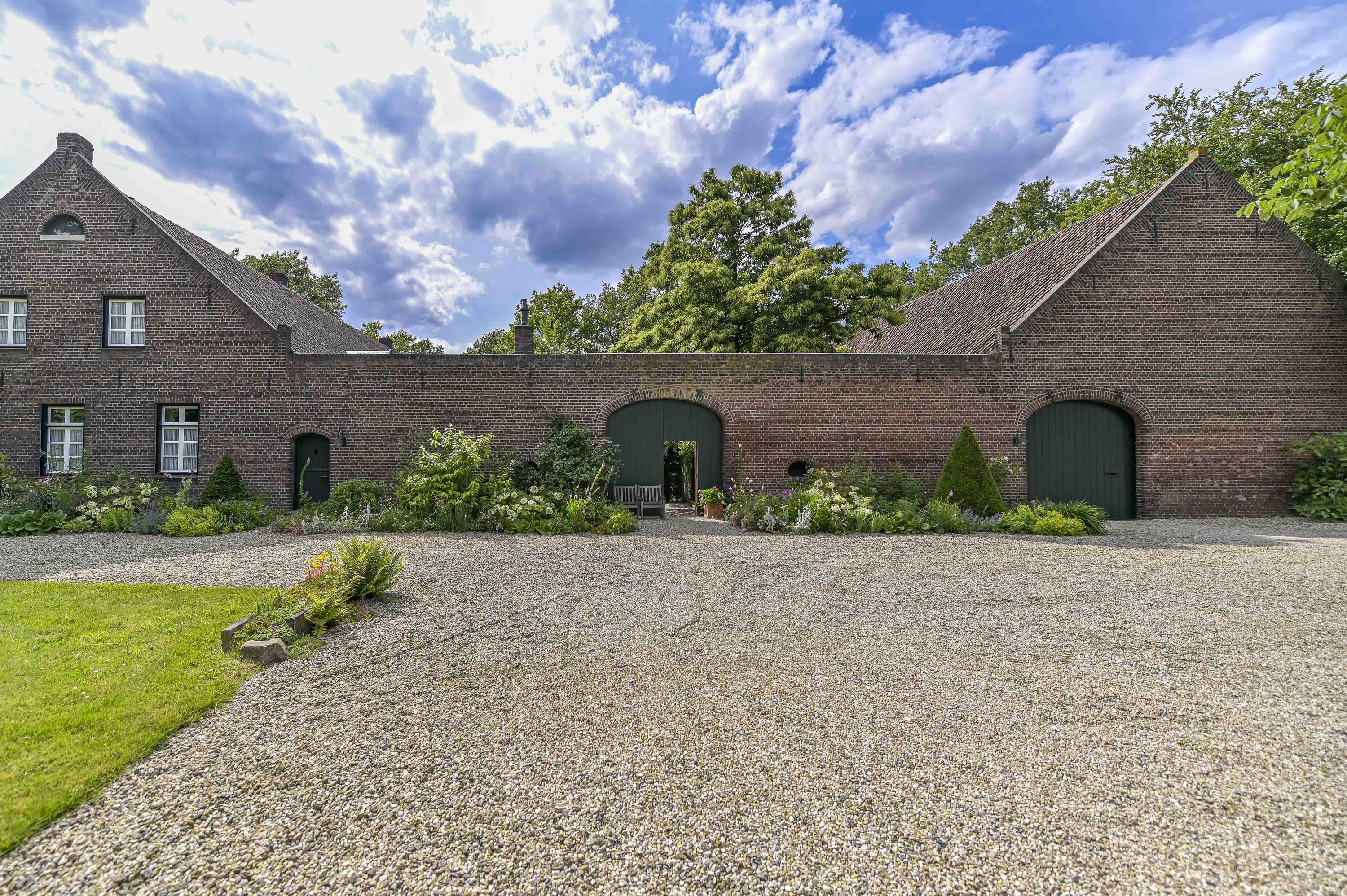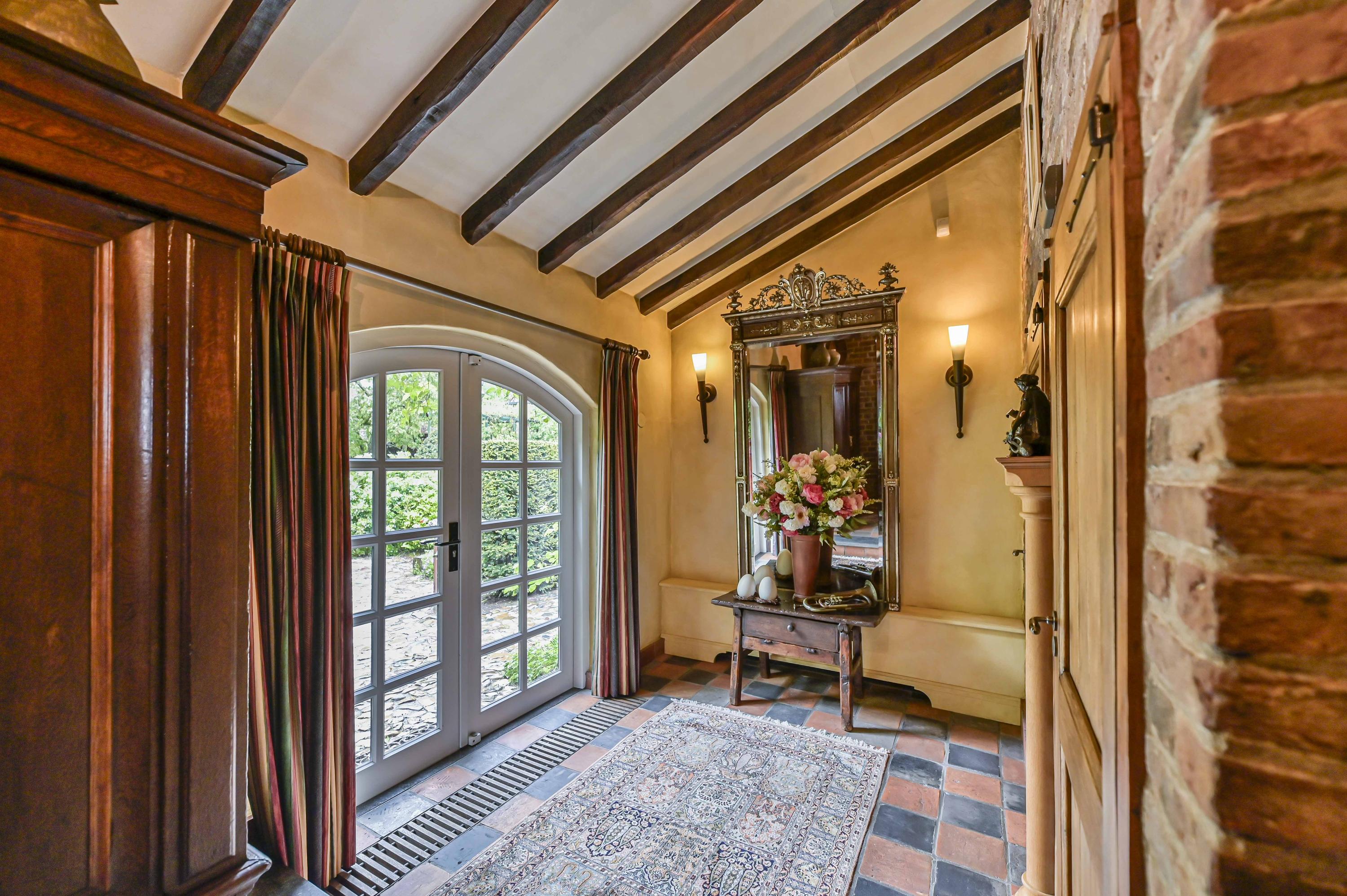 Beautifully landscaped courtyard with a spacious covered terrace (approx. 65 m²) featuring three elegant arches. The courtyard provides a full view of the carré layout of the farmhouse. All gutters and drains are finished in zinc.