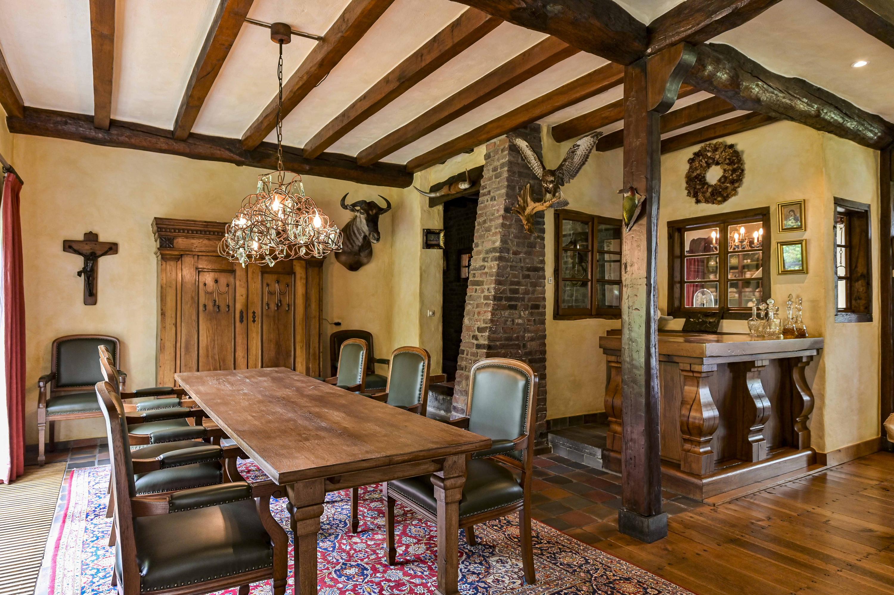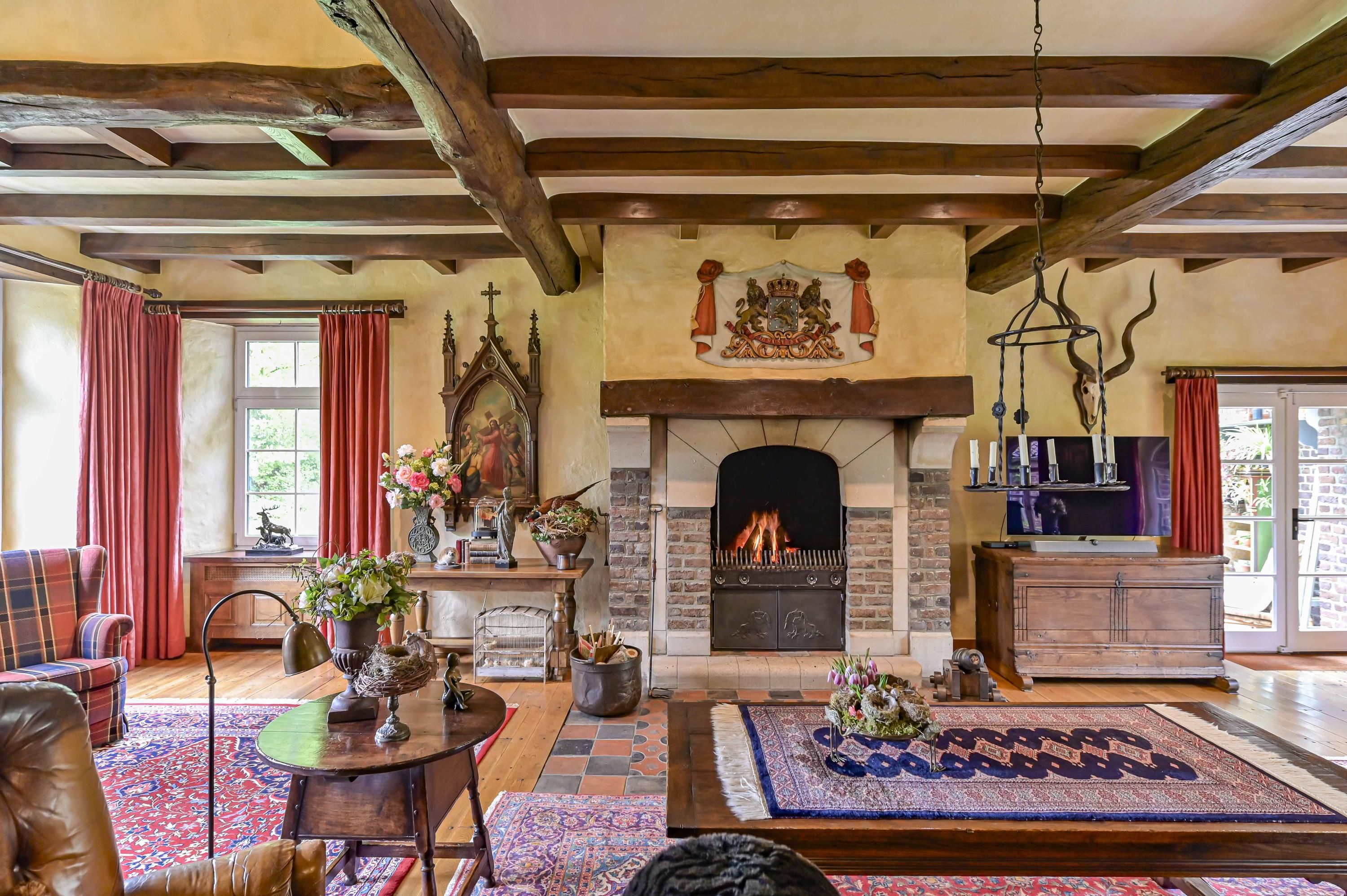 The grand living room (approx. 81 m²) is surrounded by windows, flooding the space with natural light. It includes a large open fireplace, an impressive mantelpiece, and a unique wooden bar. French doors open to the courtyard and to the adjoining conservatory.