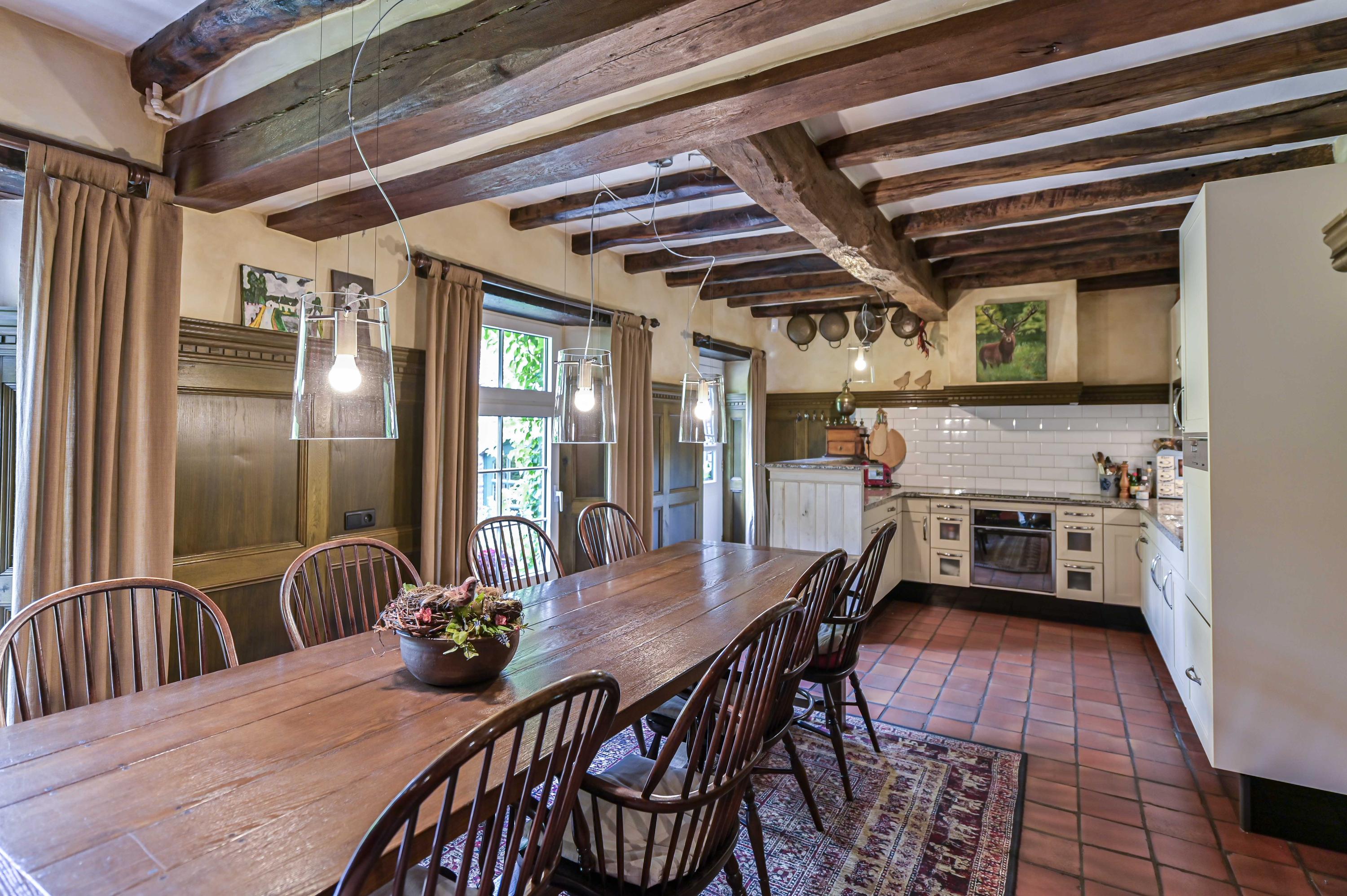 The farmhouse-style kitchen (approx. 30 m²) features built-in cupboards, unique details and a granite worktop. Double doors connect to the inner courtyard. From here, the former dining room (approx. 26 m²) gives access to the spacious living room.
