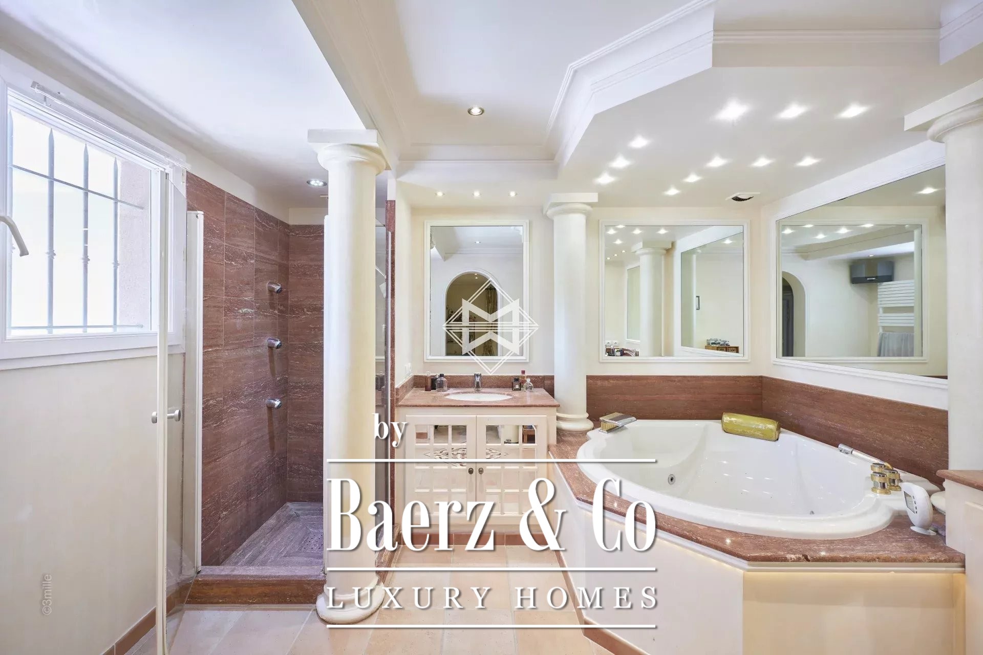 Villa Théoule-sur-Mer takes its place atop a quiet hillside overlooking the expanse of the Mediterranean. This villa, with 360 m² of living space and five bedrooms each featuring its own bathroom, situates itself on a generous 4,280 m² plot adjoining the Pointe de l'Aiguille Natural Park. Here, views reach across the sea, toward the Lérins Islands and French Alps, encompassing the rare clarity that defines the Riviera.