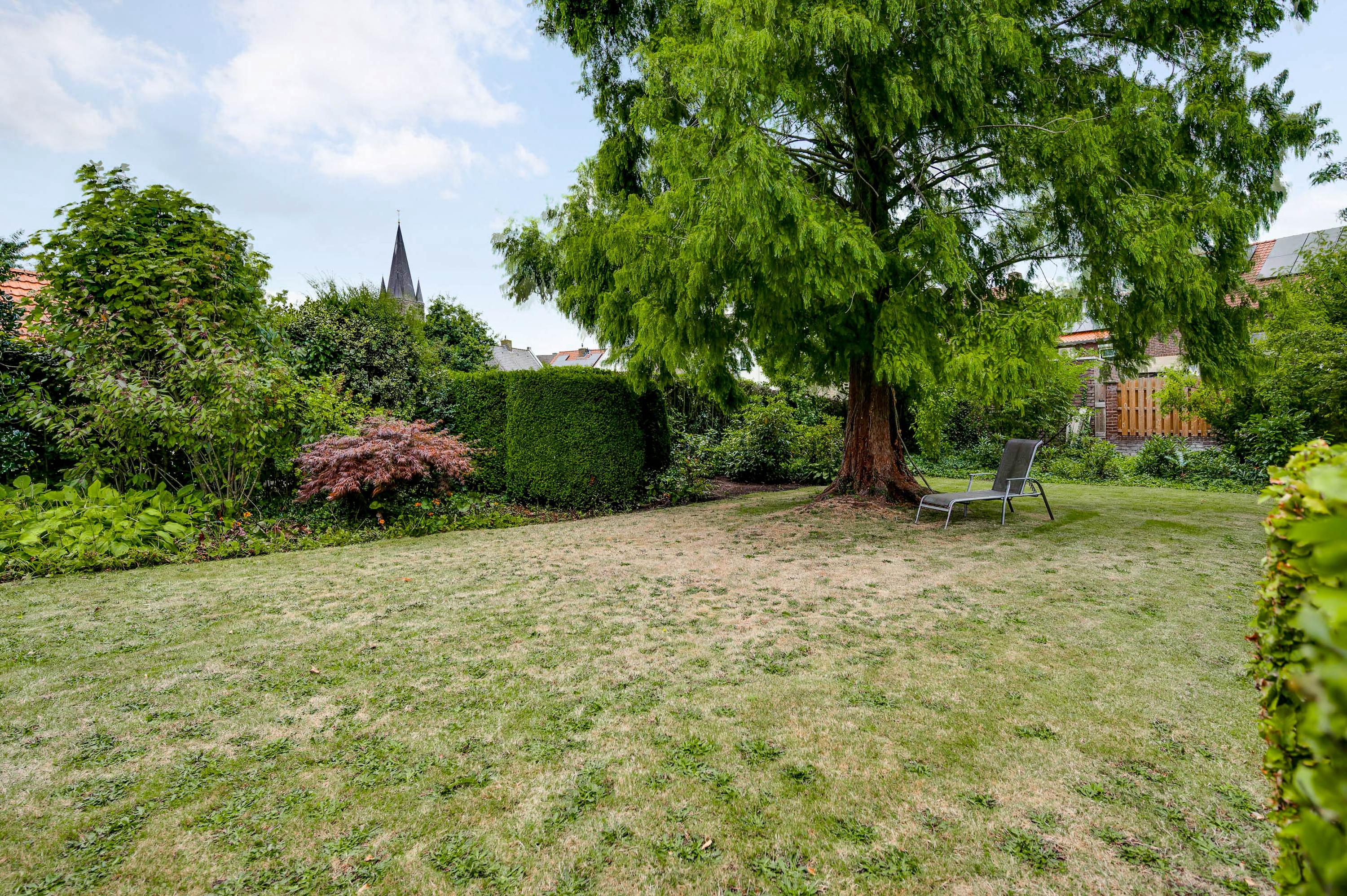 The garden seamlessly blends in with the house and offers plenty of privacy, despite its central location in the historic town center. The back garden is accessible via a private rear entrance and features several patios – one of which is covered – a lawn, and attractive flower beds.