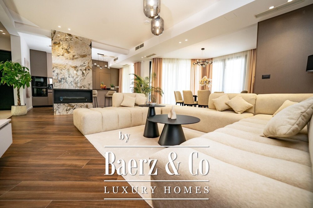The lower ground floor features a two-car garage, a gym, a sauna, a laundry room, and a walk-in wardrobe, extending daily living into spaces for wellness and order. Above, three bedrooms each offer the seclusion of en-suite bathrooms and direct access to private terraces. The first floor's open living area draws guests into a fluid environment, where a fireplace anchors the space, and glass doors reveal a terrace with sweeping sea views, a summer kitchen, and ample room for entertaining. The internal elevator ensures seamless movement through every level.