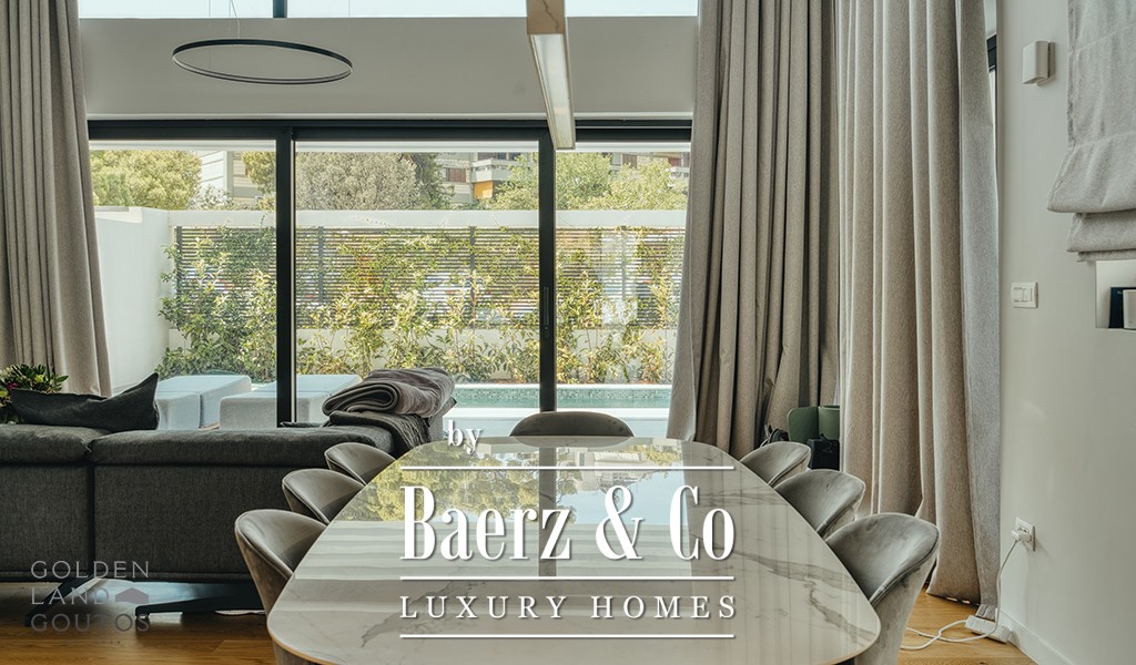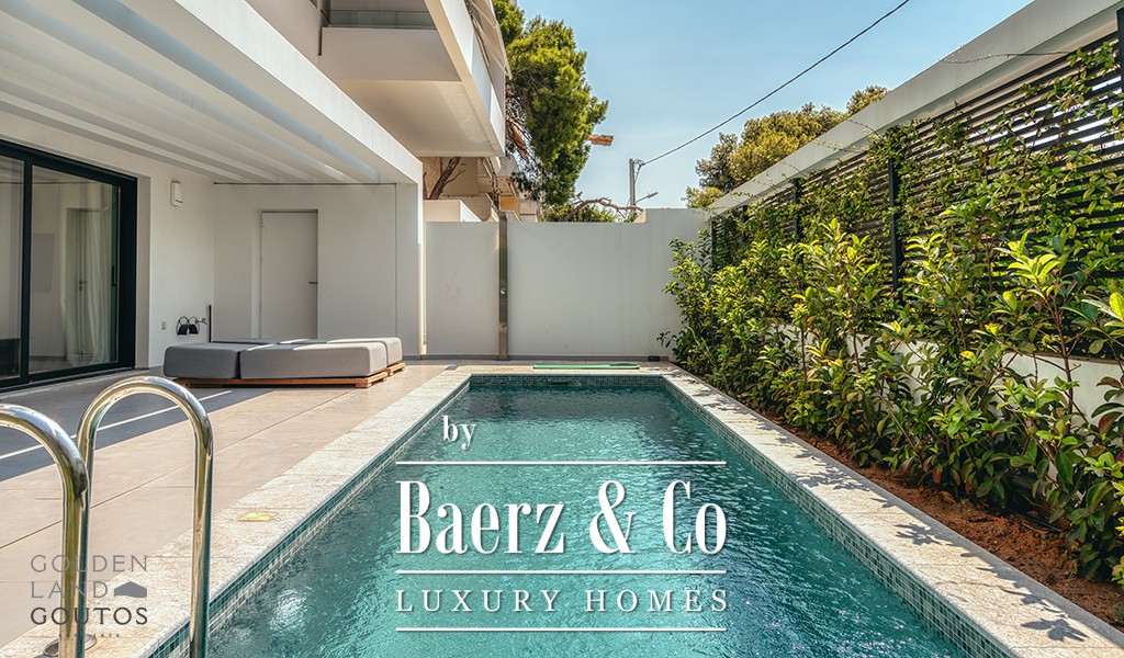 Outdoors, Maisonette Varkiza offers a generous front garden with a private swimming pool, as well as a rear grassed garden designed for contemplative calm. Every detail, from high-end finishes to the careful play of space and light, creates an atmosphere of discreet refinement. The property is further enhanced by mountain views, air conditioning, security system, modern internal staircases, and considered amenities.
