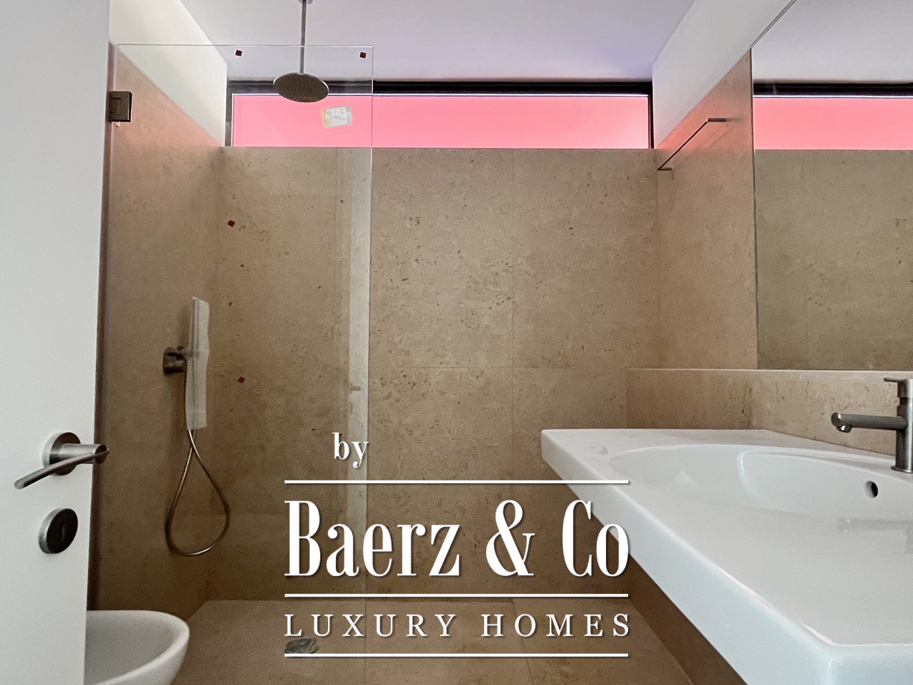Spread over two levels, the ground floor entrance hall introduces an atmosphere of clarity and calm, leading to both intimate quarters and a sculptural staircase. Four bedrooms—two en suite with closets, two additional with an elegant shared bath—face verdant outdoor scenes, while a well-appointed hallway ensures capacity and grace. The social spaces are defined by a living room oriented to the garden, where floor-to-ceiling glass and a fireplace with stove create a dialogue between interior warmth and the enveloping green. A kitchen, finished with white Silestone quartz, SMEG appliances, and an adjoining dining area, connects directly to the outdoor terraces for seamless entertaining.