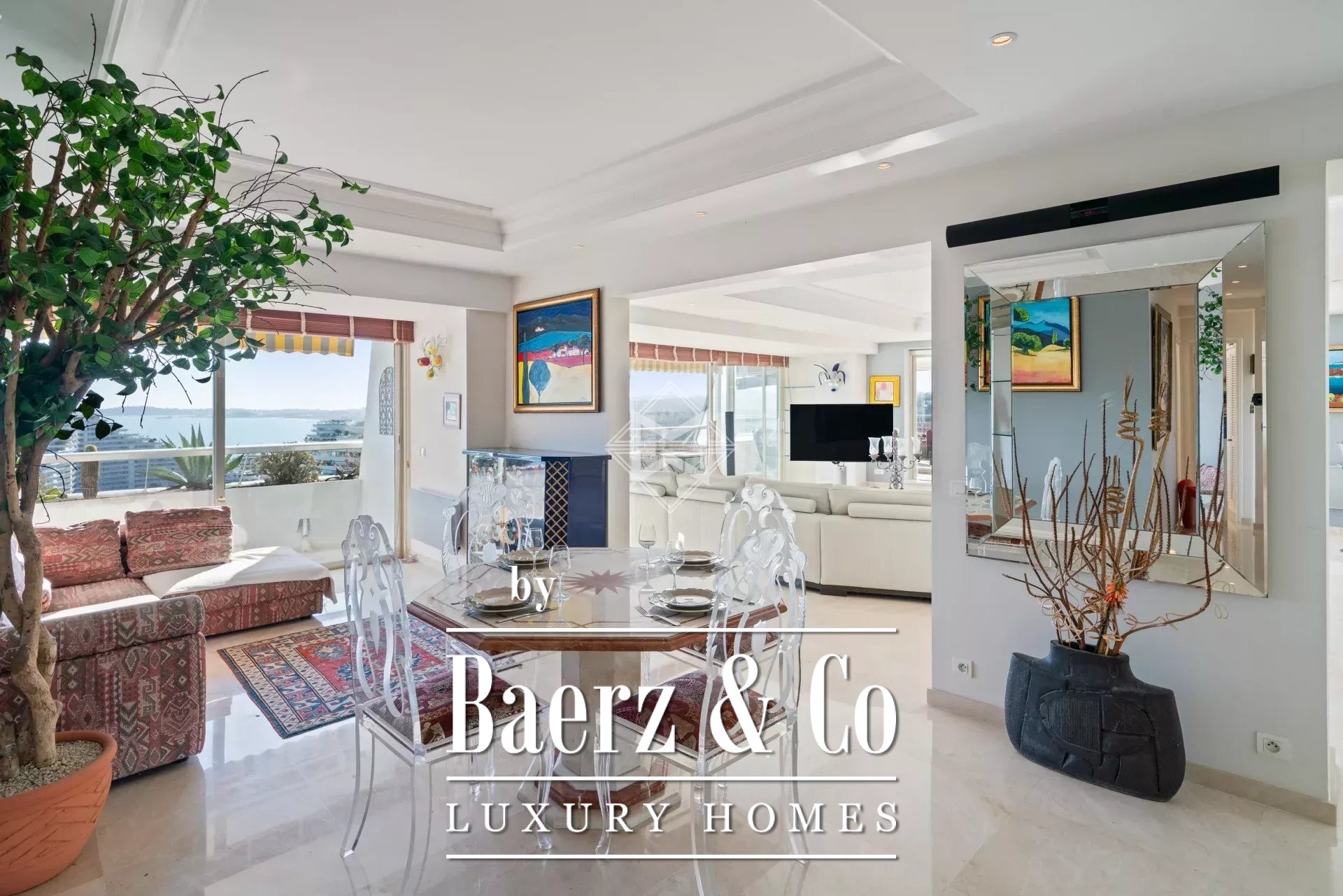 Apartment Villeneuve-Loubet offers 204 m² of modern living high above the coastline, set within a classified heritage residence. This residence, built in the 20th century and comprised of 686 lots, is positioned for breathtaking panoramic views over the Baie des Anges and the Marina port. The first impression is marked by a private entrance and a welcoming hall that unveils a luminous living space. A vast lounge and dining area flow seamlessly onto a 120 m² terrace and a south-facing balcony, framing an ever-changing seascape.