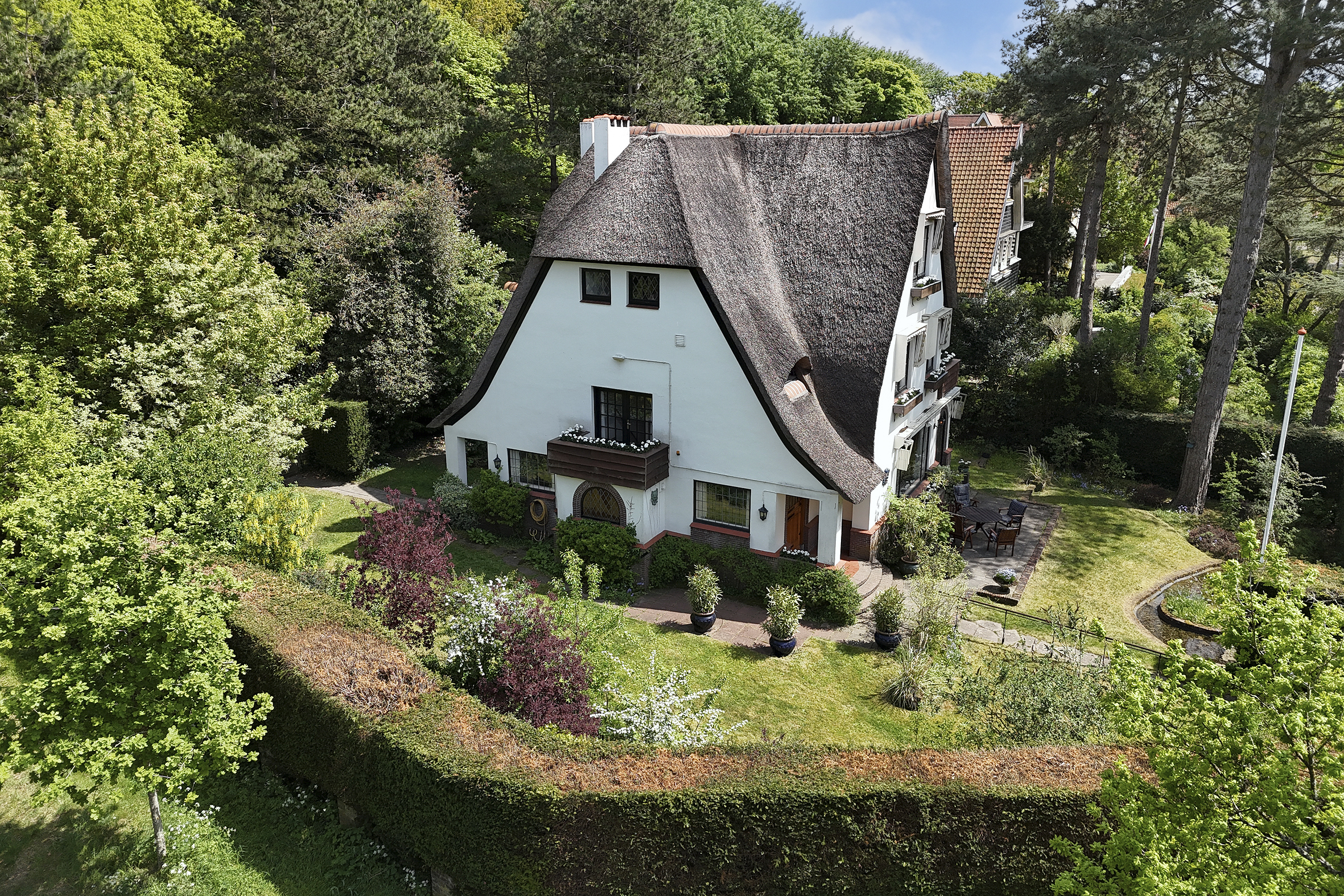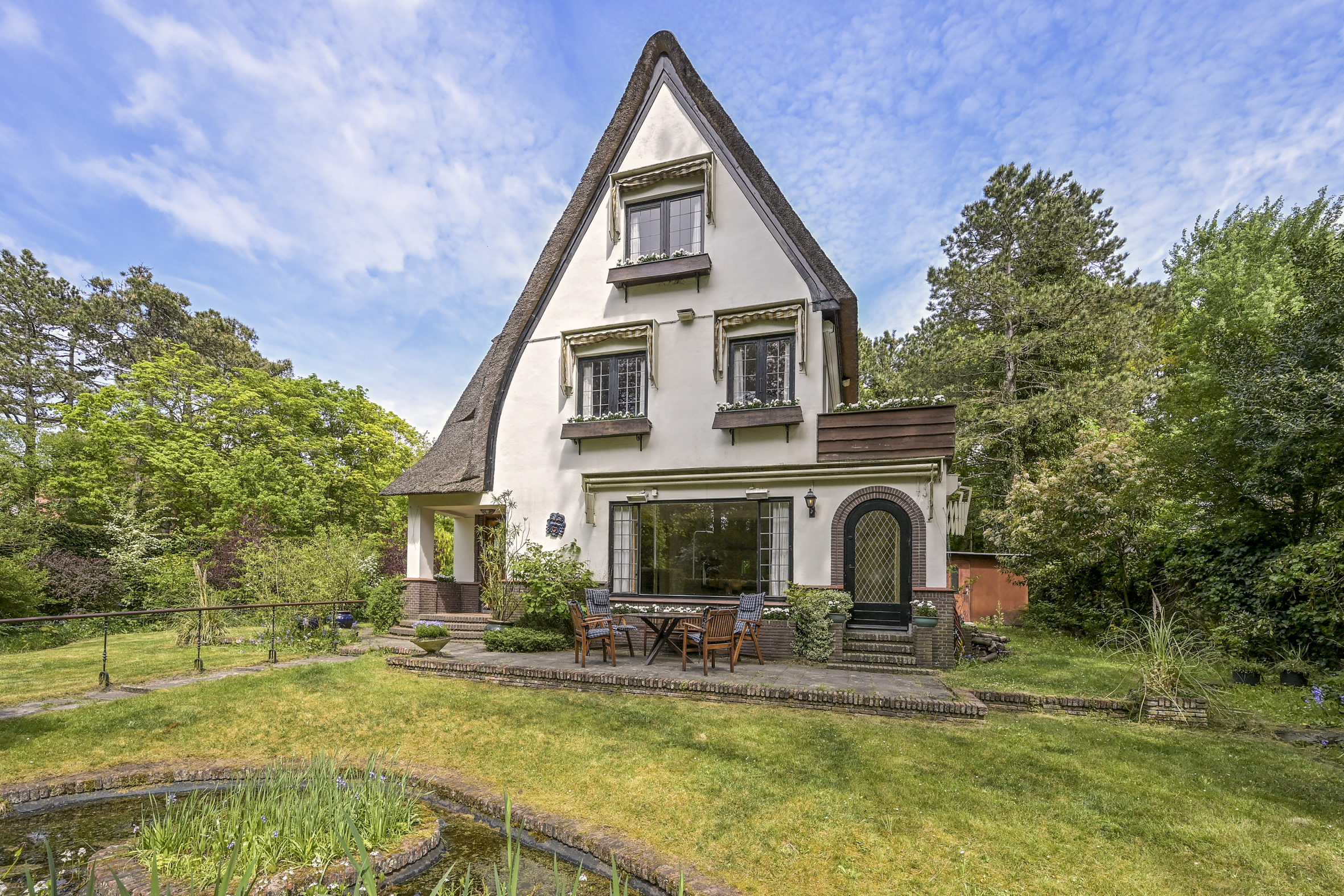 Set in a wonderful location near the Meijendel nature reserve—ideal for outdoor enthusiasts—this charming and very bright detached villa with thatched roof (approx. 237 m²) is situated on a sunny, private plot of 1000 m². The home is full of attractive style elements, including a solid oak front door, oak stair finishes, and oak parquet flooring throughout.