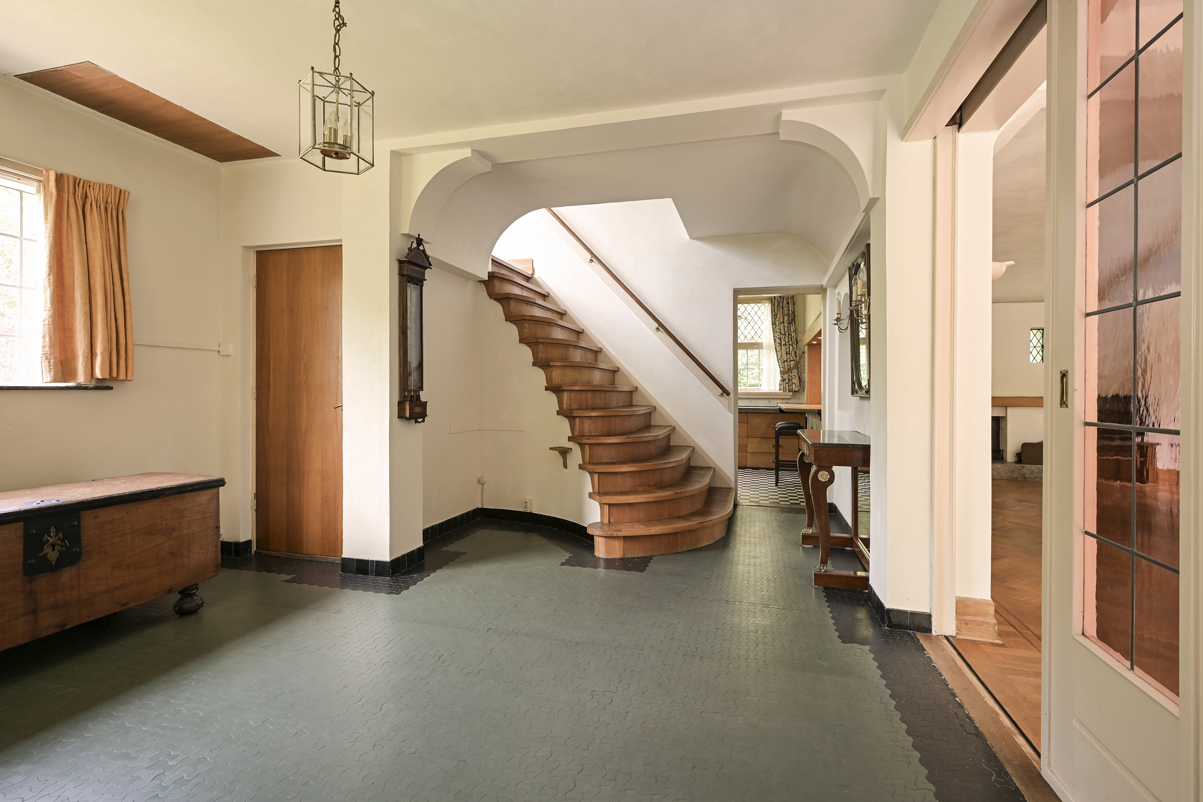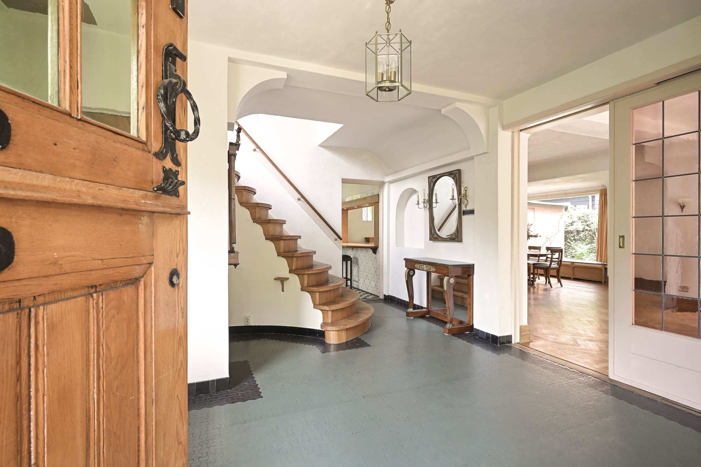 Entrance into a spacious reception hall with a beautifully laid mosaic floor, an impressive staircase, and a simple WC with a small sink. Double sliding doors with stained glass windows lead into the spacious and bright living/dining room featuring oak parquet floors, a fireplace, marble windowsills, and access to the sunny garden.
