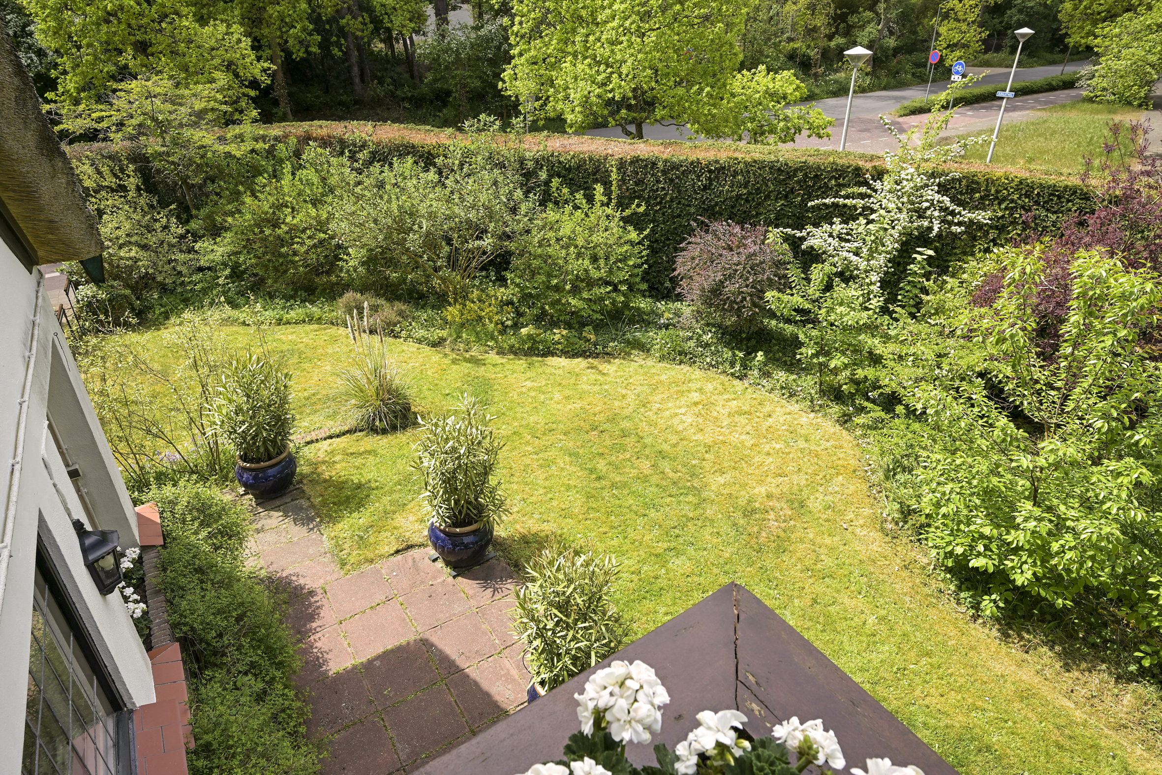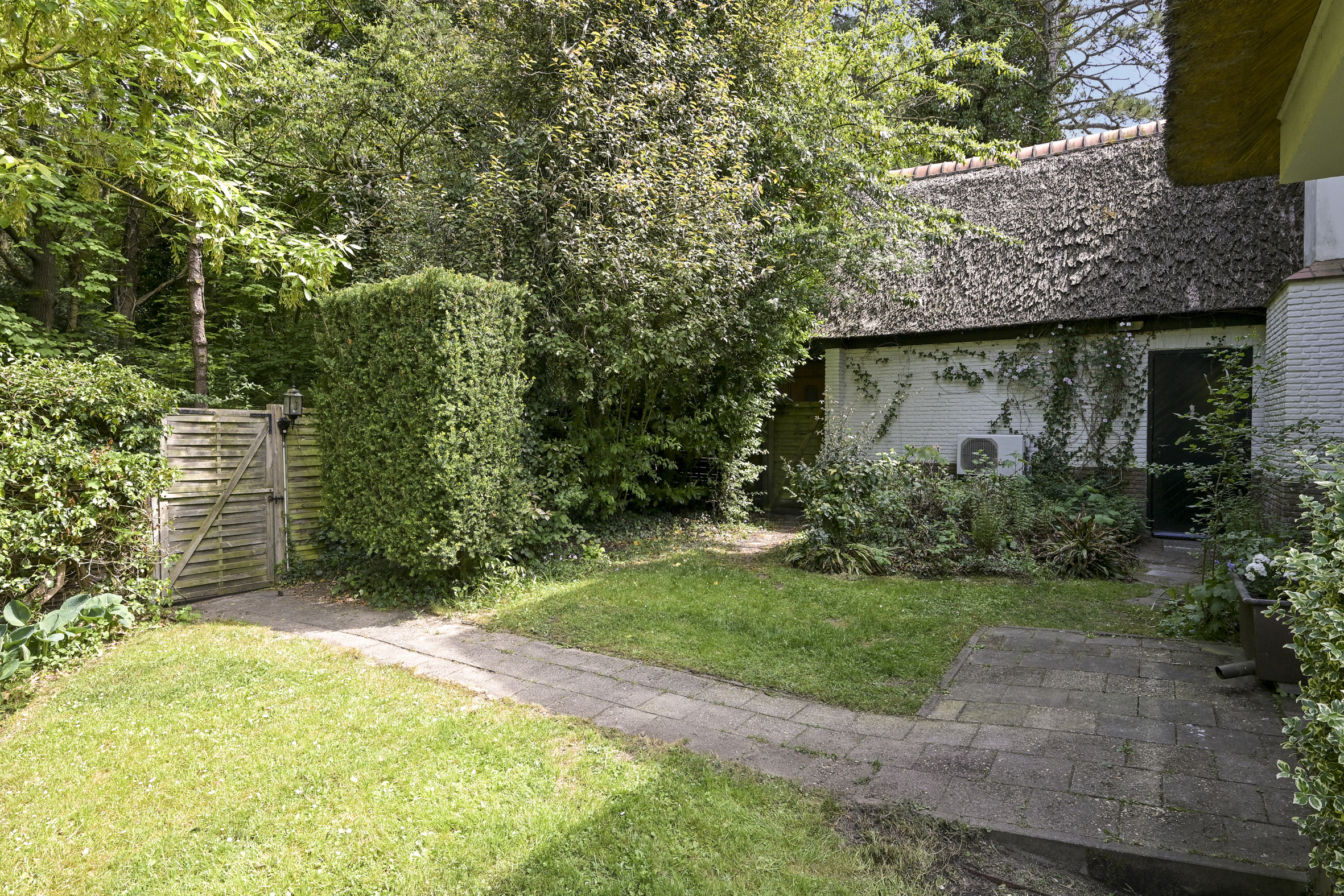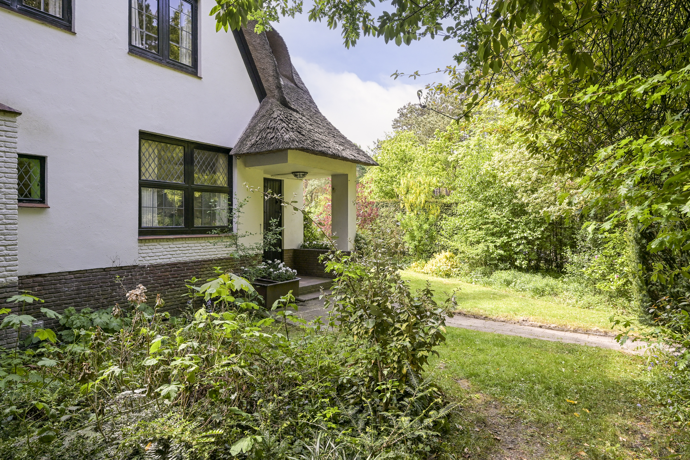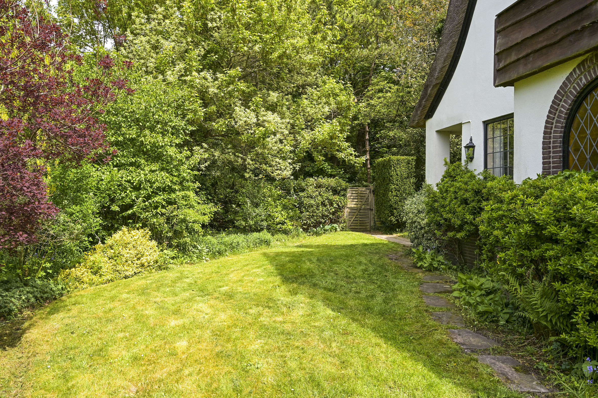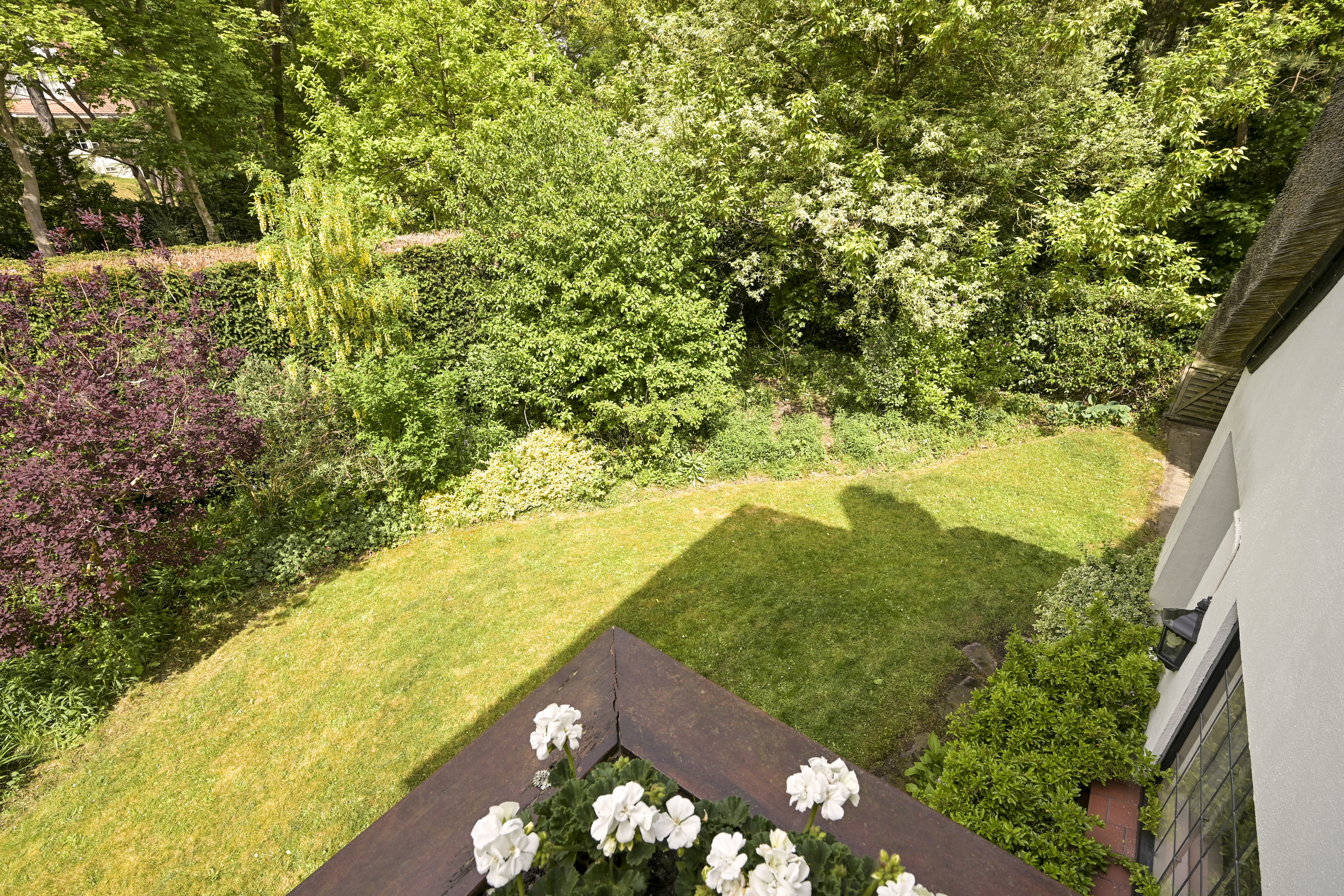 The garden wraps halfway around the house and is very sunny due to its free and open setting. In addition to the original garage, which was once connected to the dining room and could easily be reintegrated into the house, a newer, large garage has been added to the plot. This garage is suitable for many purposes, has an automatic overhead door, and provides passage to the back garden.