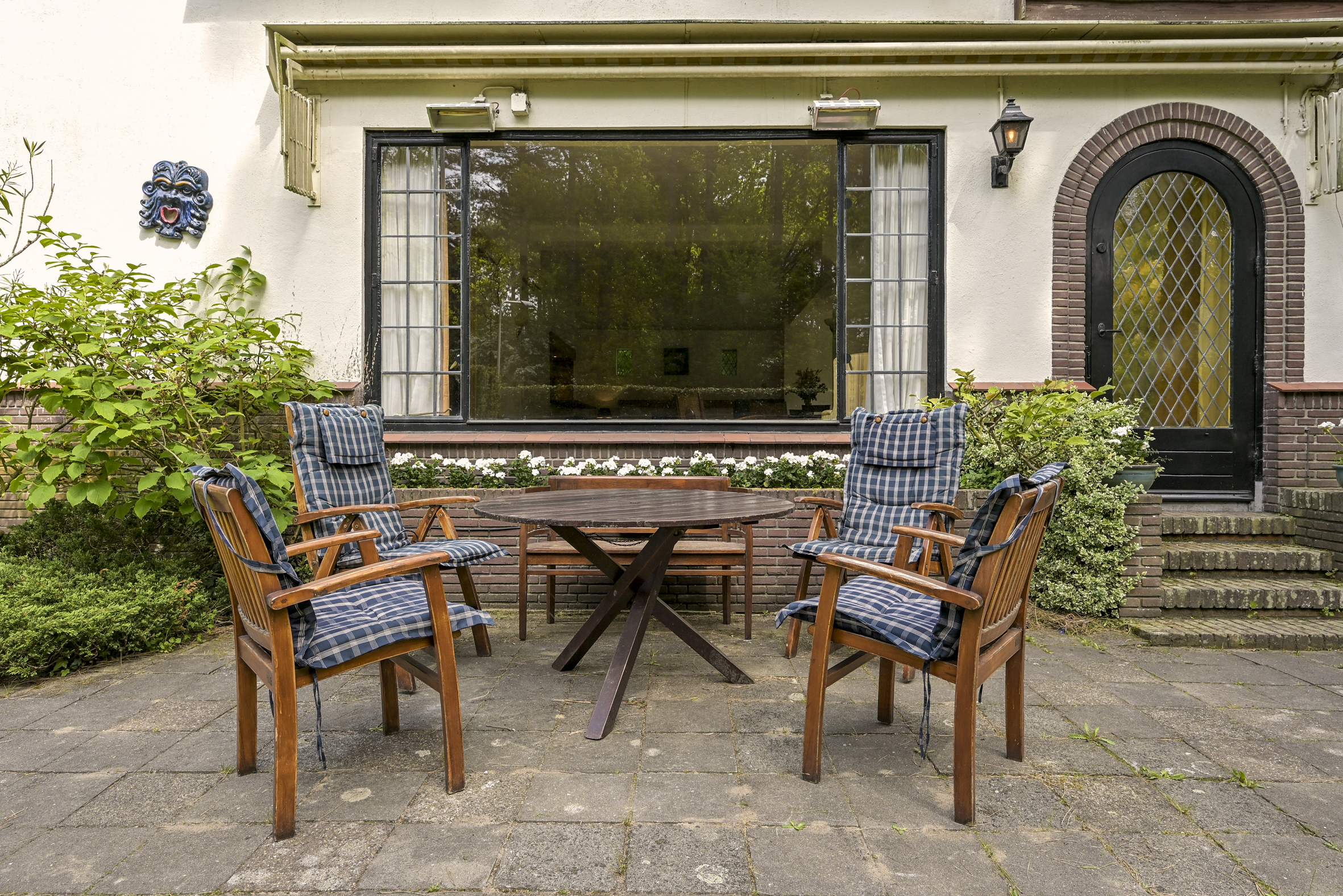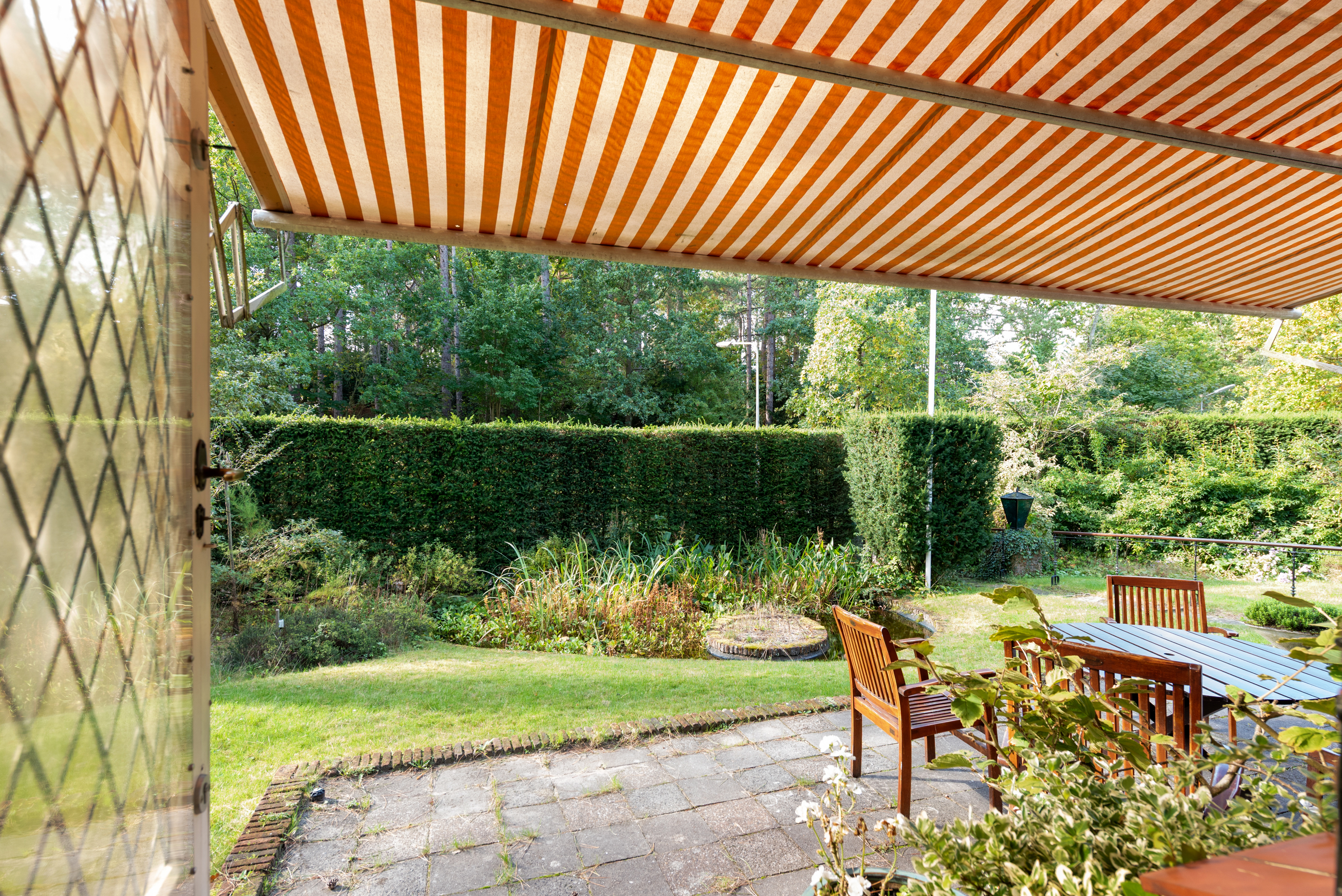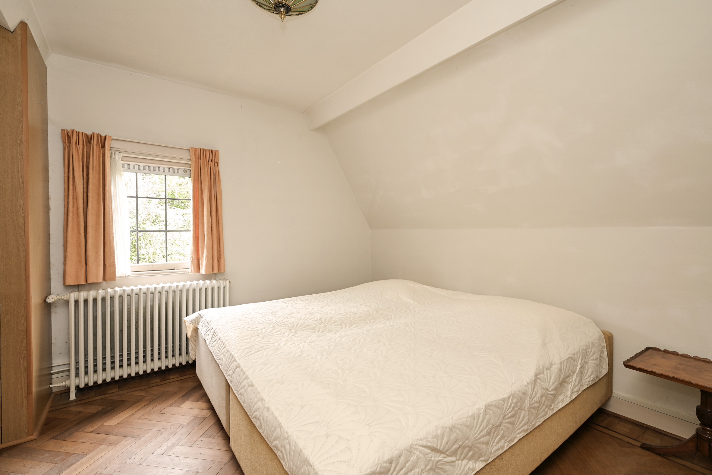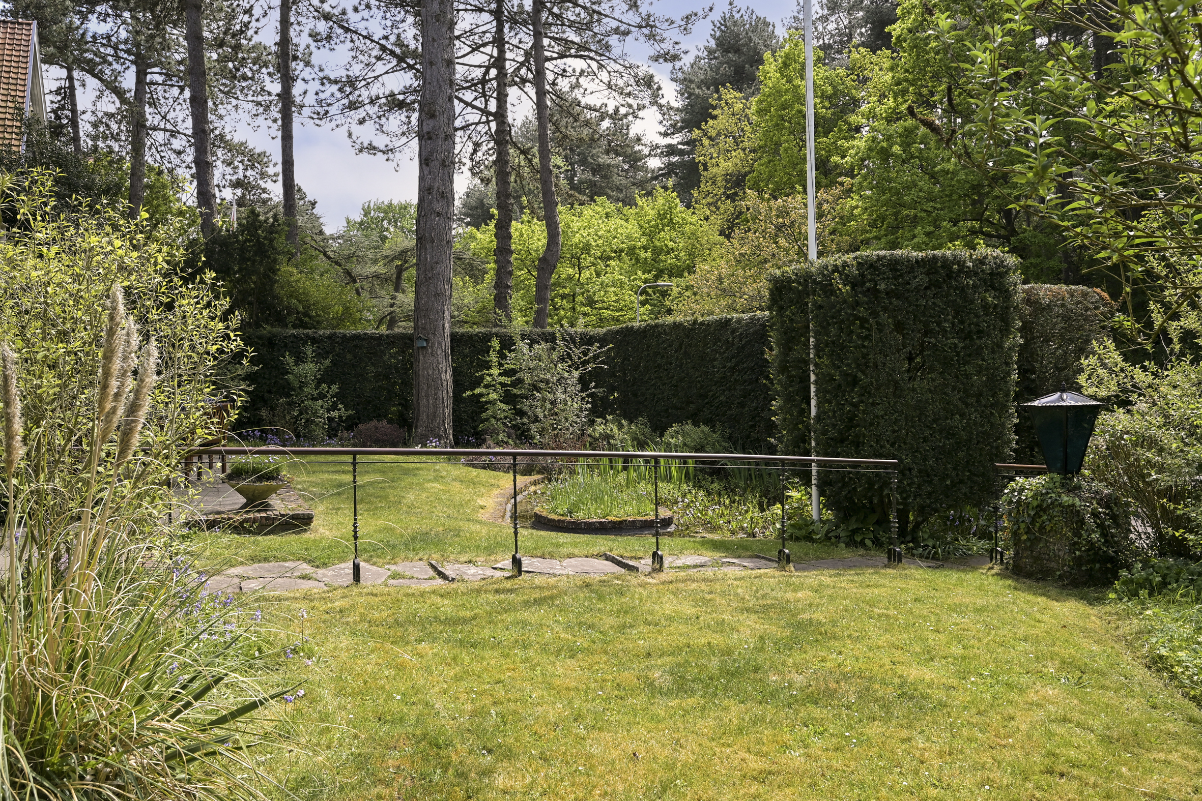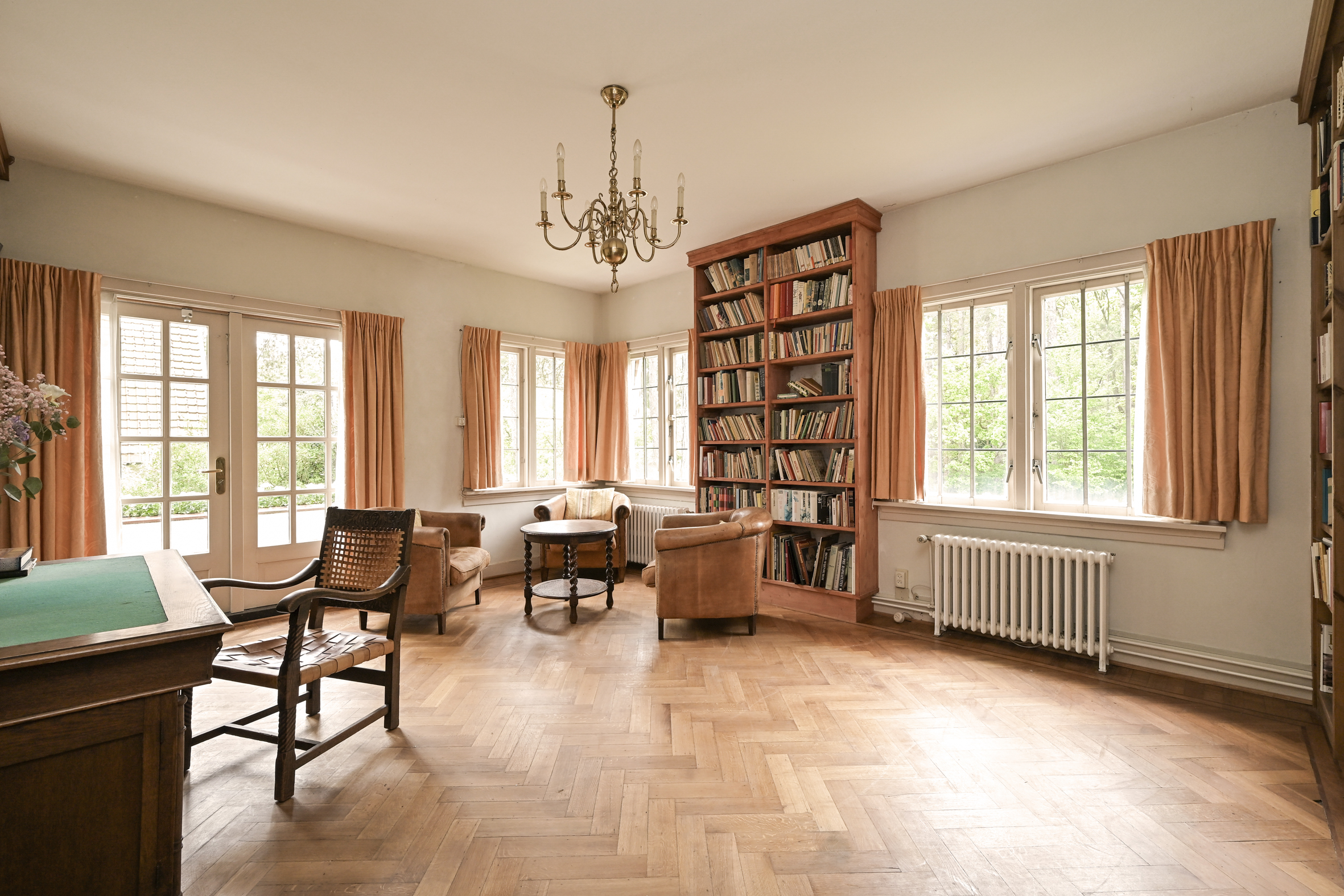 The garden wraps halfway around the house and is very sunny due to its free and open setting. In addition to the original garage, which was once connected to the dining room and could easily be reintegrated into the house, a newer, large garage has been added to the plot. This garage is suitable for many purposes, has an automatic overhead door, and provides passage to the back garden.