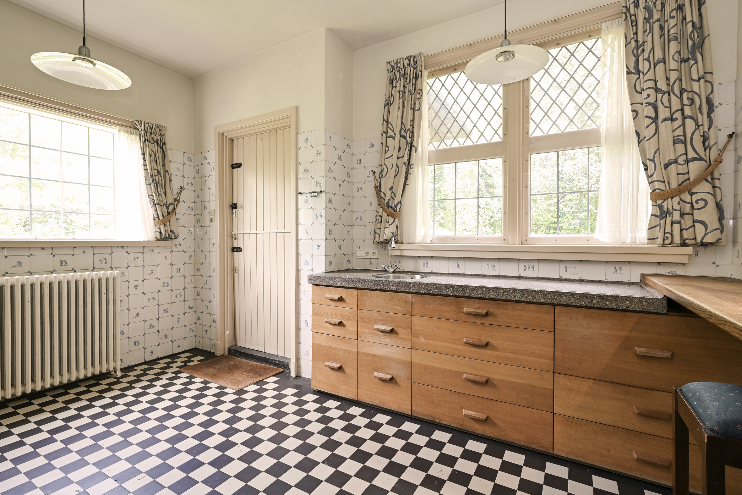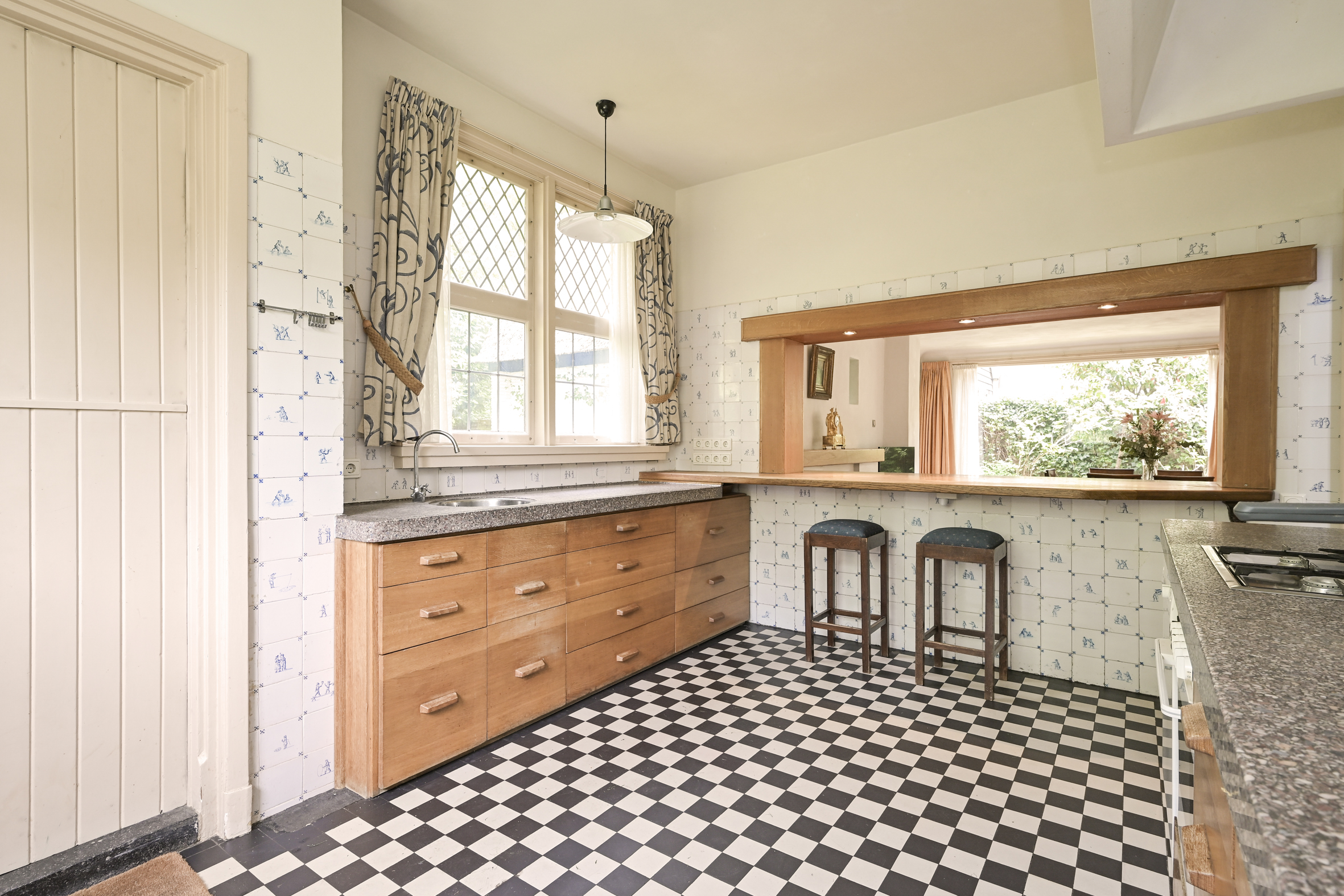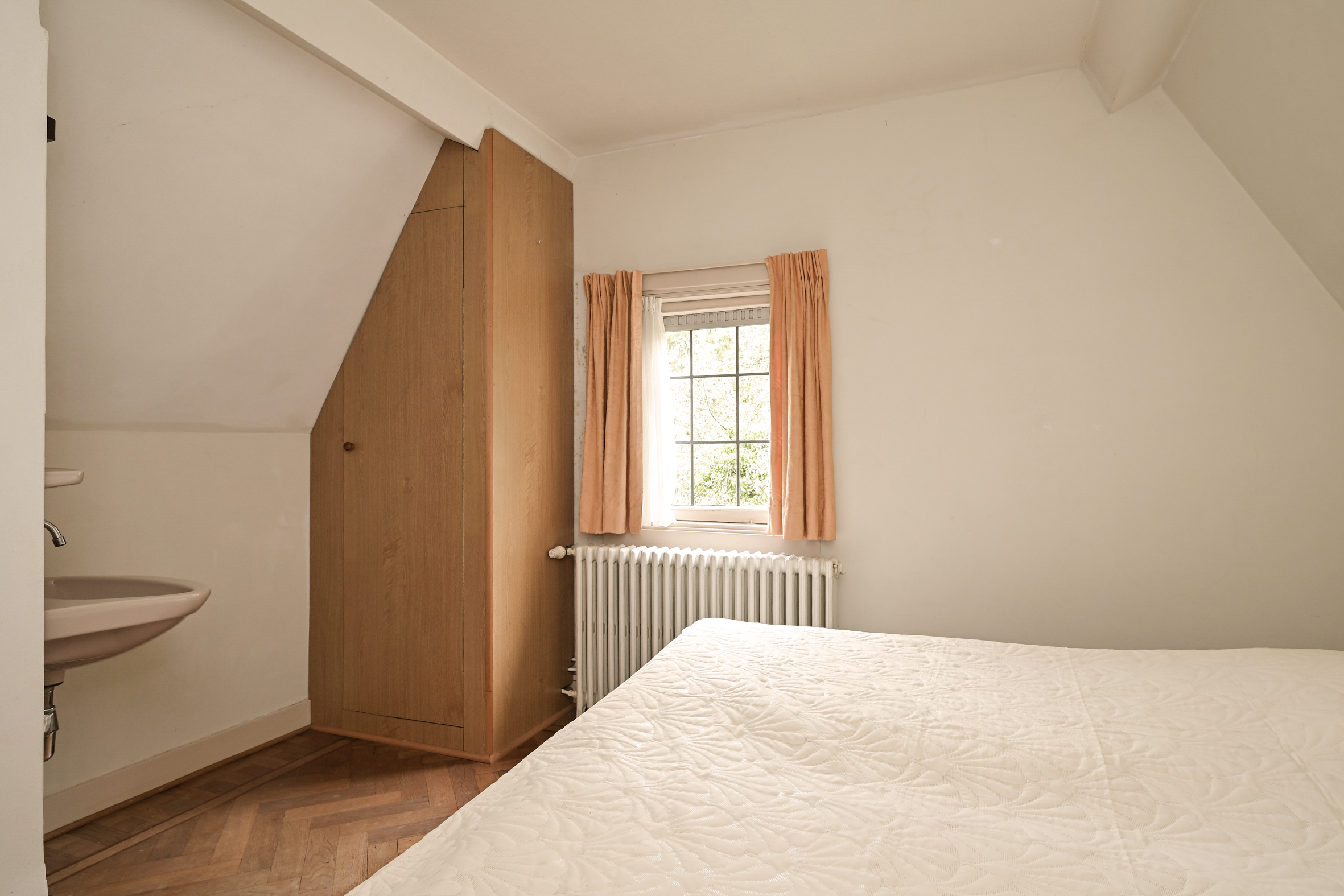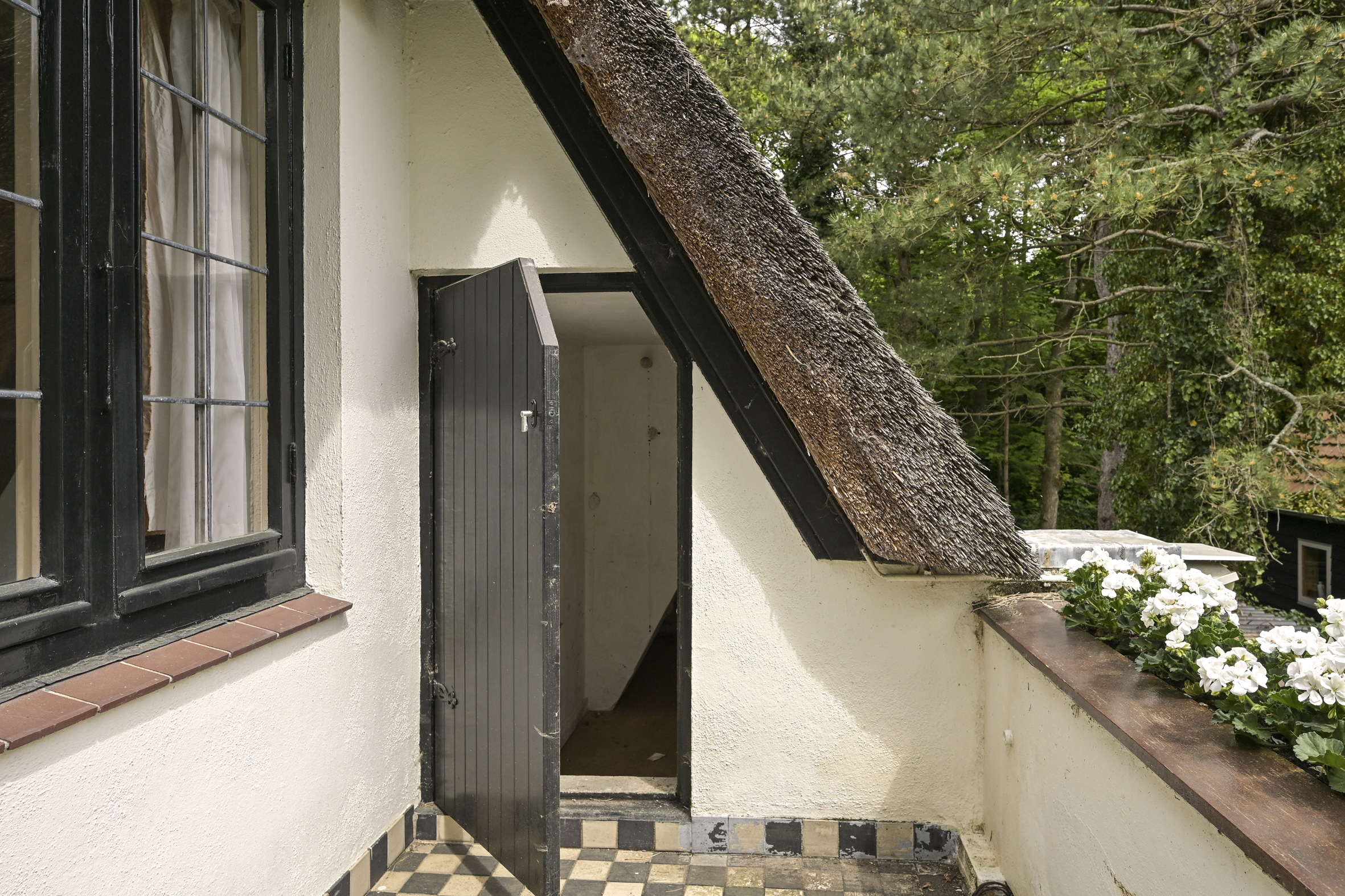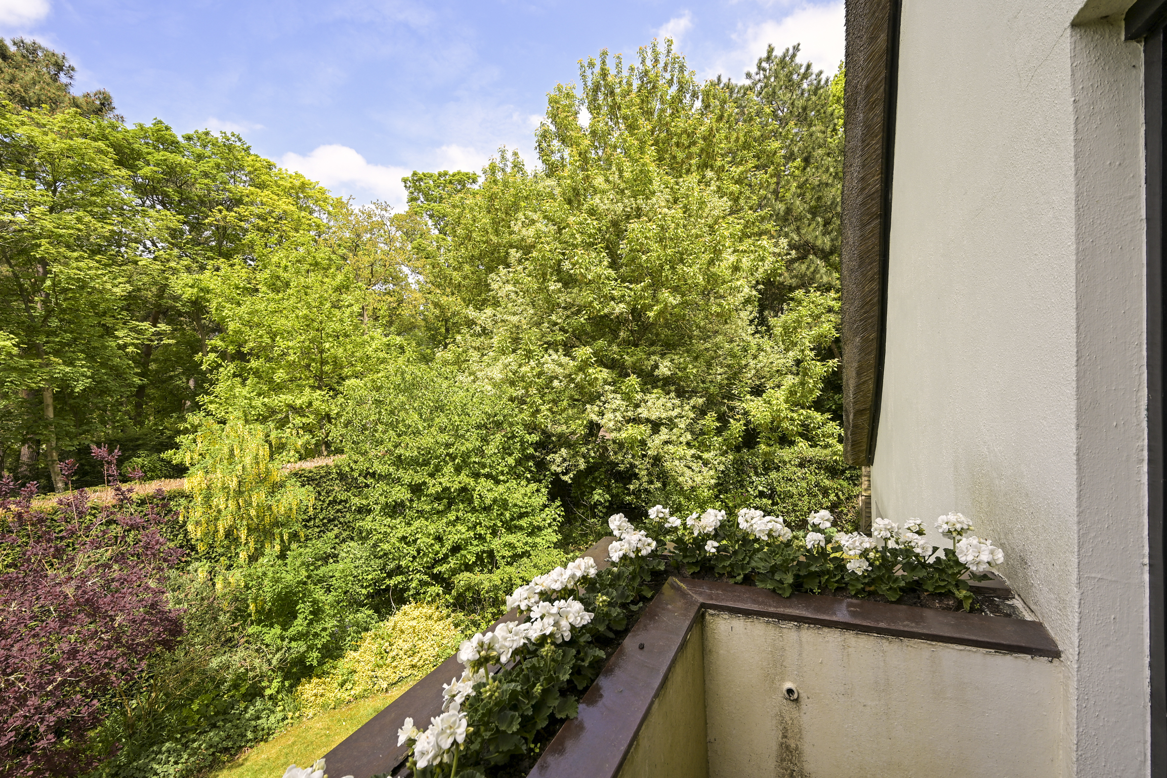 The garden wraps halfway around the house and is very sunny due to its free and open setting. In addition to the original garage, which was once connected to the dining room and could easily be reintegrated into the house, a newer, large garage has been added to the plot. This garage is suitable for many purposes, has an automatic overhead door, and provides passage to the back garden.