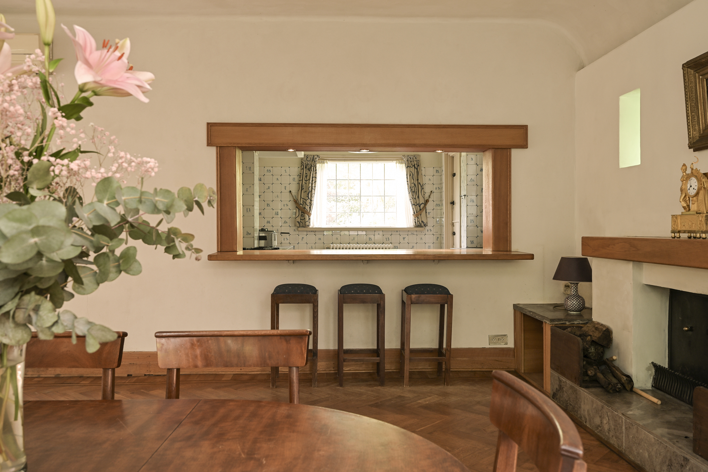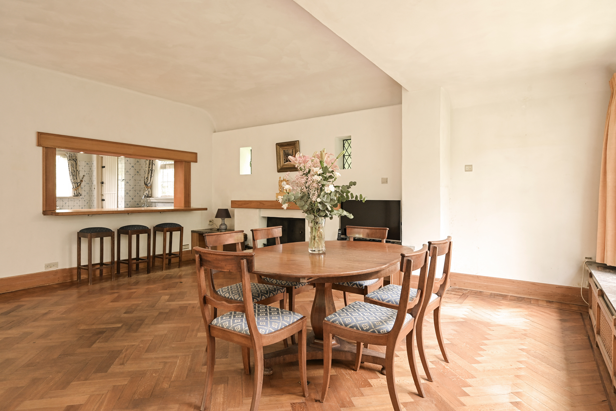 From the central hallway, you enter the large, well-maintained kitchen, which has a semi-open layout connecting it with the dining room. The kitchen also has a back entrance and an adjoining utility room that provides access to the cellar, which consists of three practical rooms.