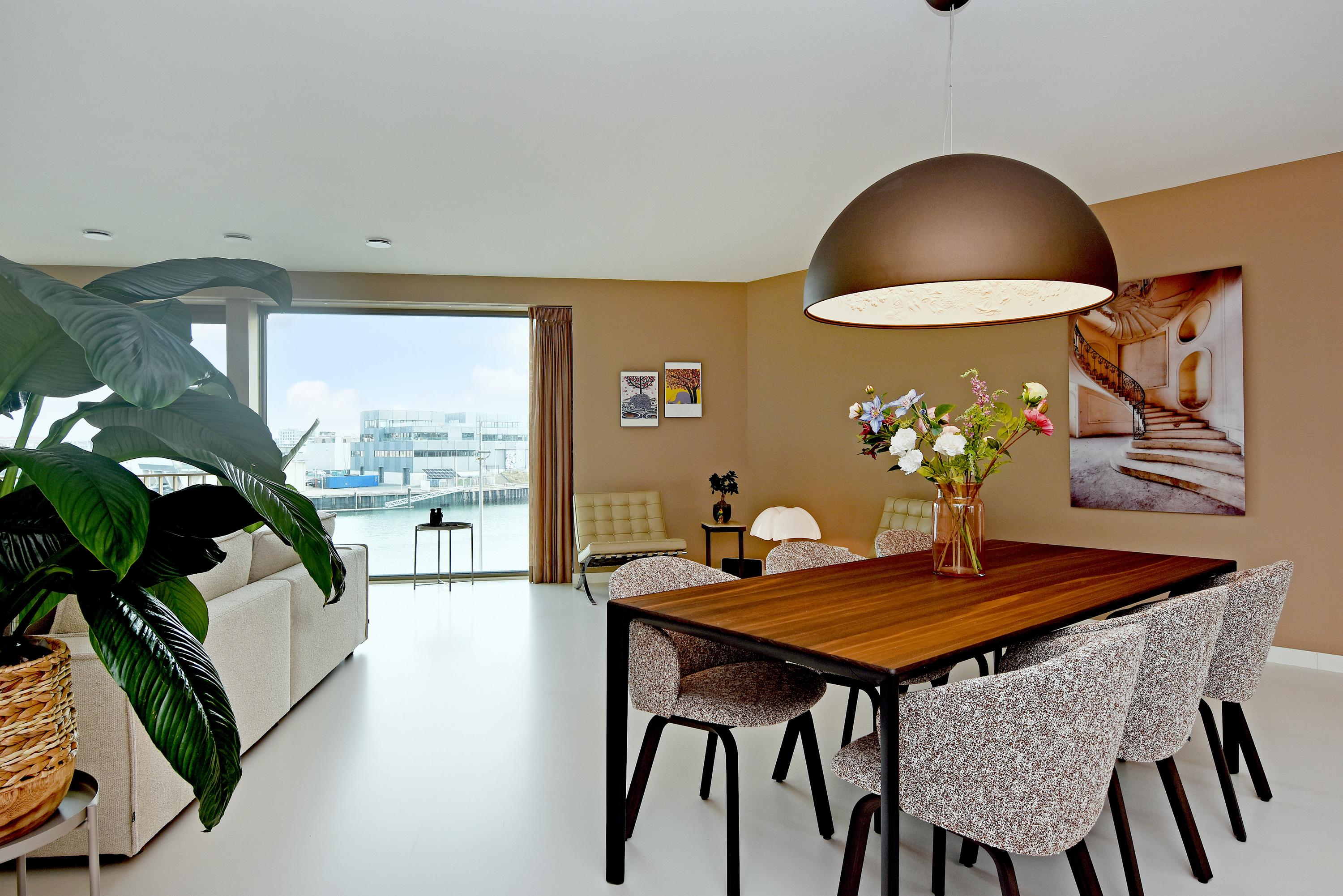 De royale hal leidt u naar een indrukwekkende, open leefruimte waar woonkamer en keuken op natuurlijke wijze in elkaar overlopen. De raampartijen van vloer tot plafond bieden een panoramisch uitzicht op de haven en zee – een echte eyecatcher die direct de sfeer bepaalt. De gigantische schuifpui aan de havenkant brengt buiten hier echt naar binnen. Dit maakt koffie drinken in de ochtendzon een heerlijk rustmoment van de dag.