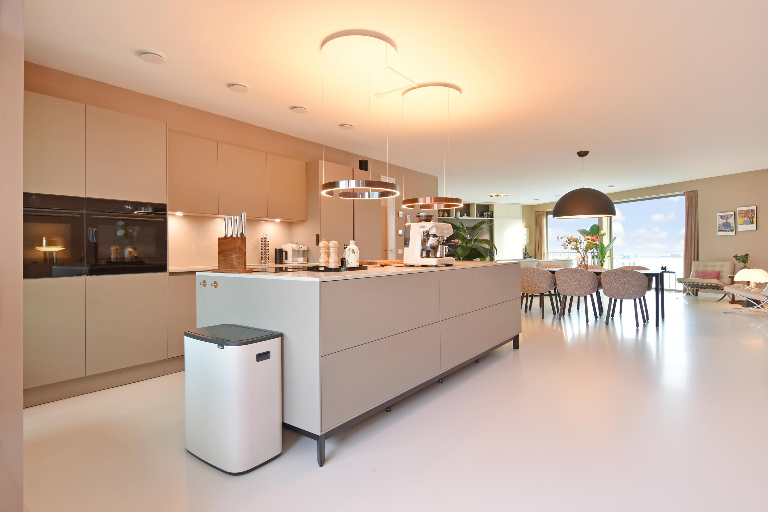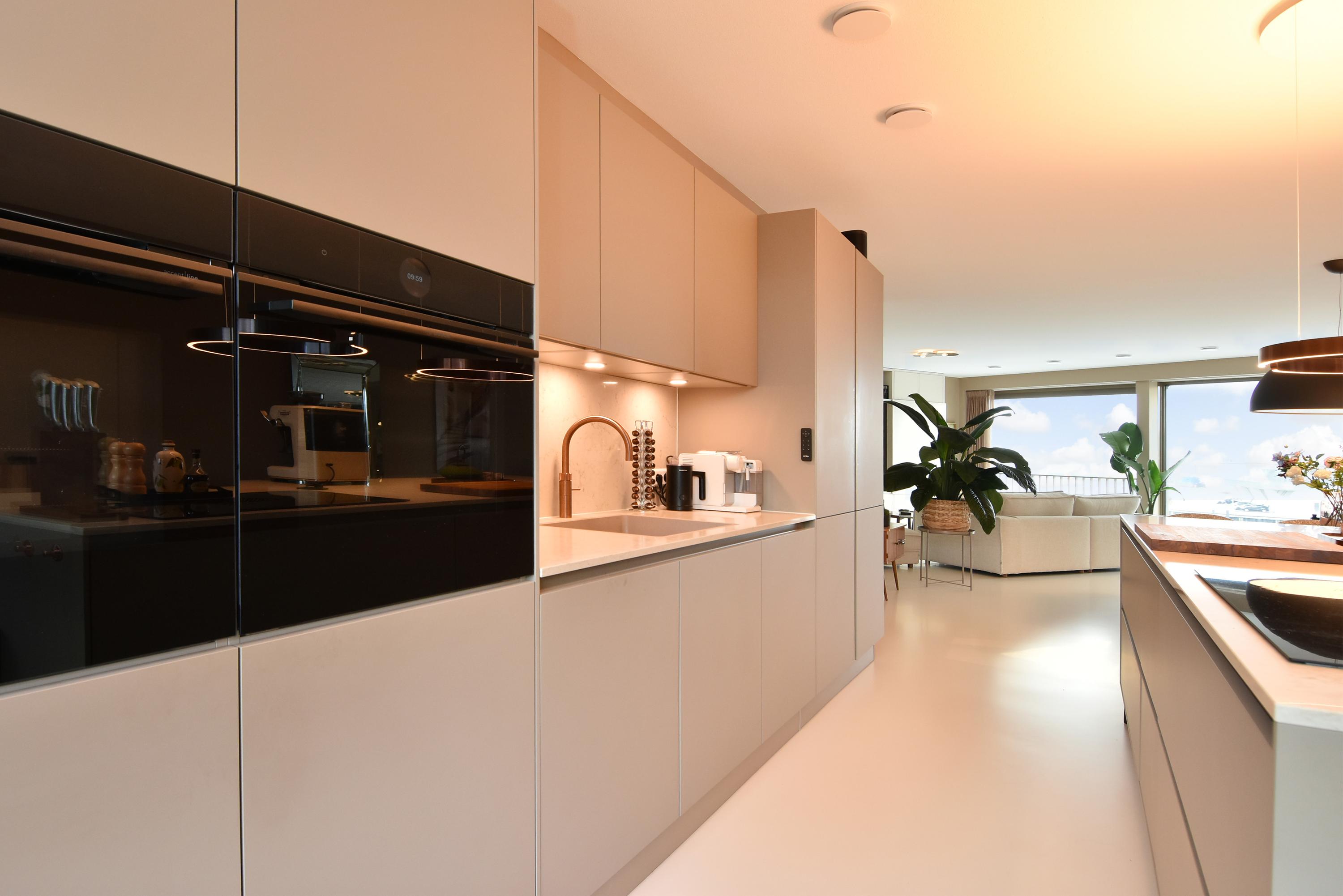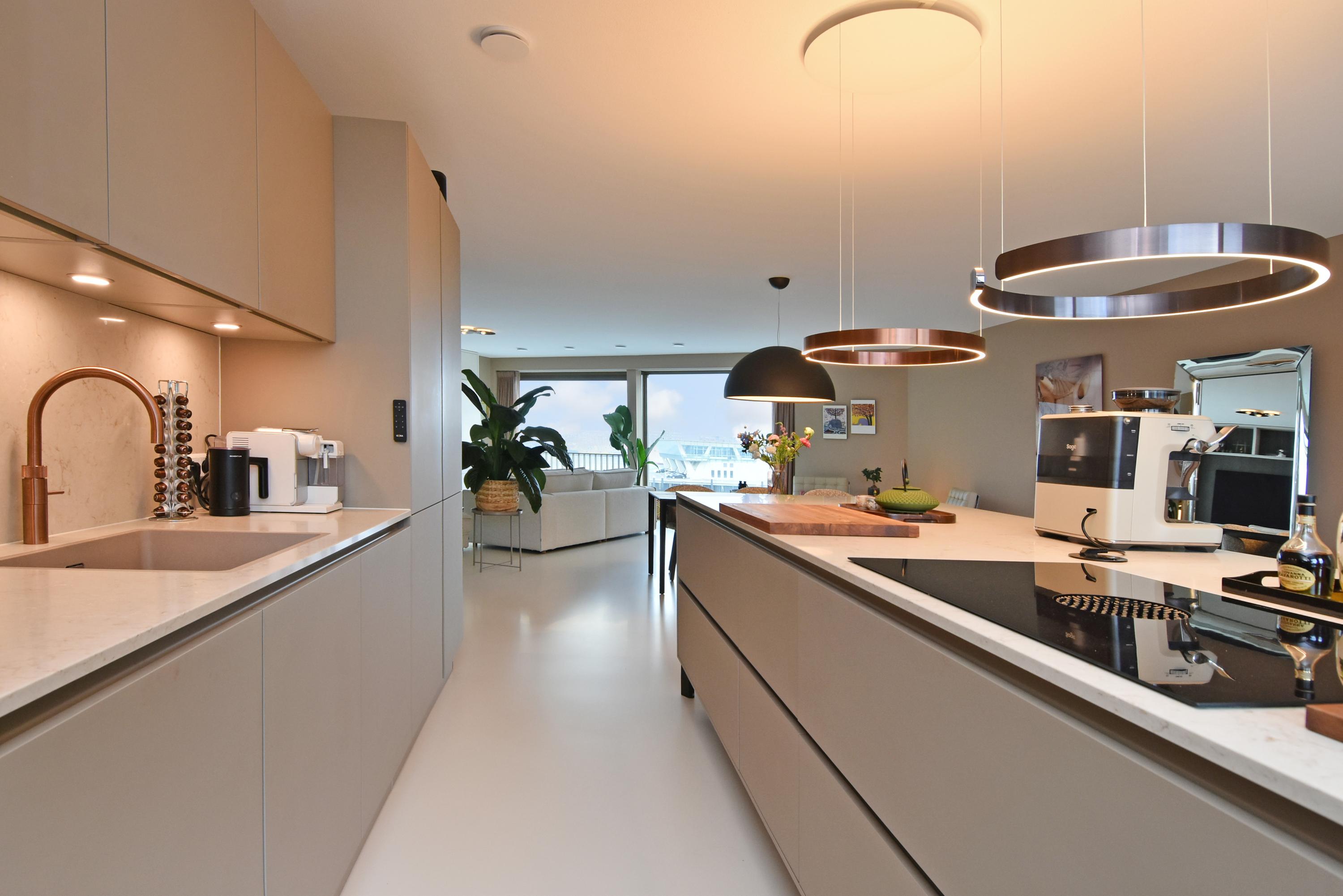 Aan de voorzijde bevindt zich het zitgedeelte met een stijlvolle, op maat gemaakte kastenwand met afsluitbare werkplek. Aan de achterzijde ligt de designkeuken met kookeiland en alle denkbare luxe inbouwapparatuur, waaronder een inductiekookplaat met geïntegreerde afzuiging, Quooker, vaatwasser, combi-oven, ruime koelkast en aparte ruime vriezer. Vanuit de keuken opent de grote schuifpui naar het riante balkon, waar u in alle rust kunt genieten van de middag- en avondzon.