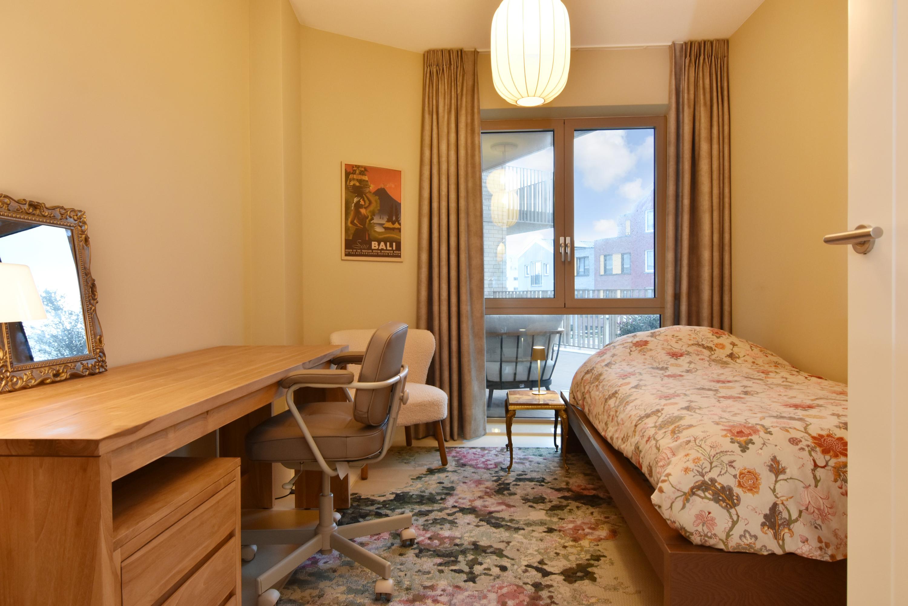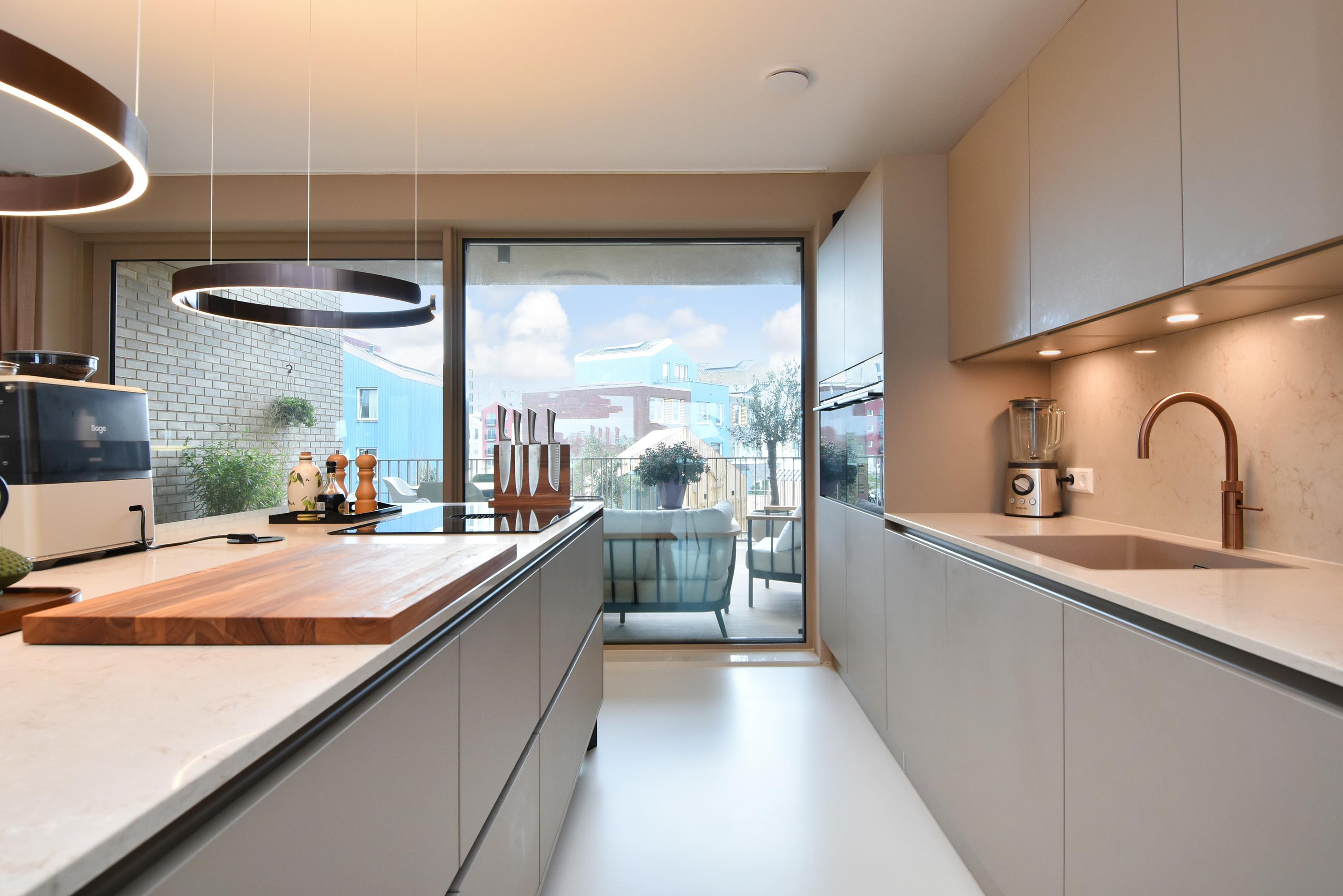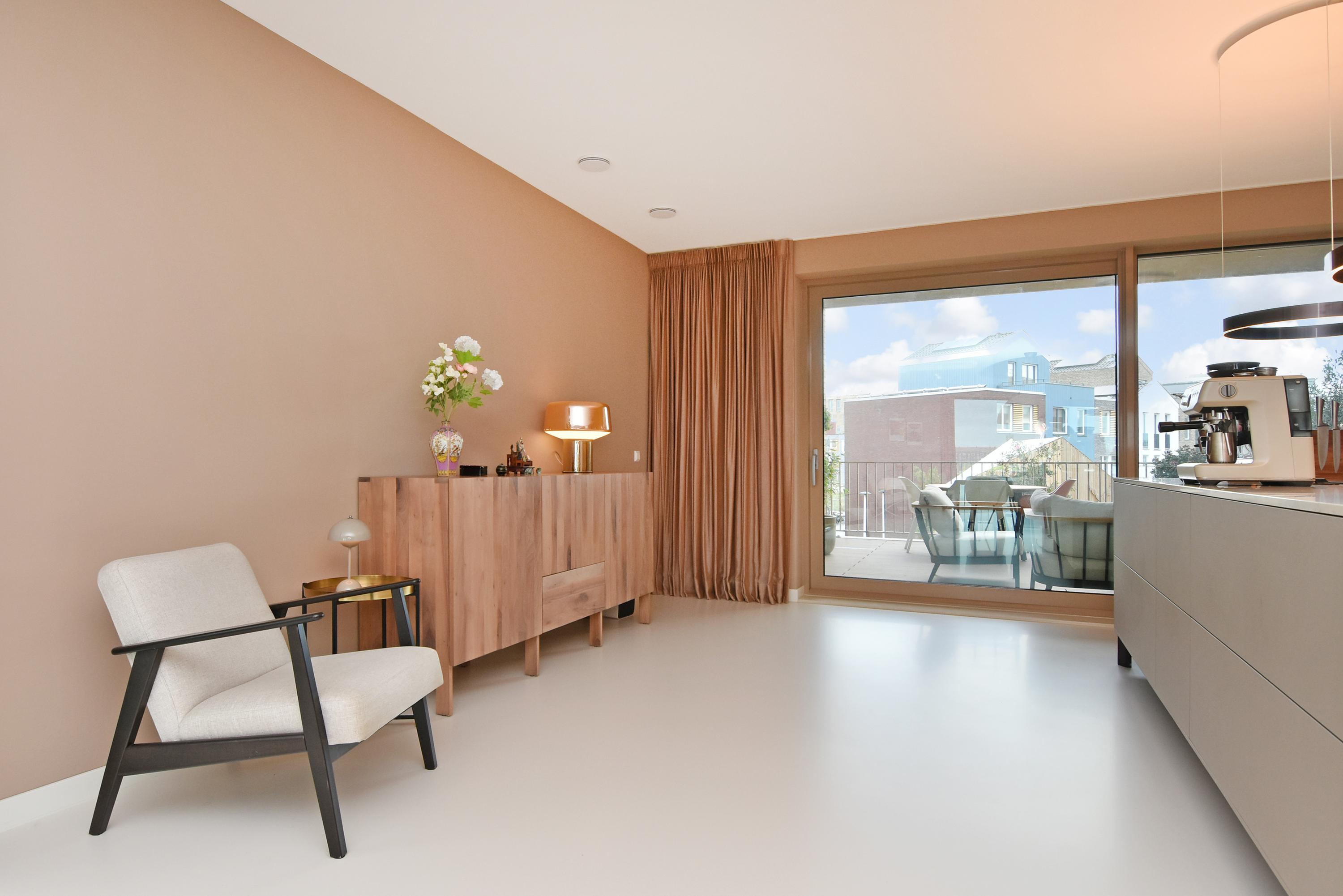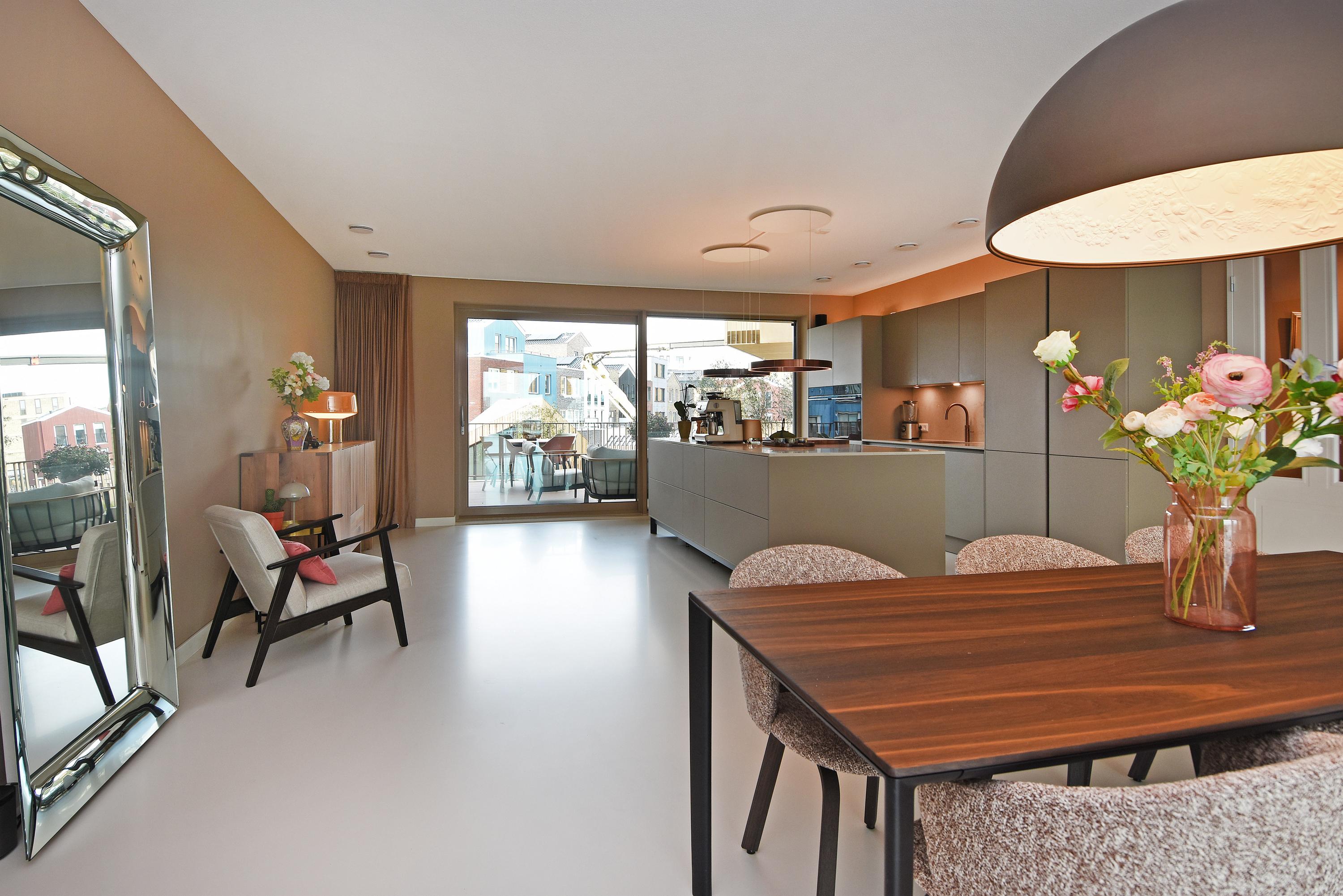 Aan de voorzijde bevindt zich het zitgedeelte met een stijlvolle, op maat gemaakte kastenwand met afsluitbare werkplek. Aan de achterzijde ligt de designkeuken met kookeiland en alle denkbare luxe inbouwapparatuur, waaronder een inductiekookplaat met geïntegreerde afzuiging, Quooker, vaatwasser, combi-oven, ruime koelkast en aparte ruime vriezer. Vanuit de keuken opent de grote schuifpui naar het riante balkon, waar u in alle rust kunt genieten van de middag- en avondzon.