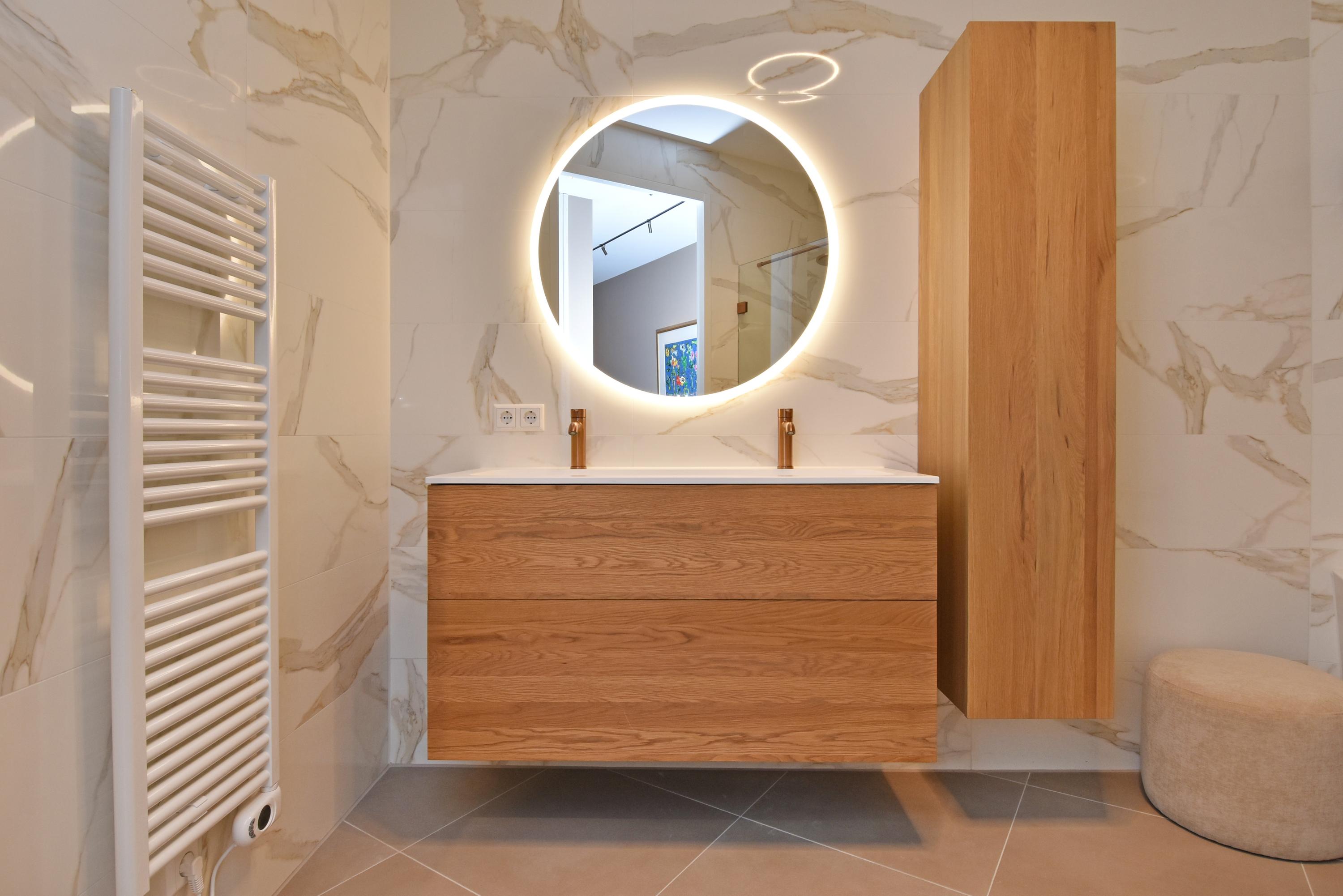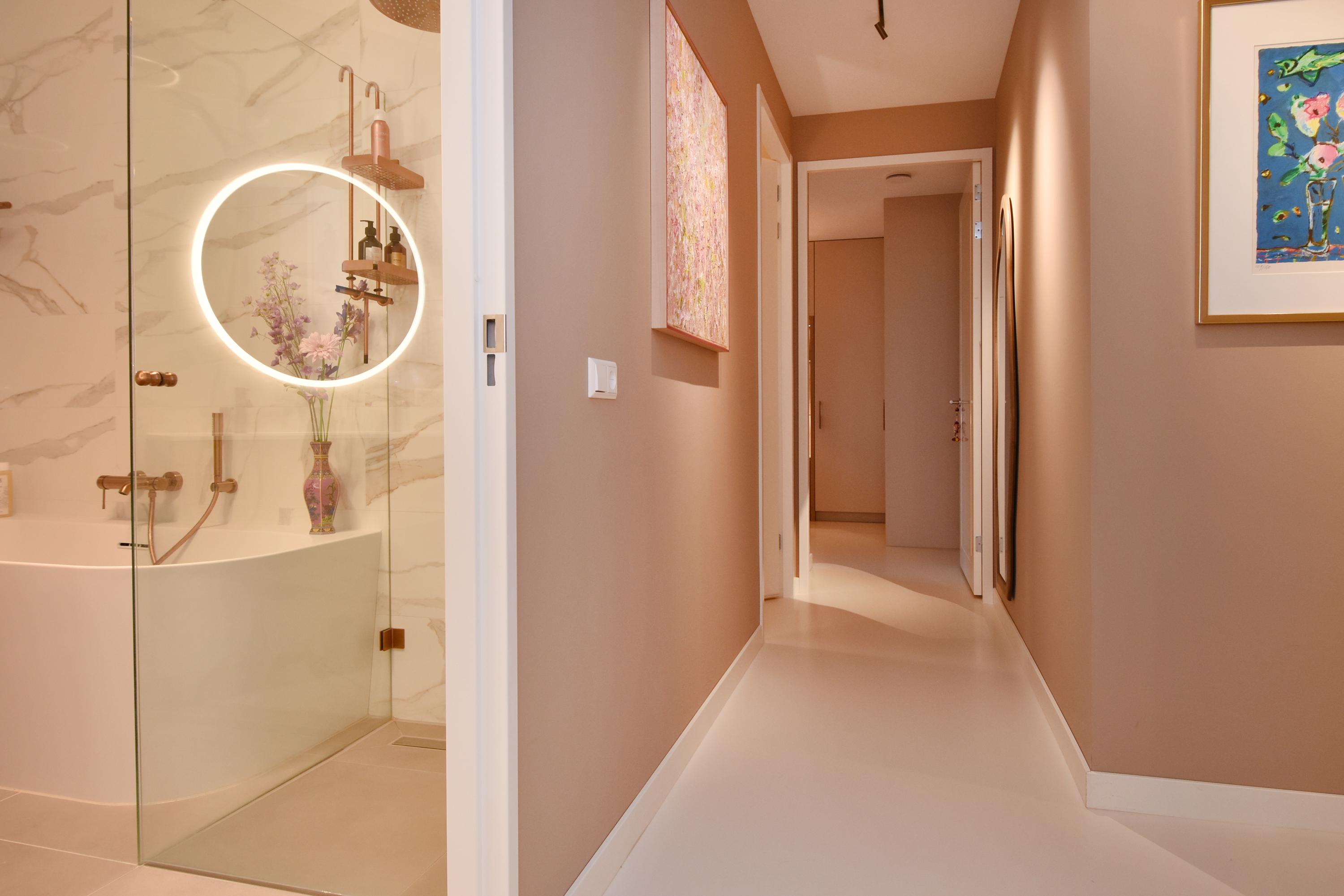 De moderne badkamer is ingericht volgens de laatste trends en voorzien van een inloopdouche, stijlvol wastafelmeubel en ligbad. Daarnaast is er een separaat toilet en een praktische berging met op maat gemaakte kast voor wasmachine en droger. Verder bevinden zich hier de WTW-unit en warmtepomp.