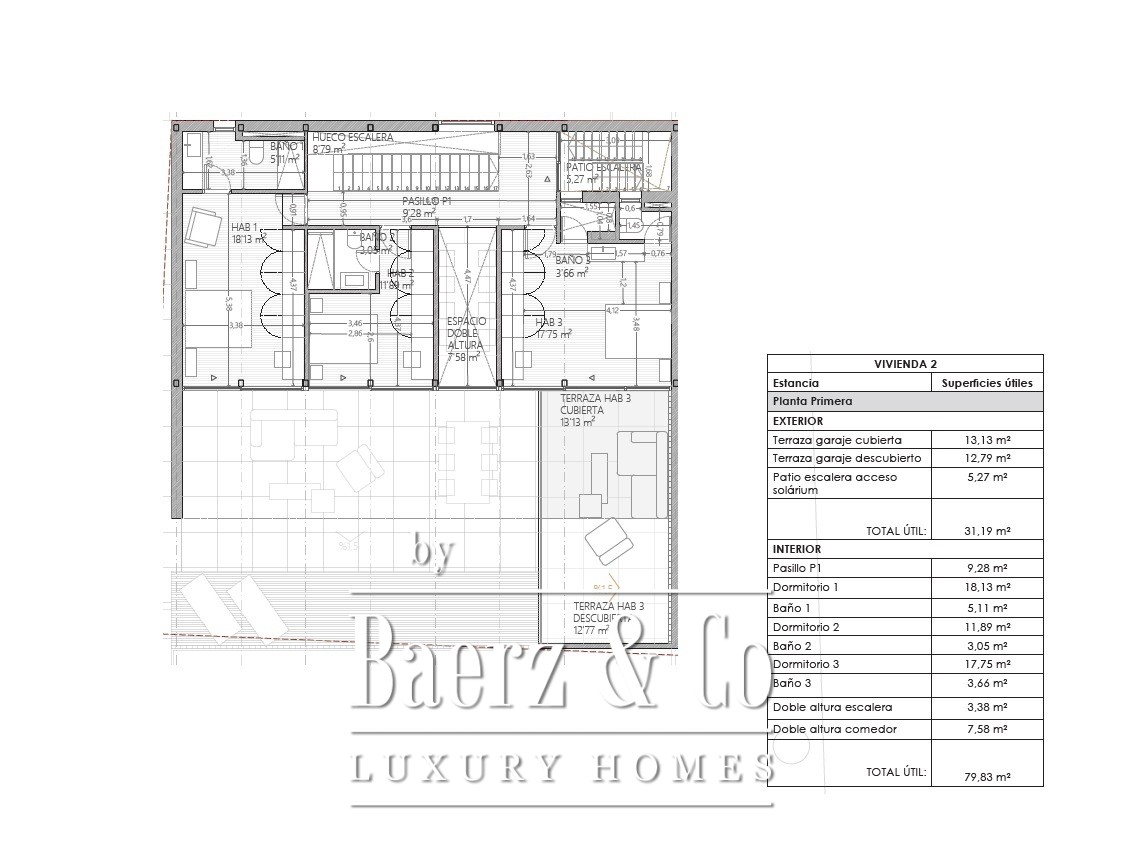De bovenverdieping herbergt drie slaapkamers met eigen badkamer, allemaal met toegang tot een privéterras, en een spectaculair solarium met indrukwekkend panoramisch uitzicht op Puig Campana, Sierra Bernia en Sierra Helada.