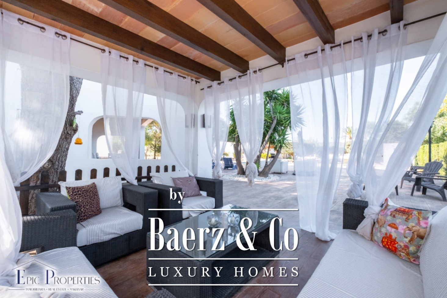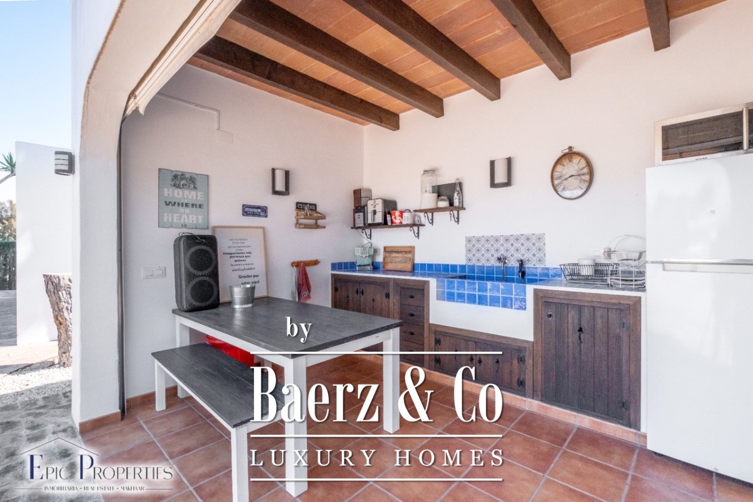 De buitenruimte is een waar mediterraan paradijs met fruitbomen (sinaasappel-, citroen-, peren- en appelbomen, onder andere) en een automatisch irrigatiesysteem dat wordt gevoed door een eigen put. Er is ook een groot zwembad van 12x6 meter, perfect om van het klimaat te genieten, en een tennisbaan die ideaal is om actief te blijven zonder het huis te verlaten. Naast het zwembad bevinden zich vier aparte gebouwen in Ibizaanse stijl, waaronder een buitenkeuken, een complete badkamer, een eetruimte buiten en een loungezone met barbecue en houtoven.