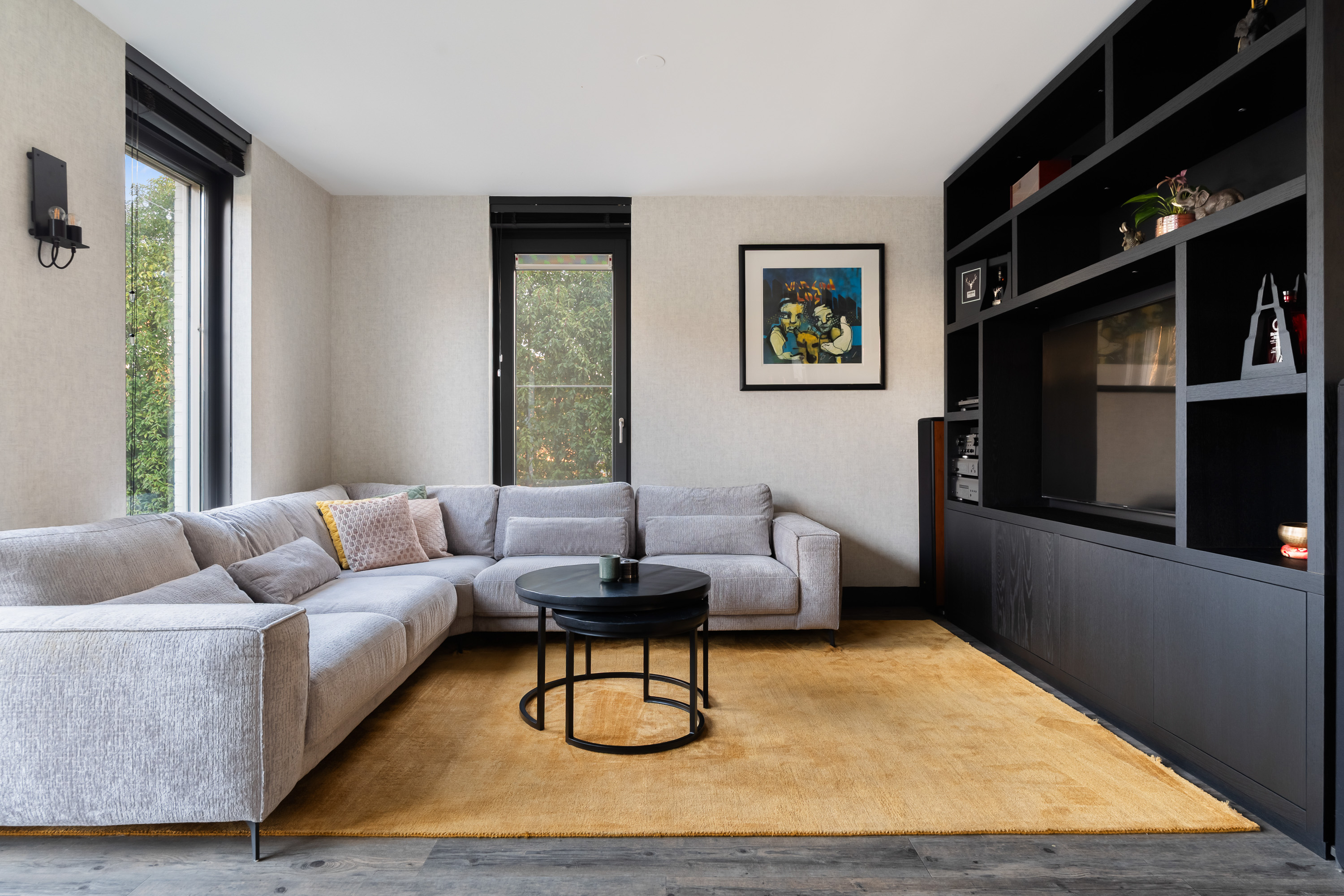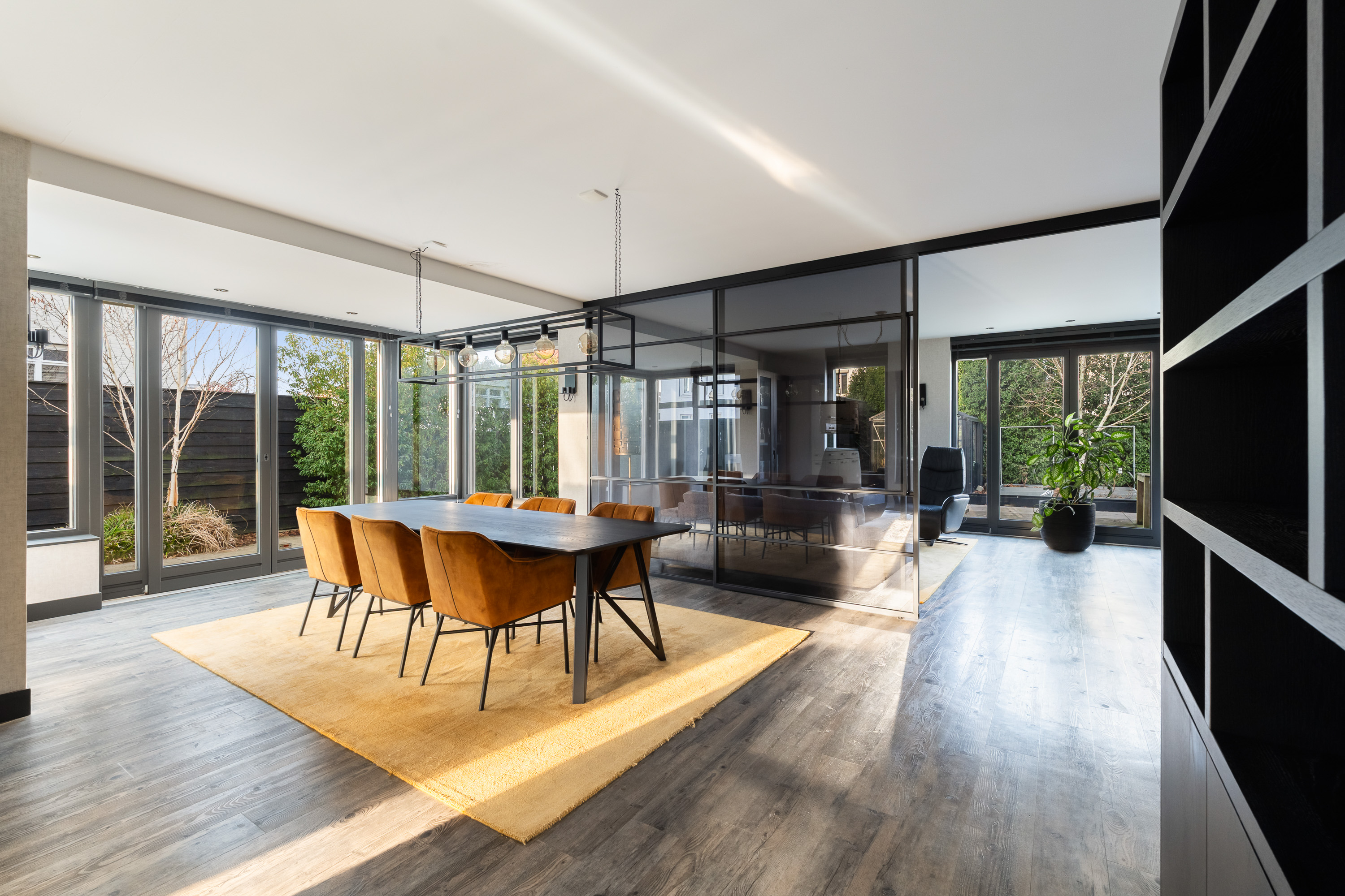 De woonkamer is royaal opgezet en heerlijk licht. Een absolute eyecatcher is de glazen schuifwand met gerookt glas, waarmee de woonkamer op stijlvolle wijze wordt gescheiden van de tv- en leeskamer. Deze wand biedt extra privacy zonder afbreuk te doen aan het open karakter van de leefruimte.
