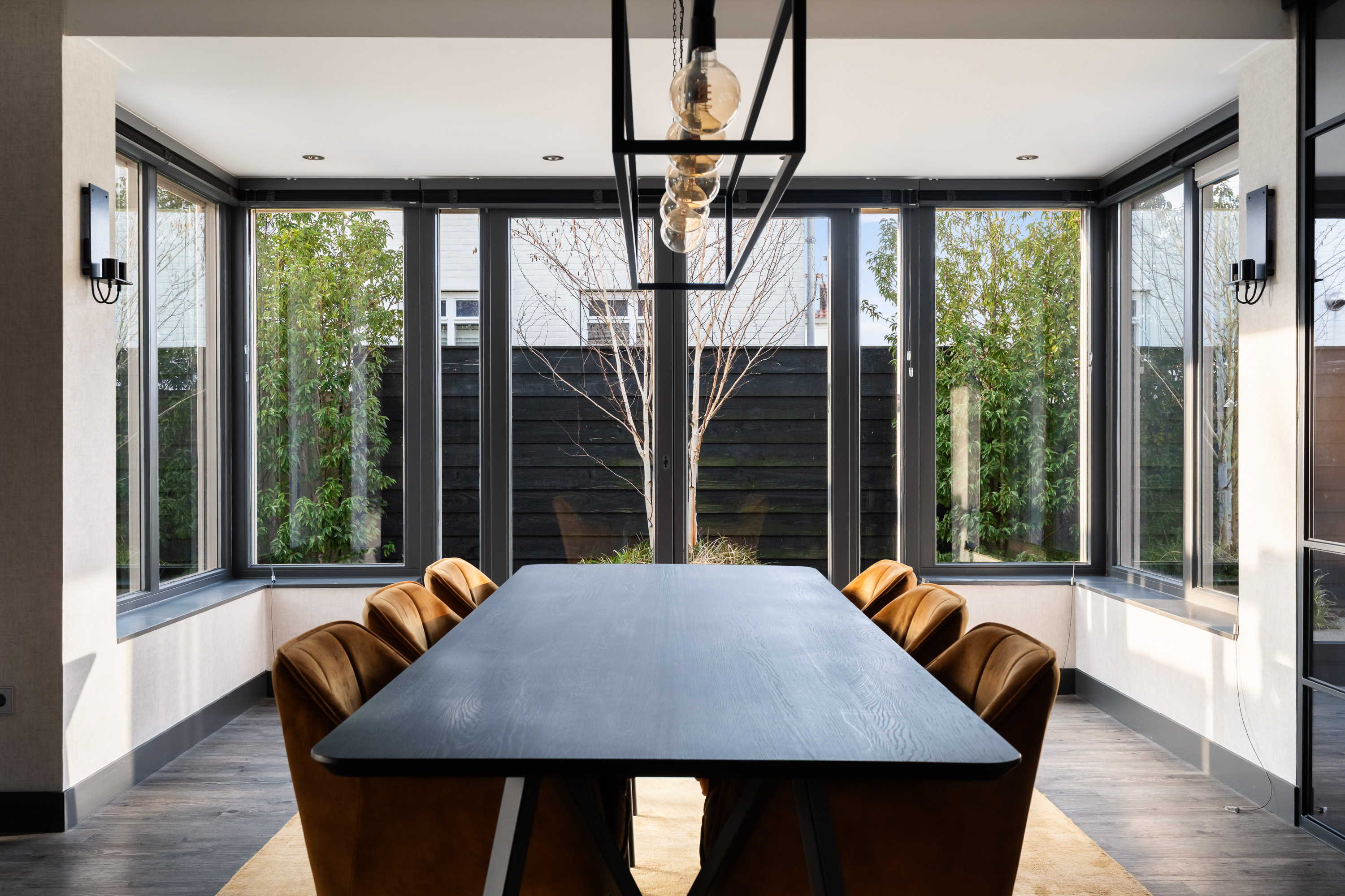 - Glazen schuifwand met gerookt glas tussen woon- en leeskamer