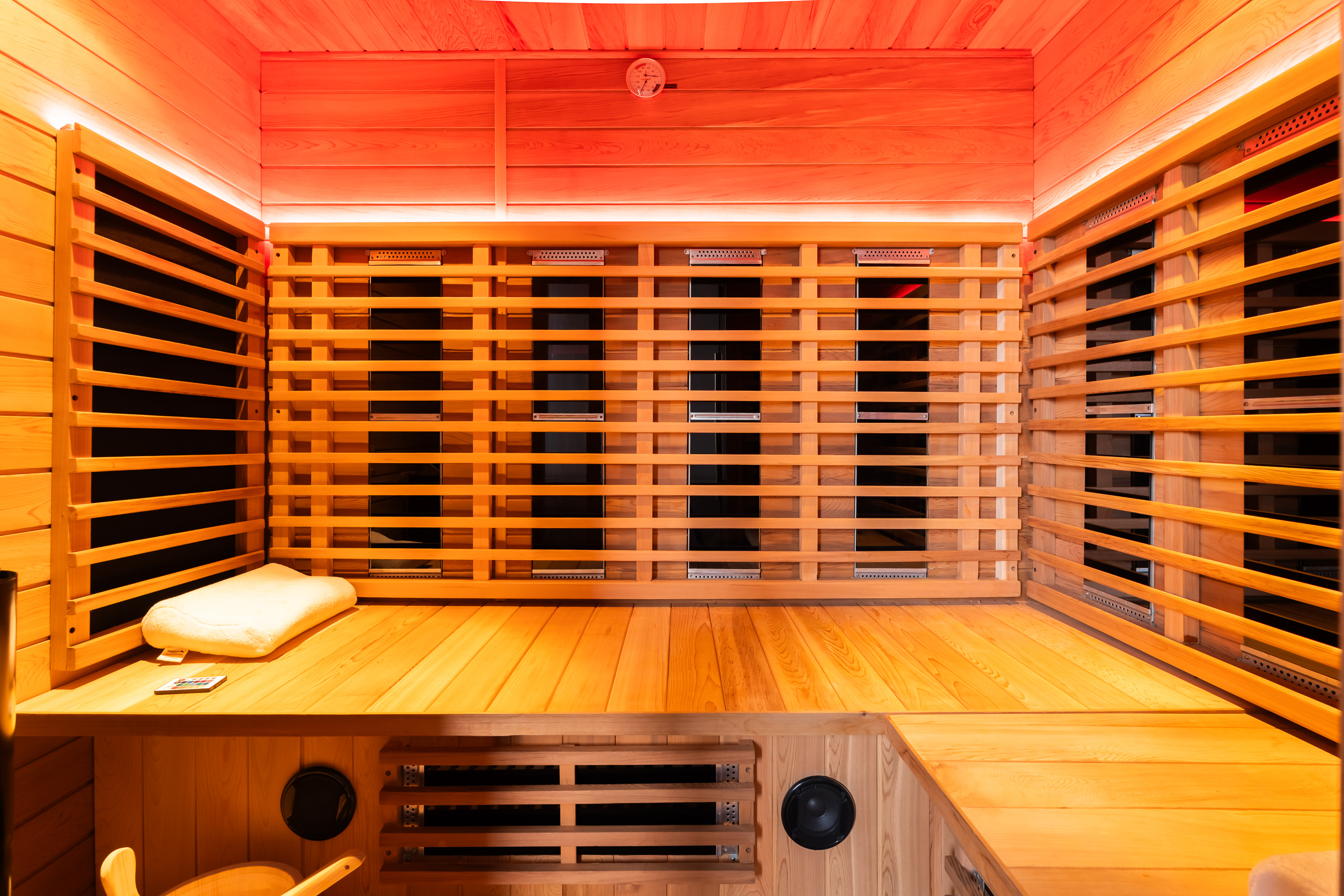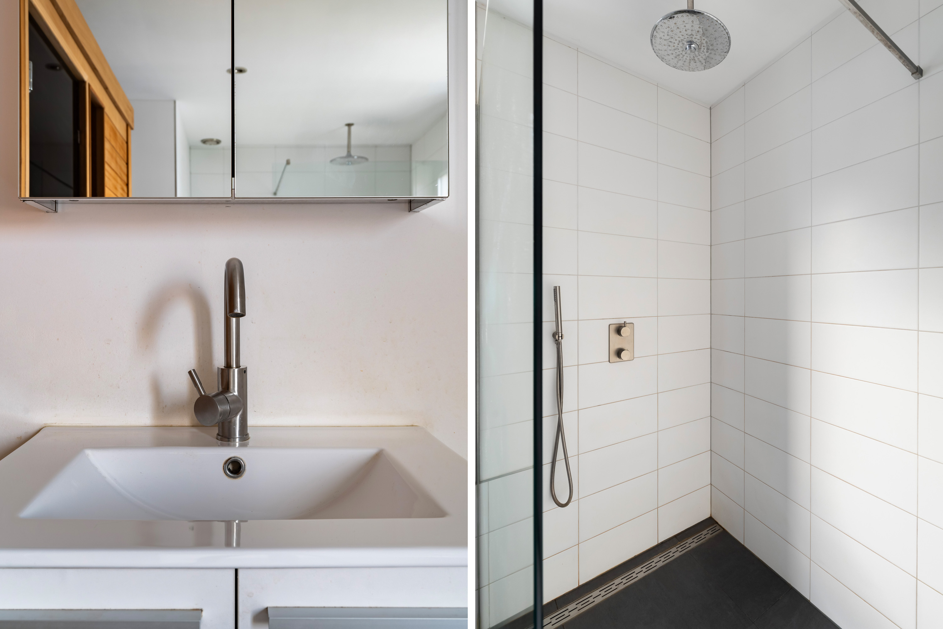 De badkamer is uitgevoerd als een luxe wellnessruimte. Je beschikt hier over een ligbad, een ruime inloopdouche met regendouche, een grote Finse sauna met infraroodfunctie en een wastafelmeubel met spiegelkast en extra opbergruimte. Een heerlijke plek om volledig tot rust te komen.