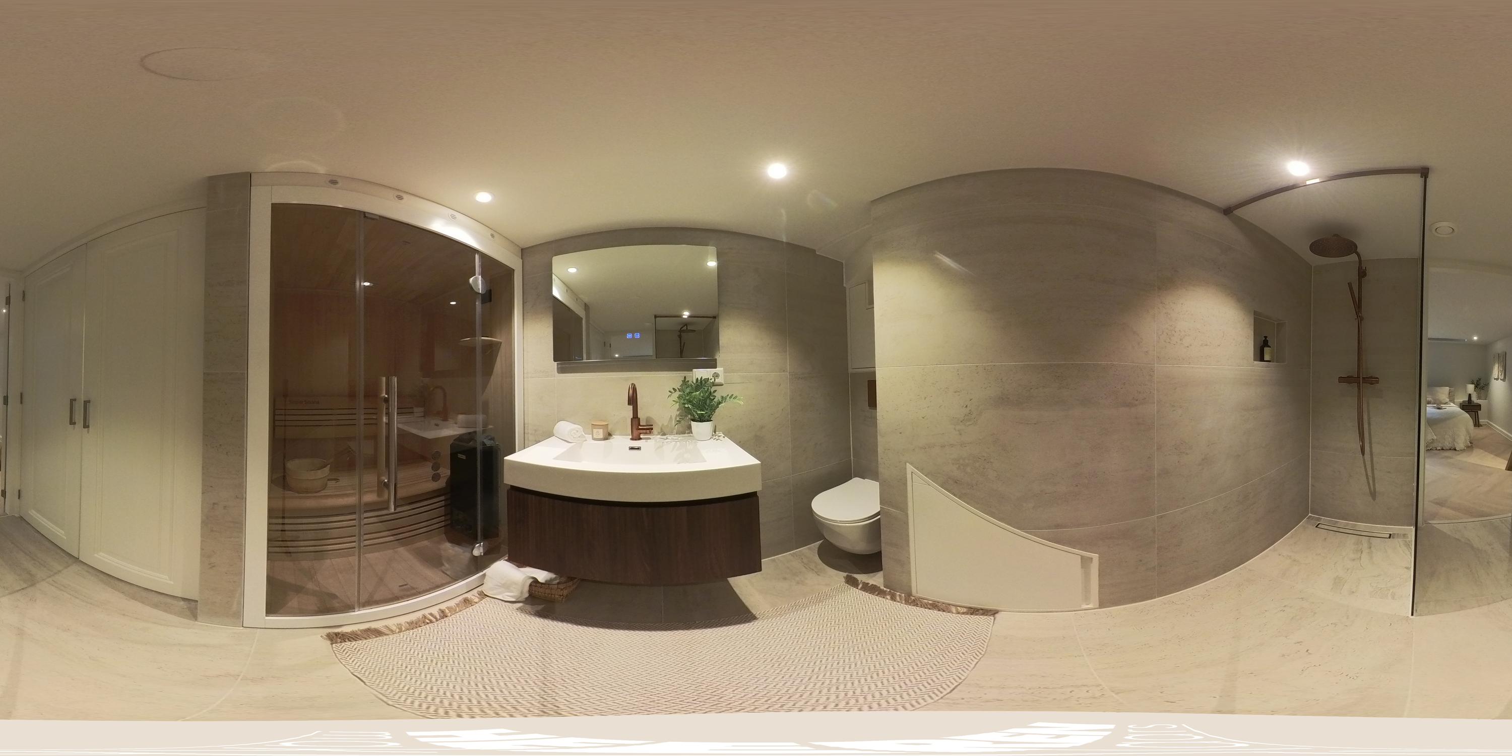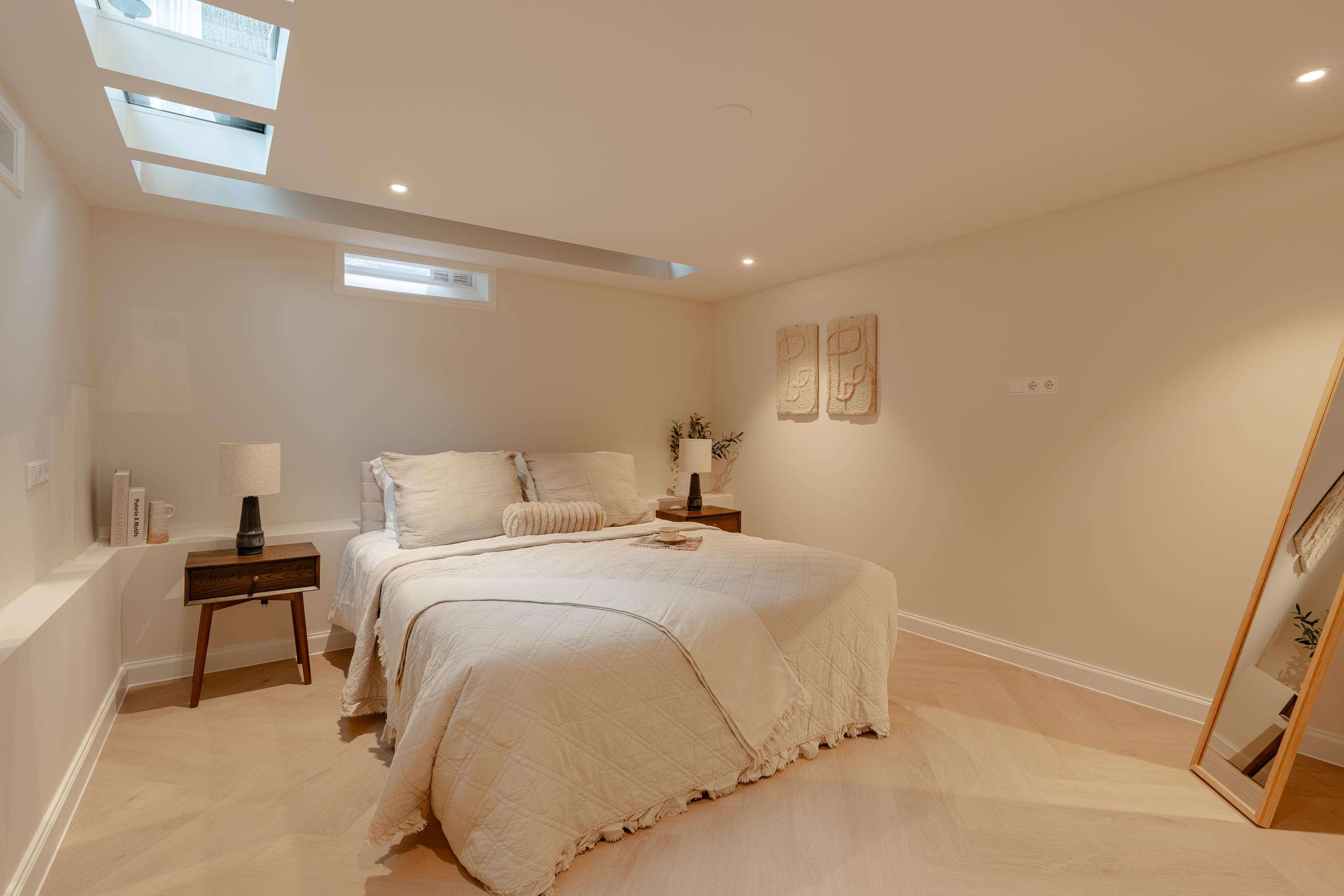 Middels de trap in de woonkamer bereikt u het souterrain. Dankzij de koekoeken is deze verdieping opvallend licht. Hier bevindt zich een ruime slaapkamer met een luxe ensuite badkamer, uitgerust met een inloopdouche, wastafel, toilet en een sauna. De rustige en intieme sfeer maakt dit een ideale ruimte voor gasten of als privé retreat.